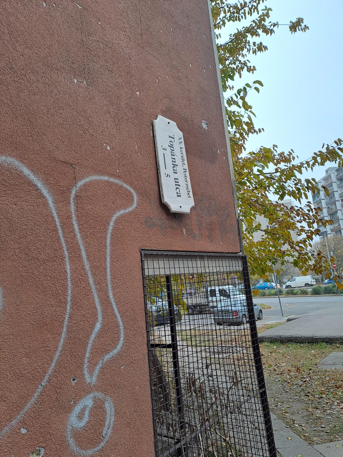 XX. kerület Topánka utca 3. házfalon félig leszakadt az utcanévtábla.