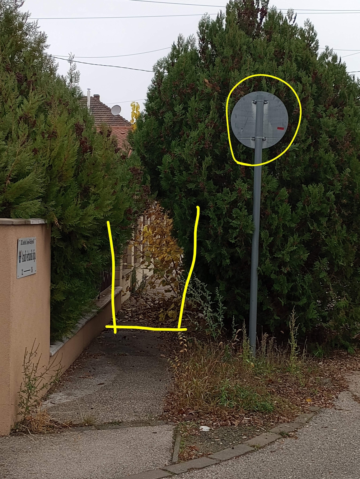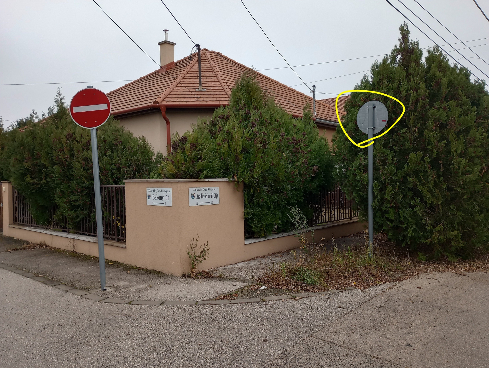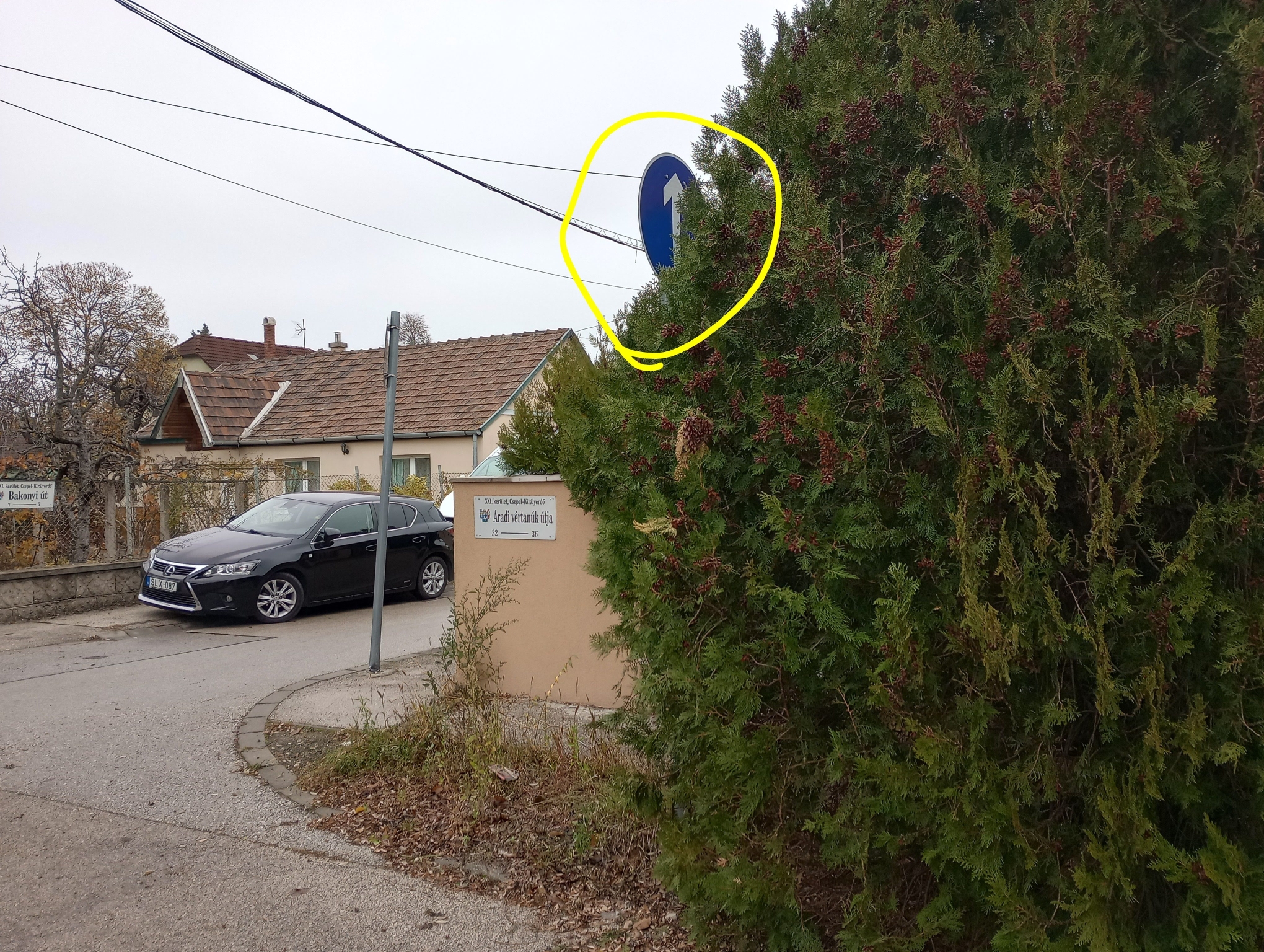 Csepelen az Aradi Vértanúk útja és a Bakonyi utca kereszteződésében lévő kötelező haladási irány táblát teljesen eltakarja az út menti bokor. Valójában még a járdán is elég bajos közlekedni azon a szakaszon (ez az utolsó képen látható). A tábla rejtettsége miatt az elsőbbségadási helyzet is kevésbé egyértelmű, volt is már itt emiatt baleset.