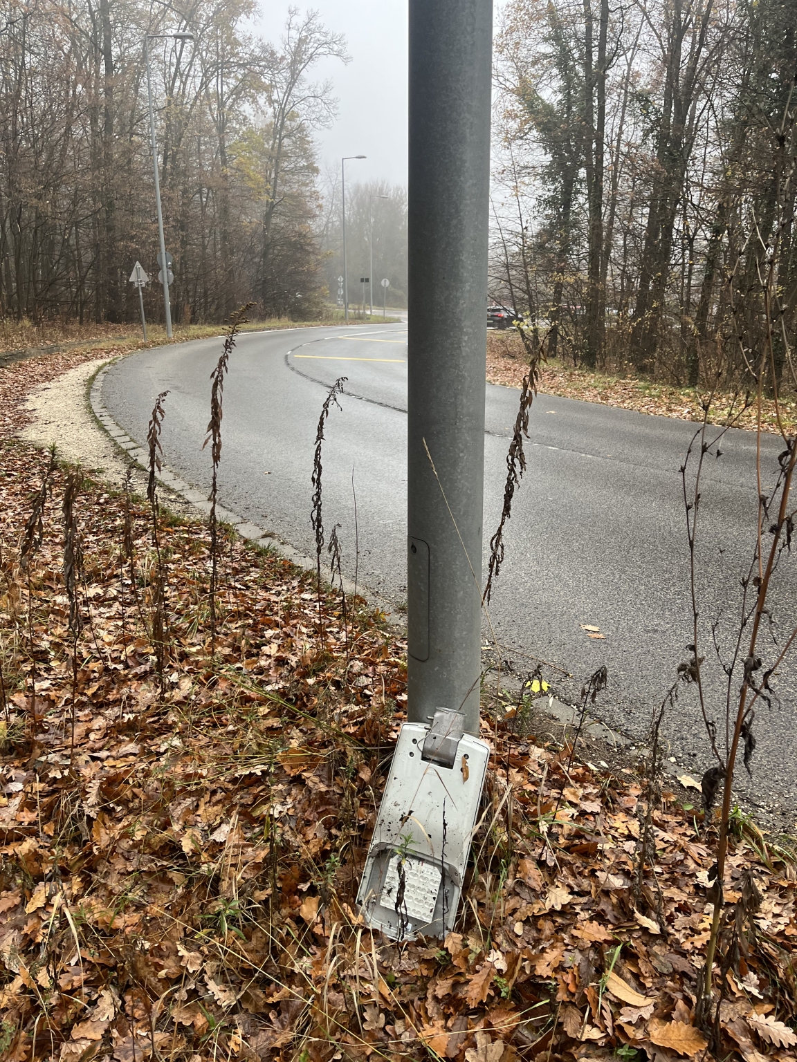 Van egy leesett, elhagyott közúti lámpatest a Szépjuhászné út mellett.