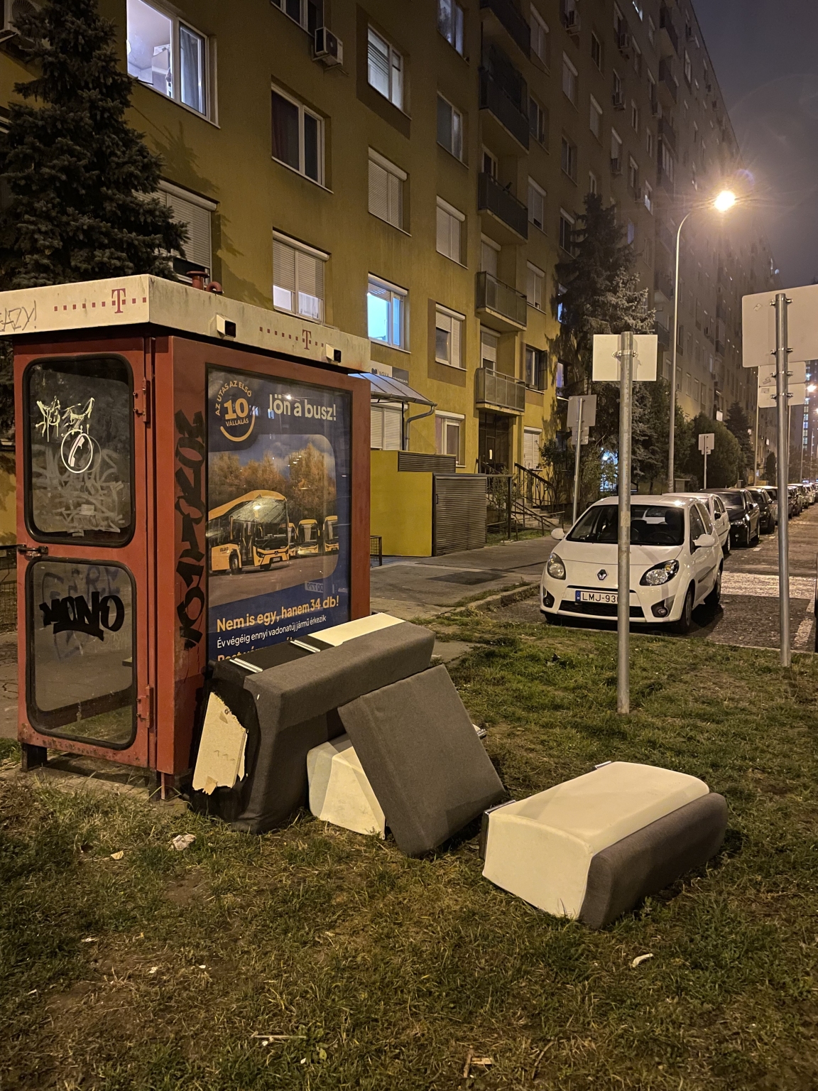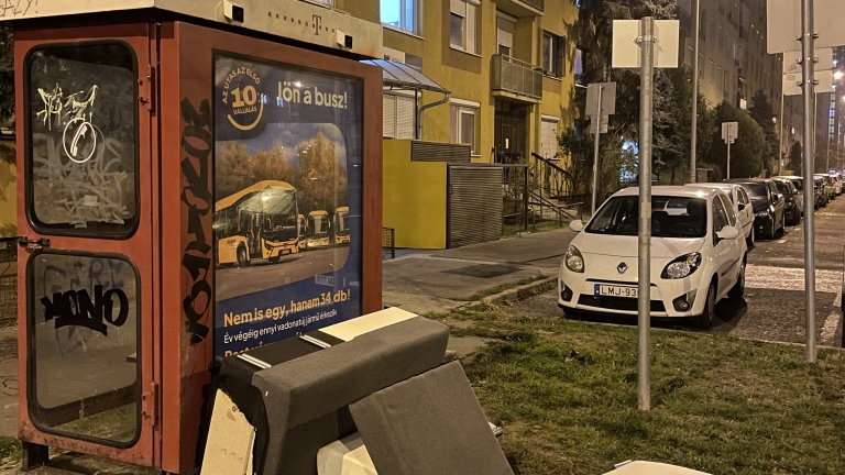 Szemet a buszvegallomason, a telefonfulke mellett.