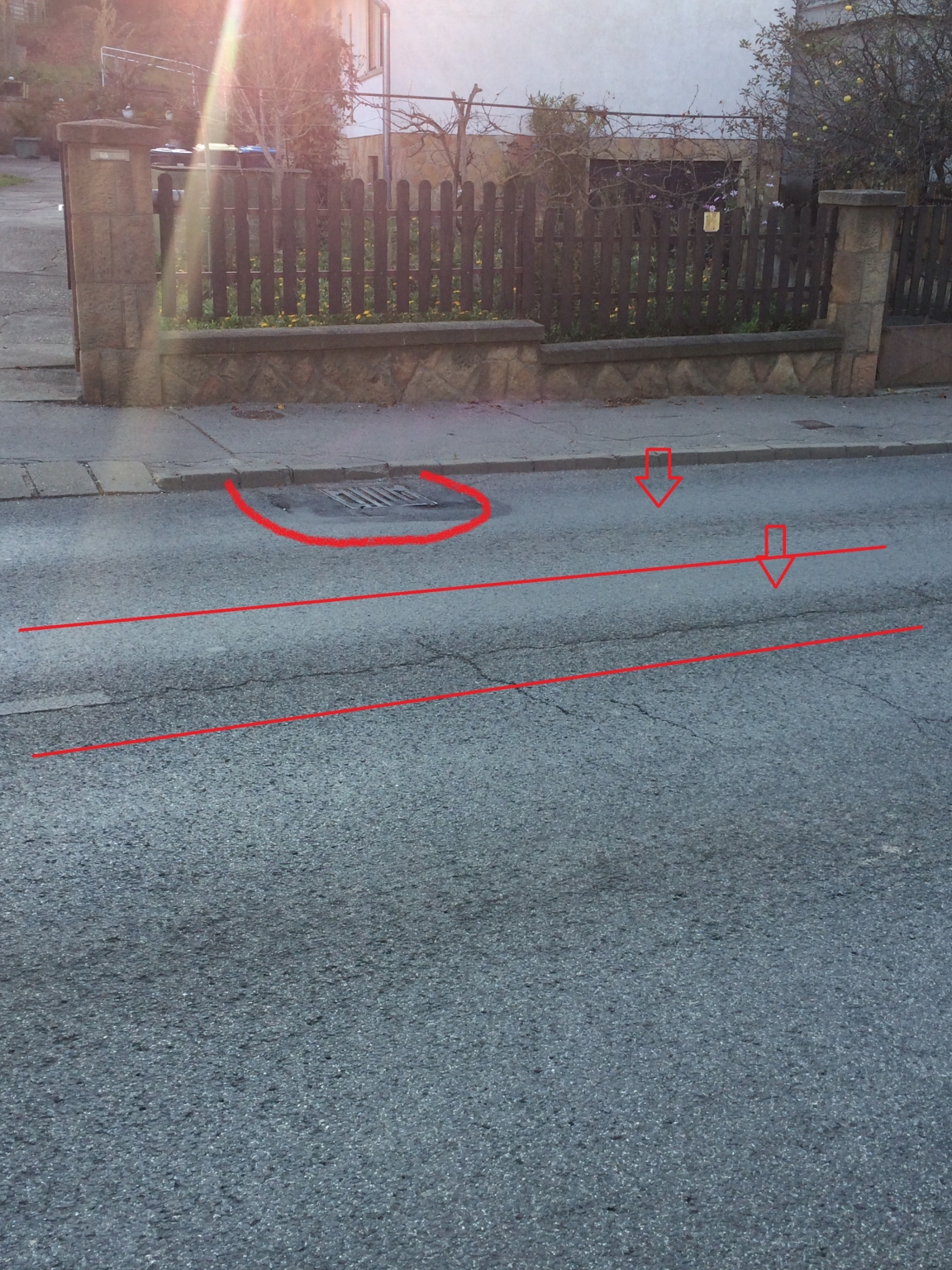 Jelzett helyszínen lévő lefolyó mellett repedezett, süllyedt lett az út, a korábbi javítás már teljesen tönkrement. Reng minden, mikor belemegy a busz. Ezen kívül kezd erősen nyomvályússá válni az útszakasz, vélhetően szintén a buszforgalom miatt.