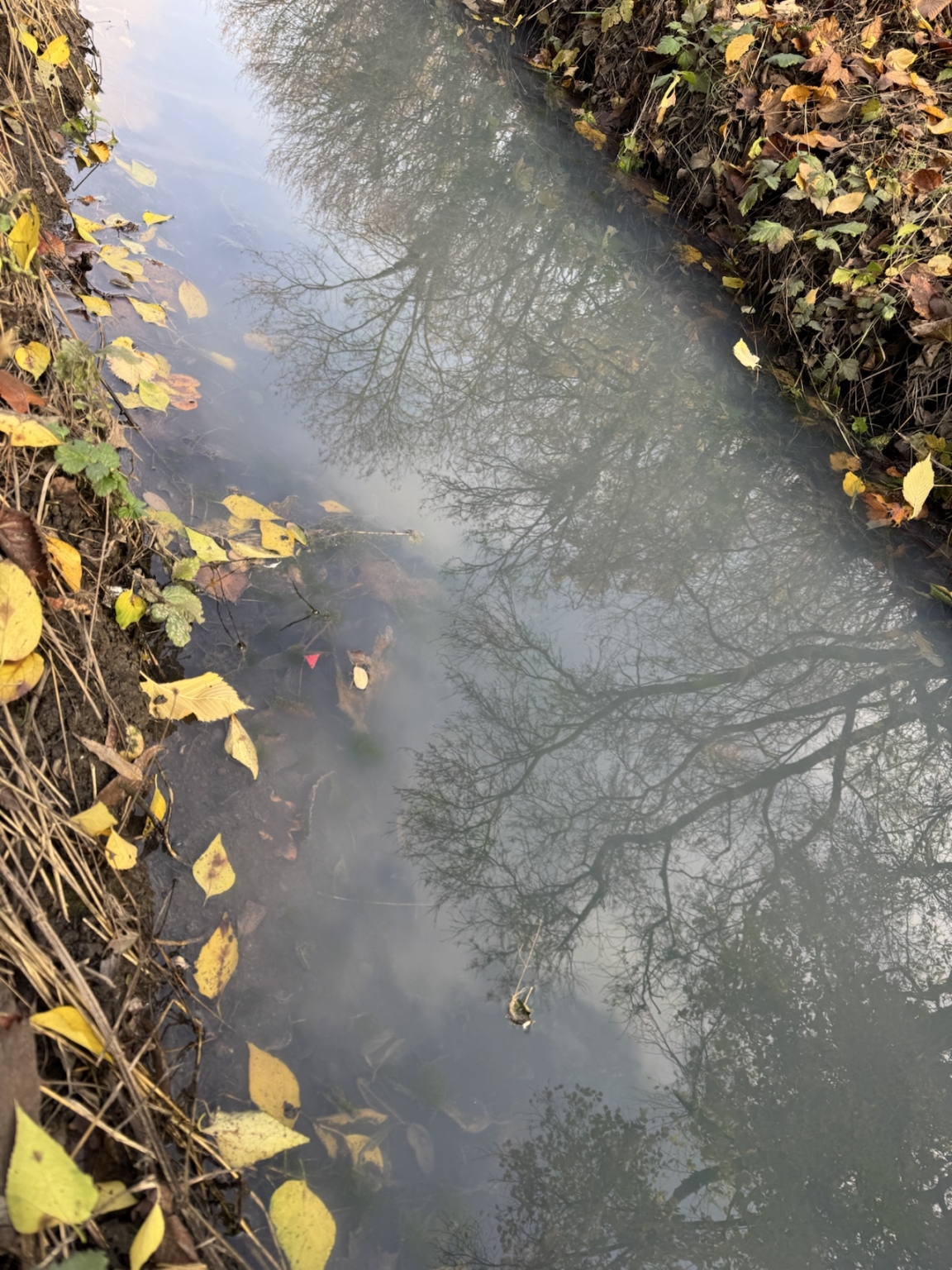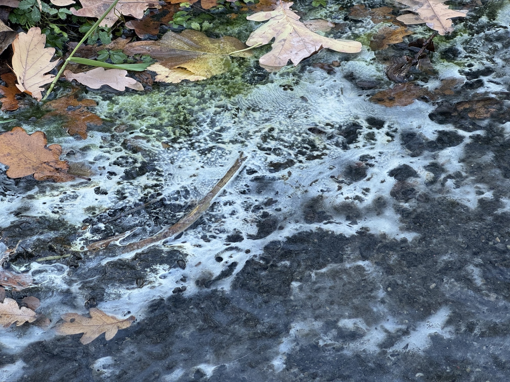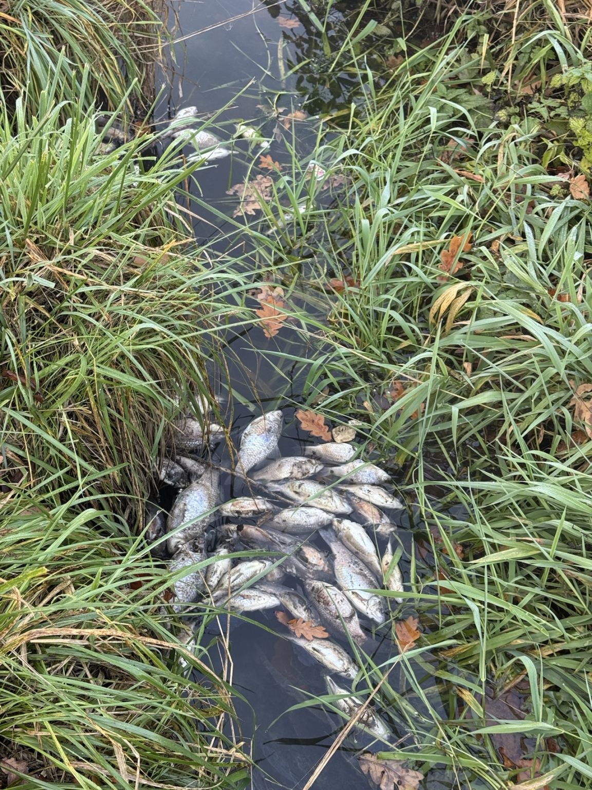 A csatolt képek a 2025.11.09.-én tapasztalt halpusztulást, a meder alján a fehér nyálkás üledéket, vizet, valamint a mai napon még élő, koi-szerű halat mutatják.