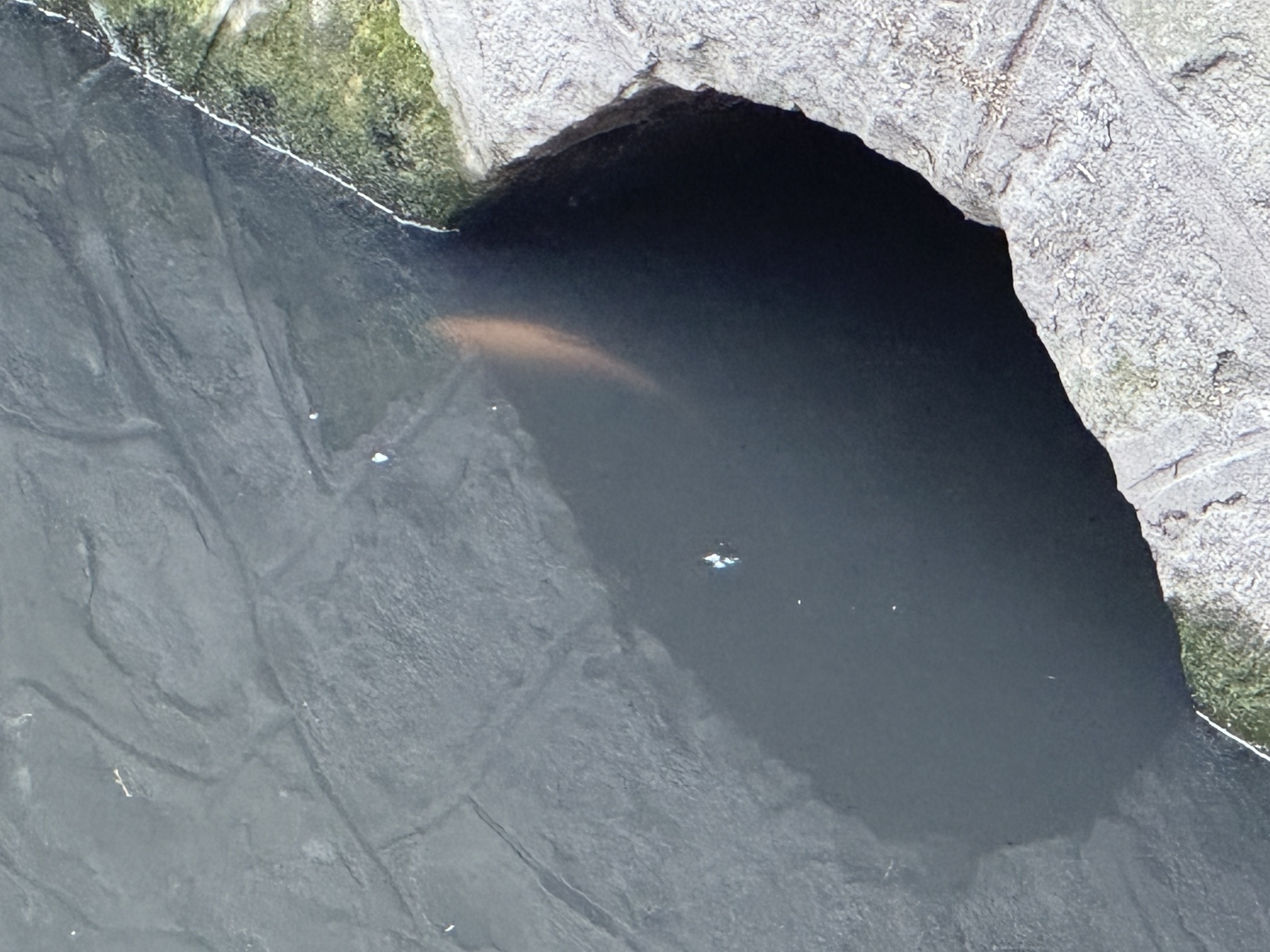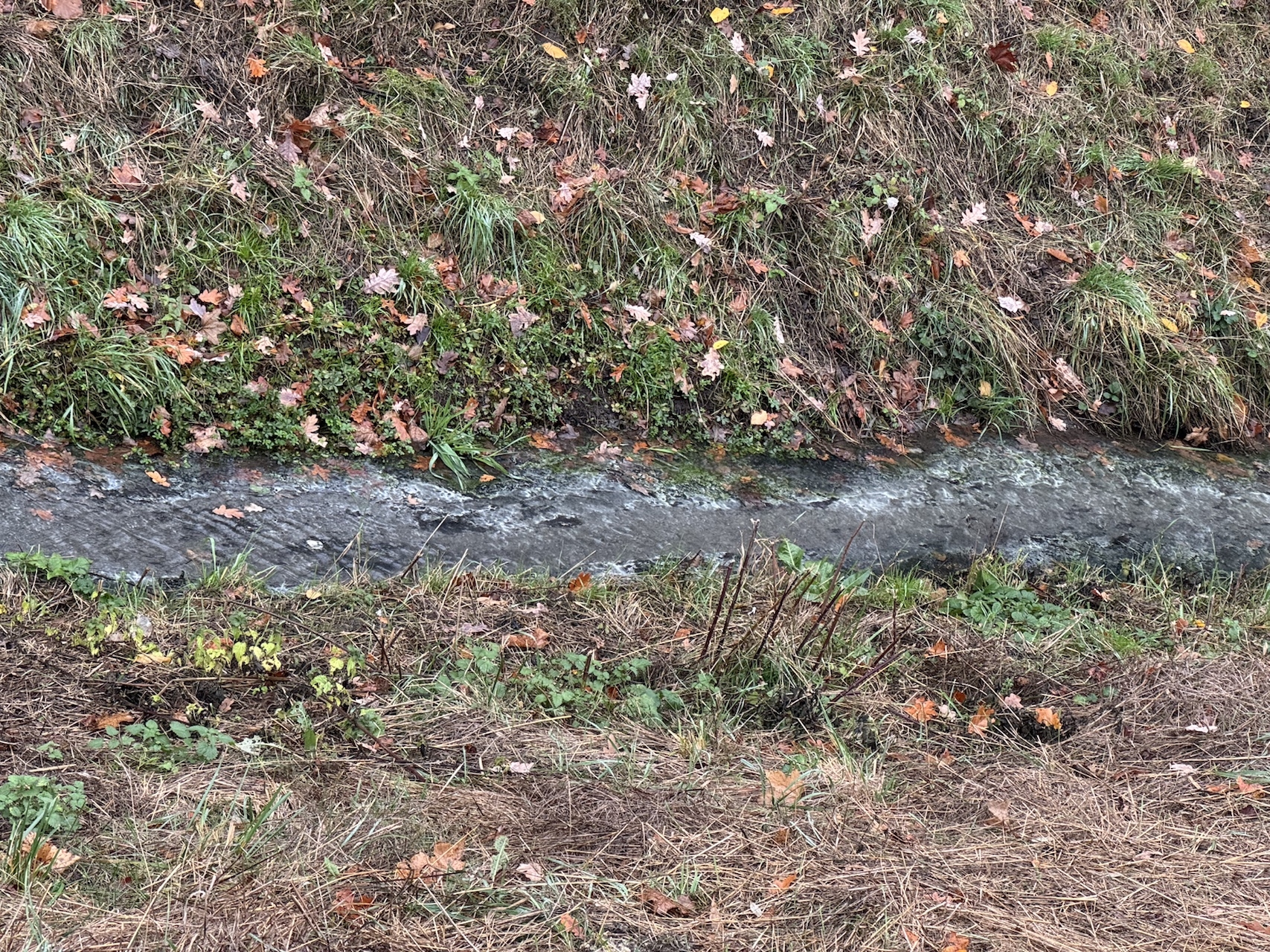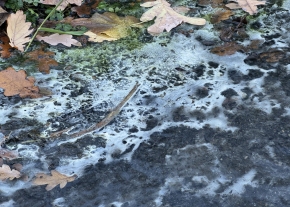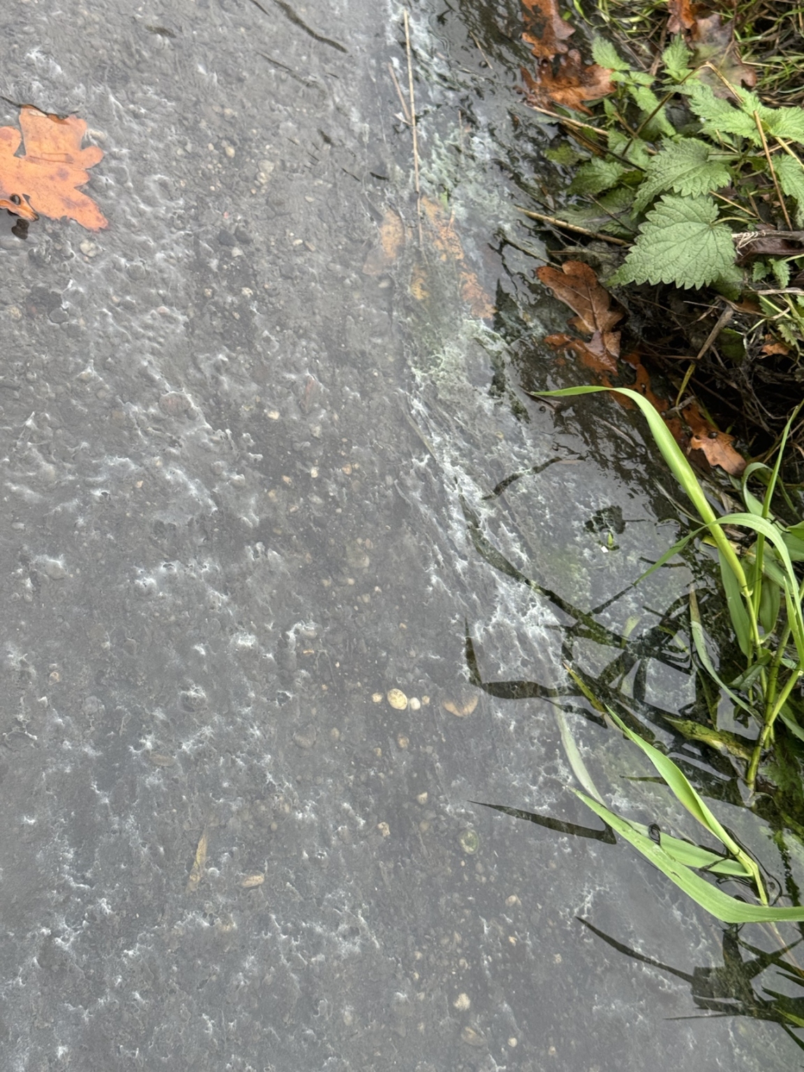 A csatolt képek a 2025.11.09.-én tapasztalt halpusztulást, a meder alján a fehér nyálkás üledéket, vizet, valamint a mai napon még élő, koi-szerű halat mutatják.