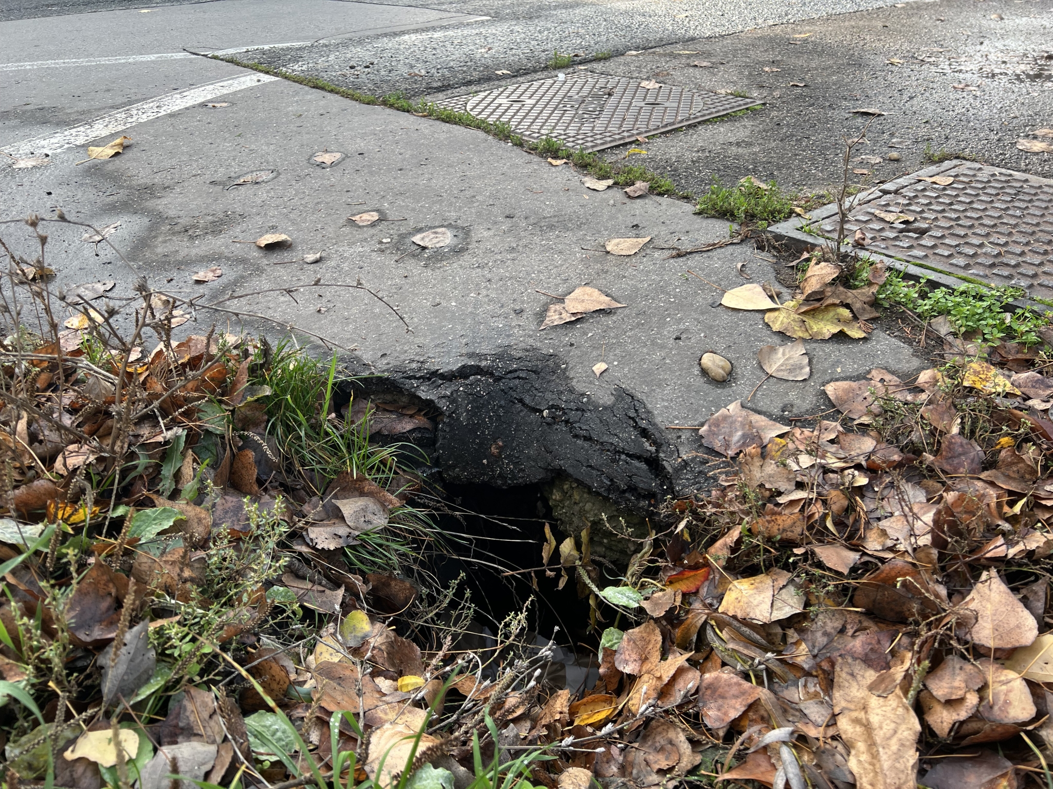 Mély gödör és gondozatlan terület. Az ápolatlan, gazos növényzetben megbújik egy hatalmas és mély gödör. Alámoshatta az aszfaltot a víz.