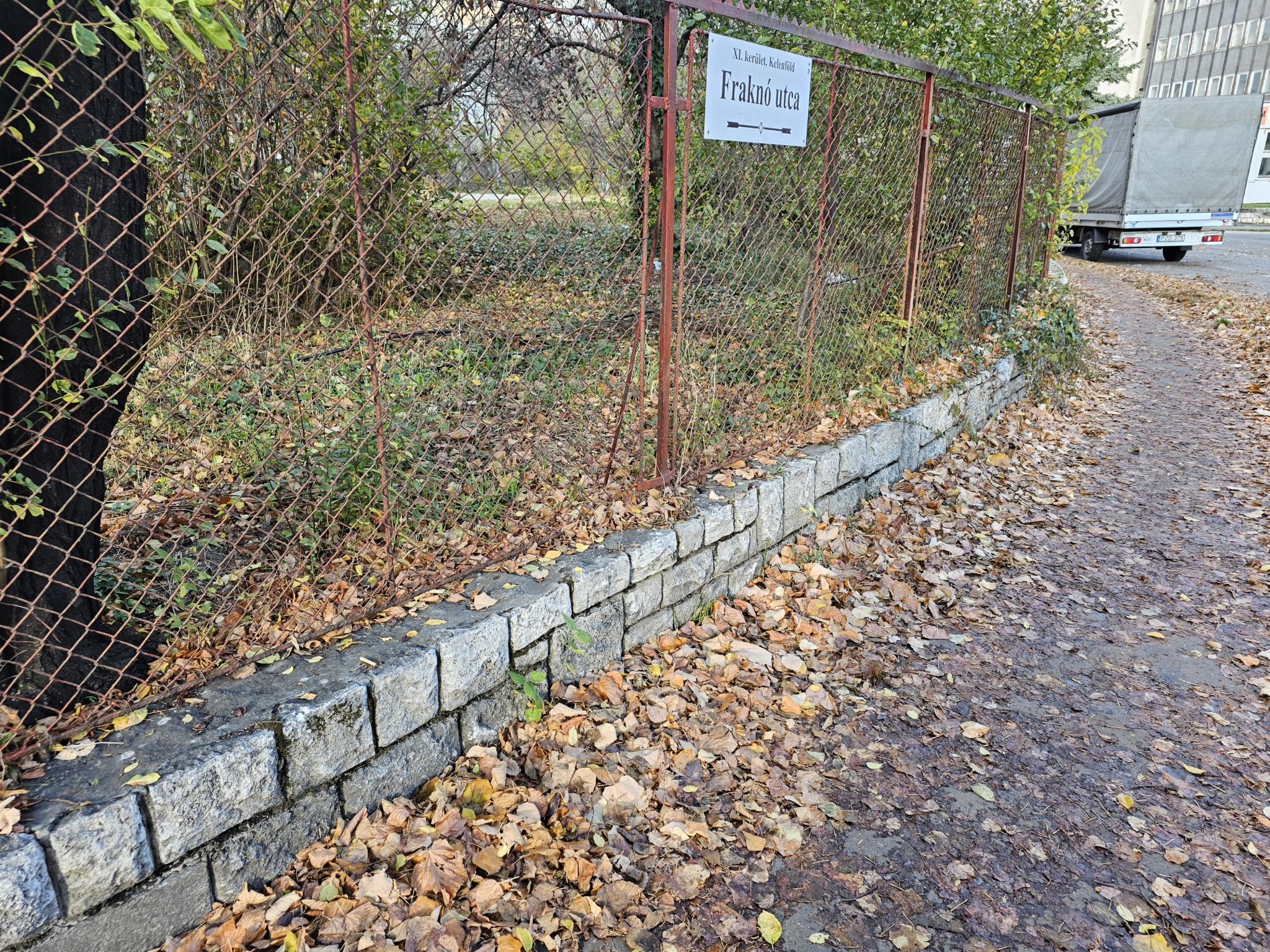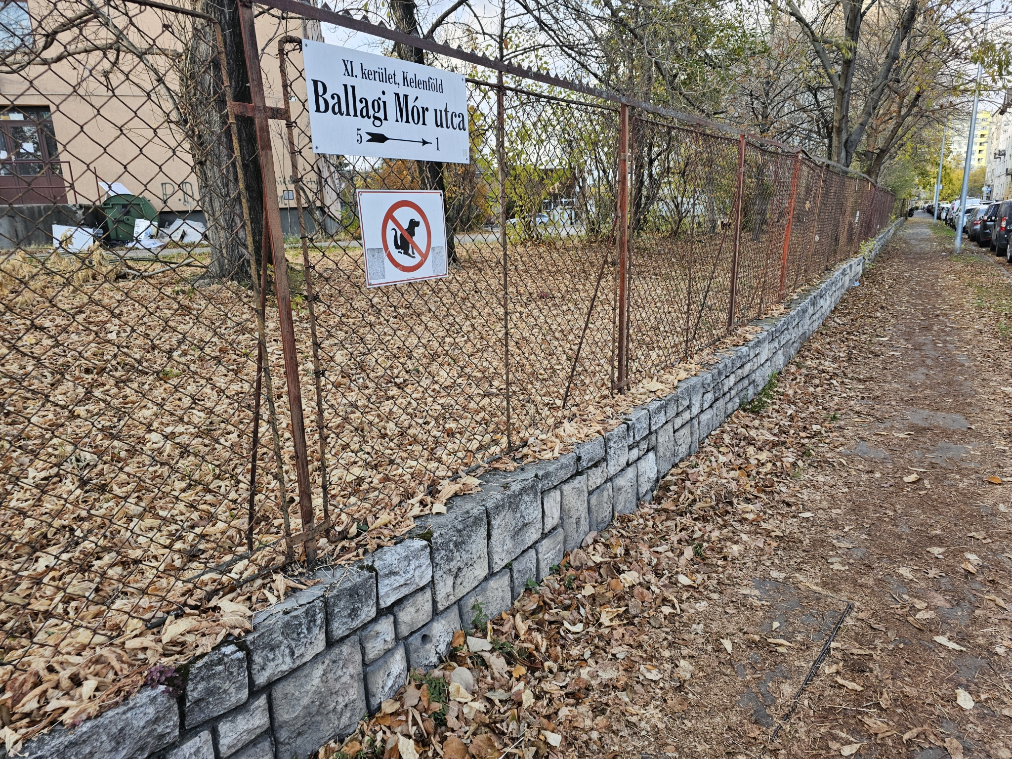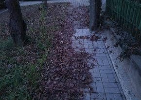 Az Fraknó-Ballagi Mór utca sarkán, a XI-ker-i közterület felügyelettel szemben a saroktelek egészén, nincs takarítva a járda. Vastagon áll rajta nyálkás, csúszós avar.