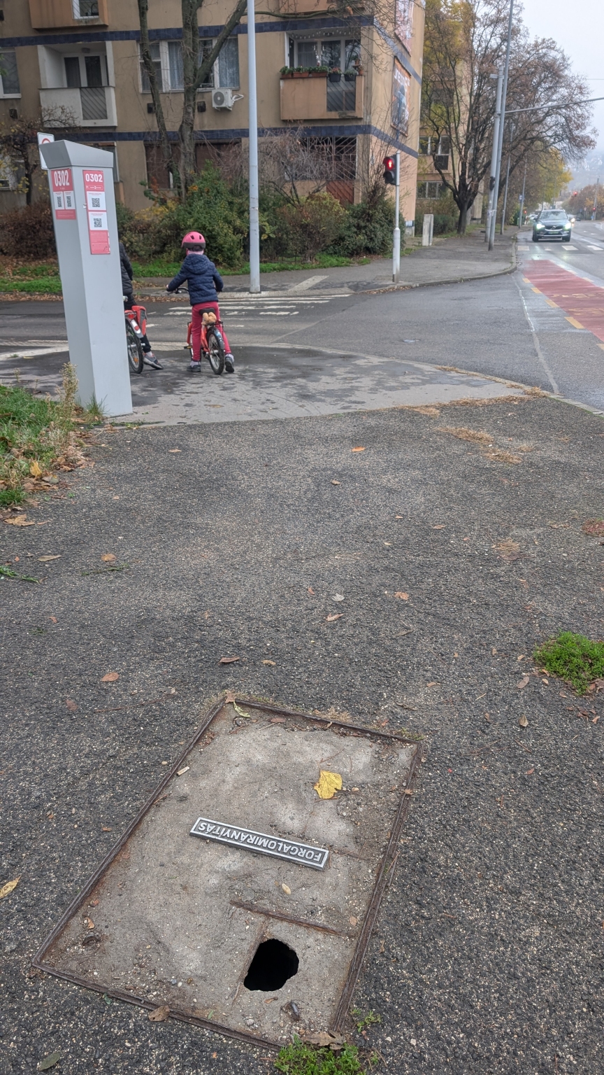 A Bogdáni út - Kerék u. kereszteződésnél egy forgalomtechnikai közmű fedlap lyukas.