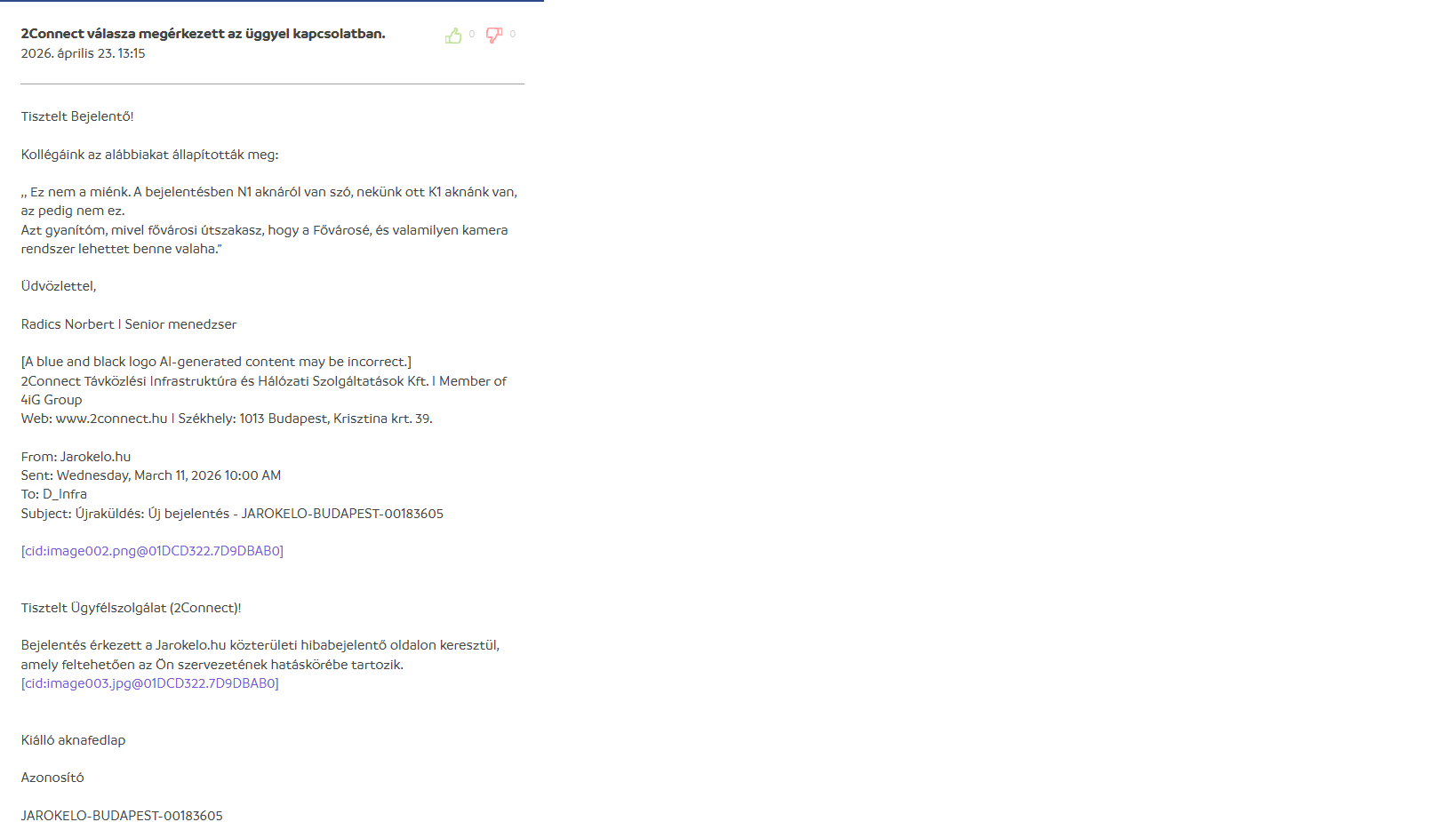 „A XIII. ker. Váci út 28 . előtt a járdából kiálló fedlapot nem a Társaságunk üzemelteti.”