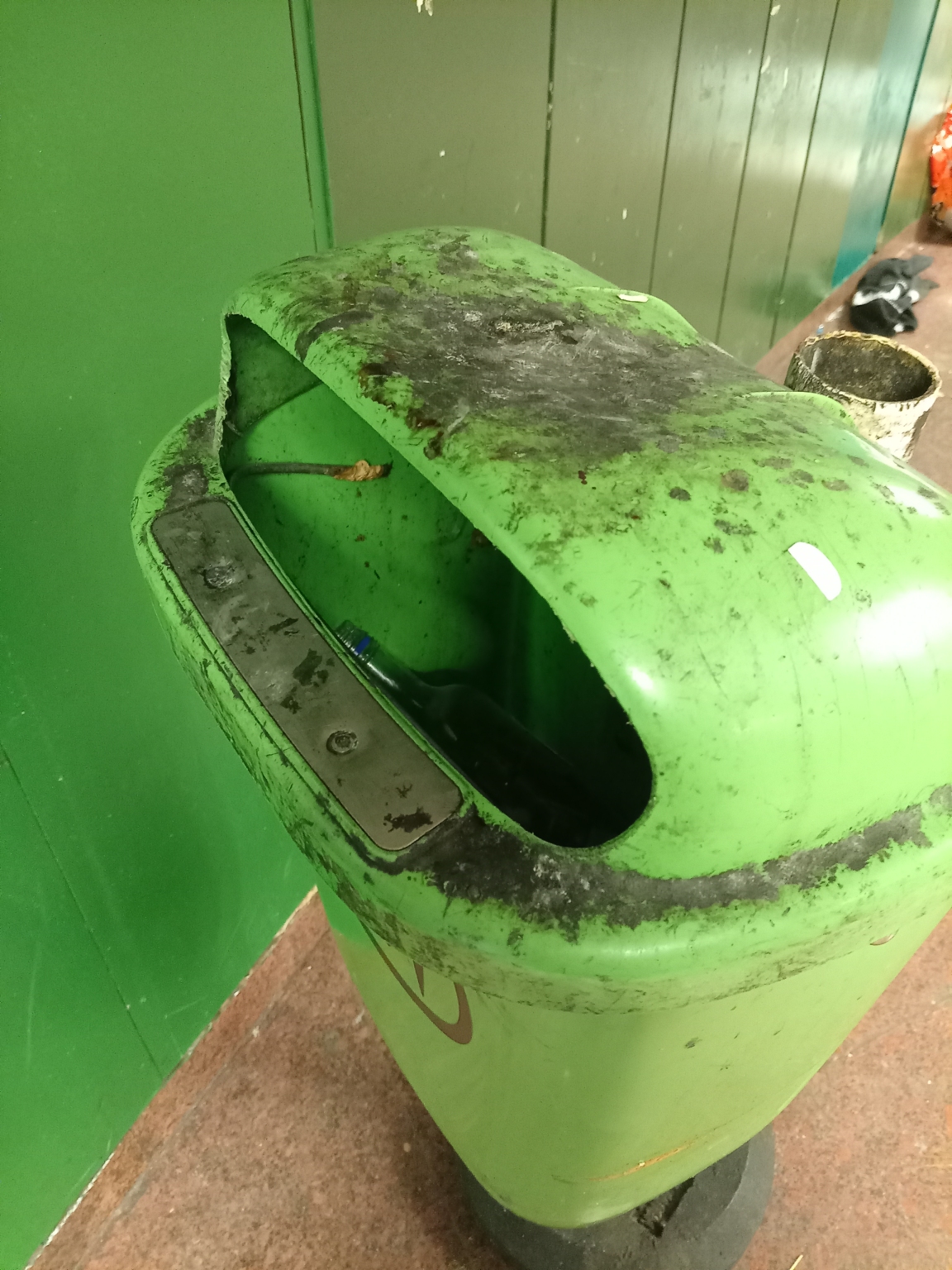 Népliget aluljáróban a buszpályaudvar felé kirakott zöld színű utcai szemetes nagyon rossz állapotú és koszos.