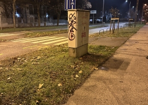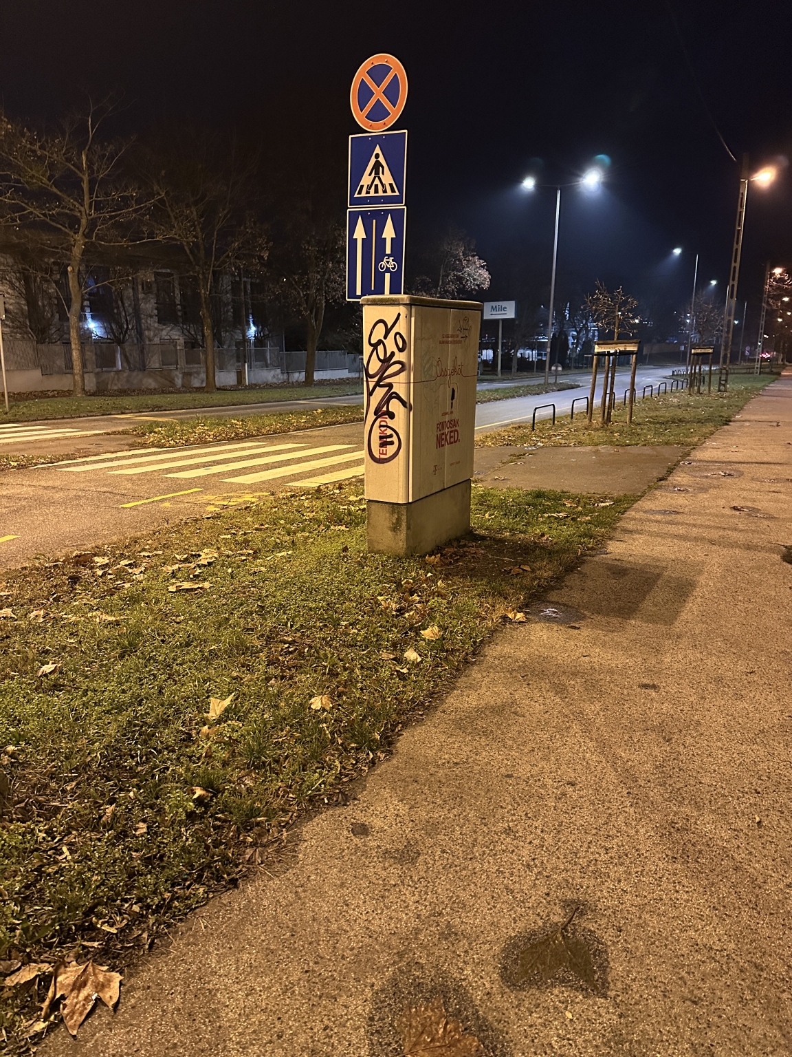 A Budapest X. kerület, Mádi utca 54. számú ingatlan előtt a Telekom telekommunikációs szekrényének töv...