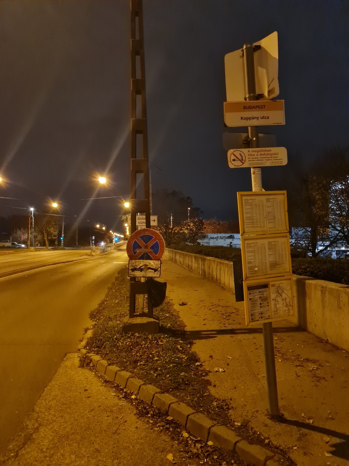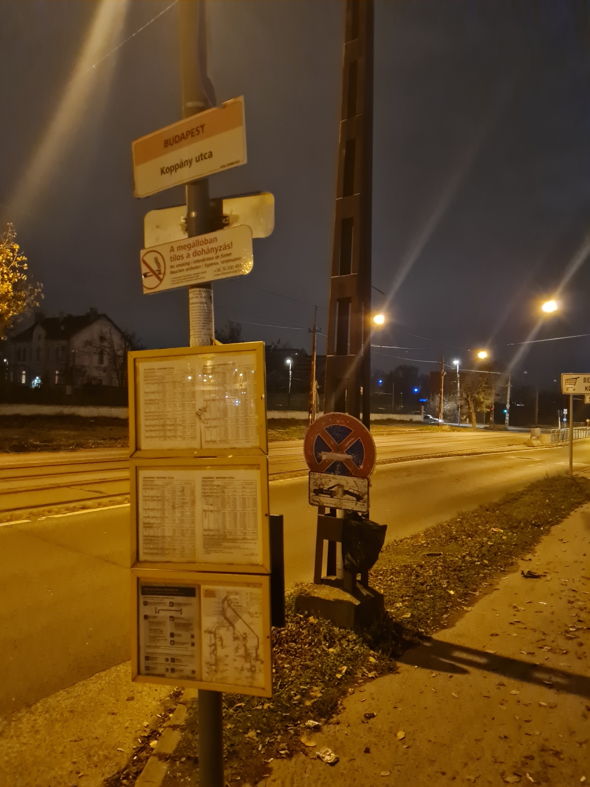 A Koppány utcai buszmegálló előtt ez a tábla épp csak be van szúrva a villanyoszlopba. Mozdítható, ütött-kopott. Vajon helyileg itt kellene lennie?