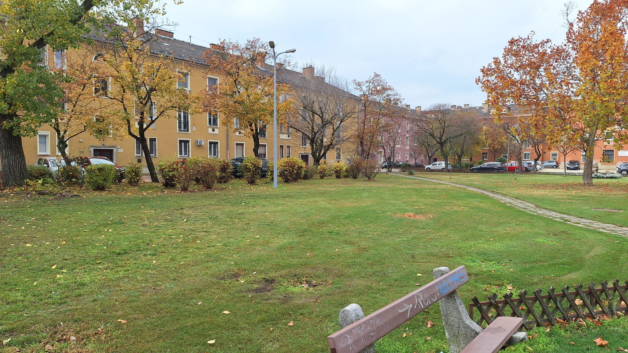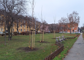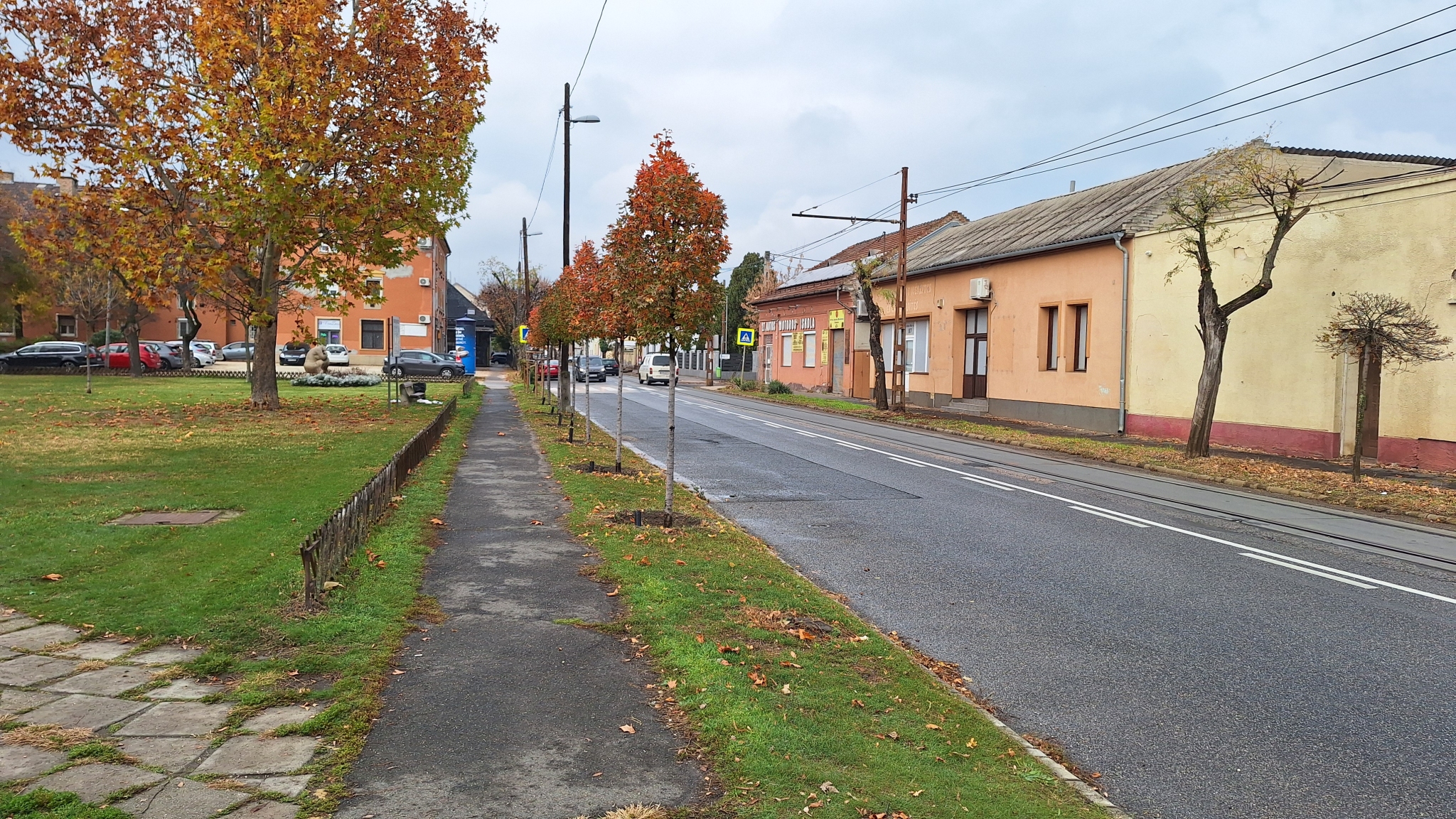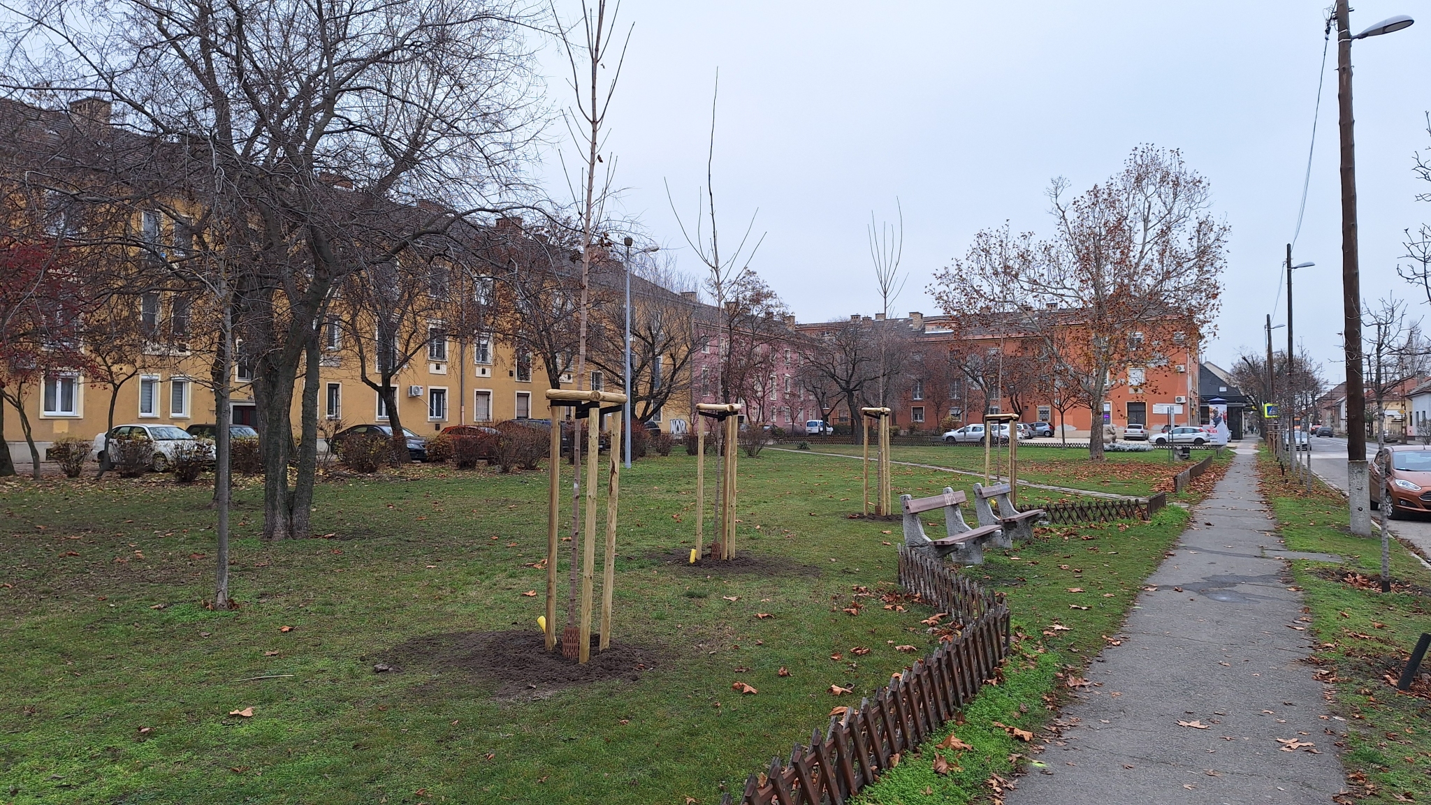 A Jókai Mór utca 88-90-el szemben az út szélén van egy régi fatuskó, illetve az itteni parkos területen facsemeték is hiányoznak.