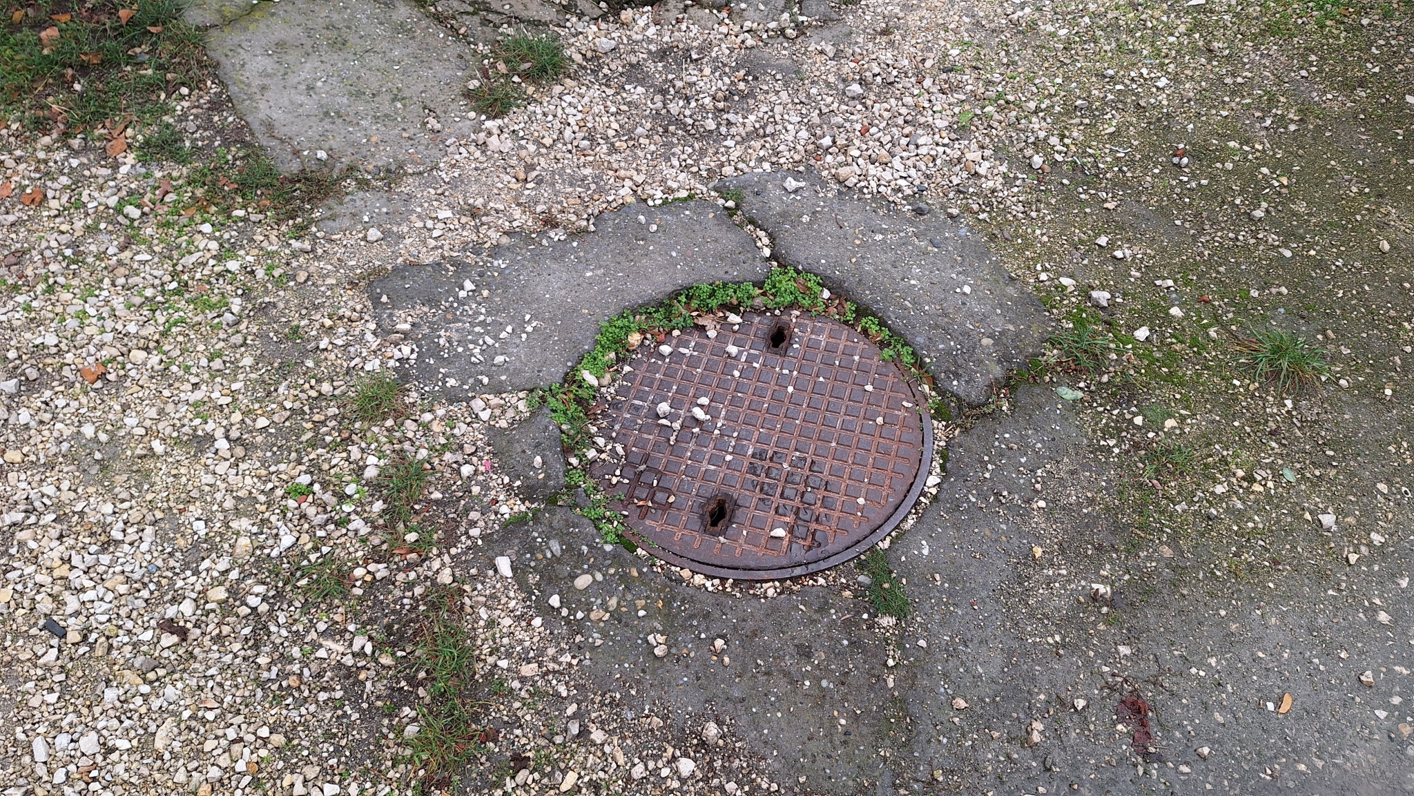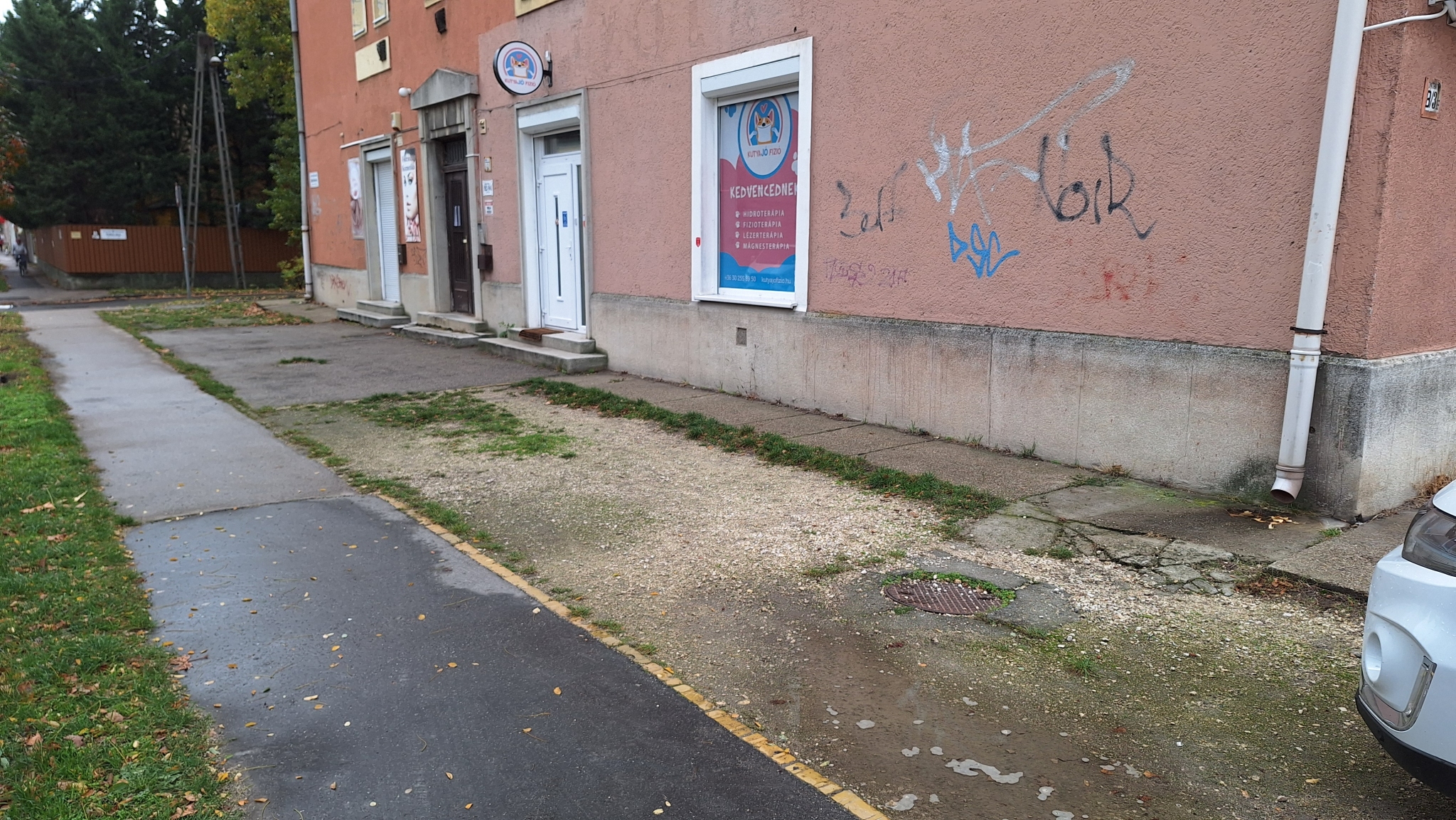 A Jókai Mór utca 94. előtti egyik csatornafedél láthatóan megsüllyedt, a körülötte lévő burkolat is sérült.