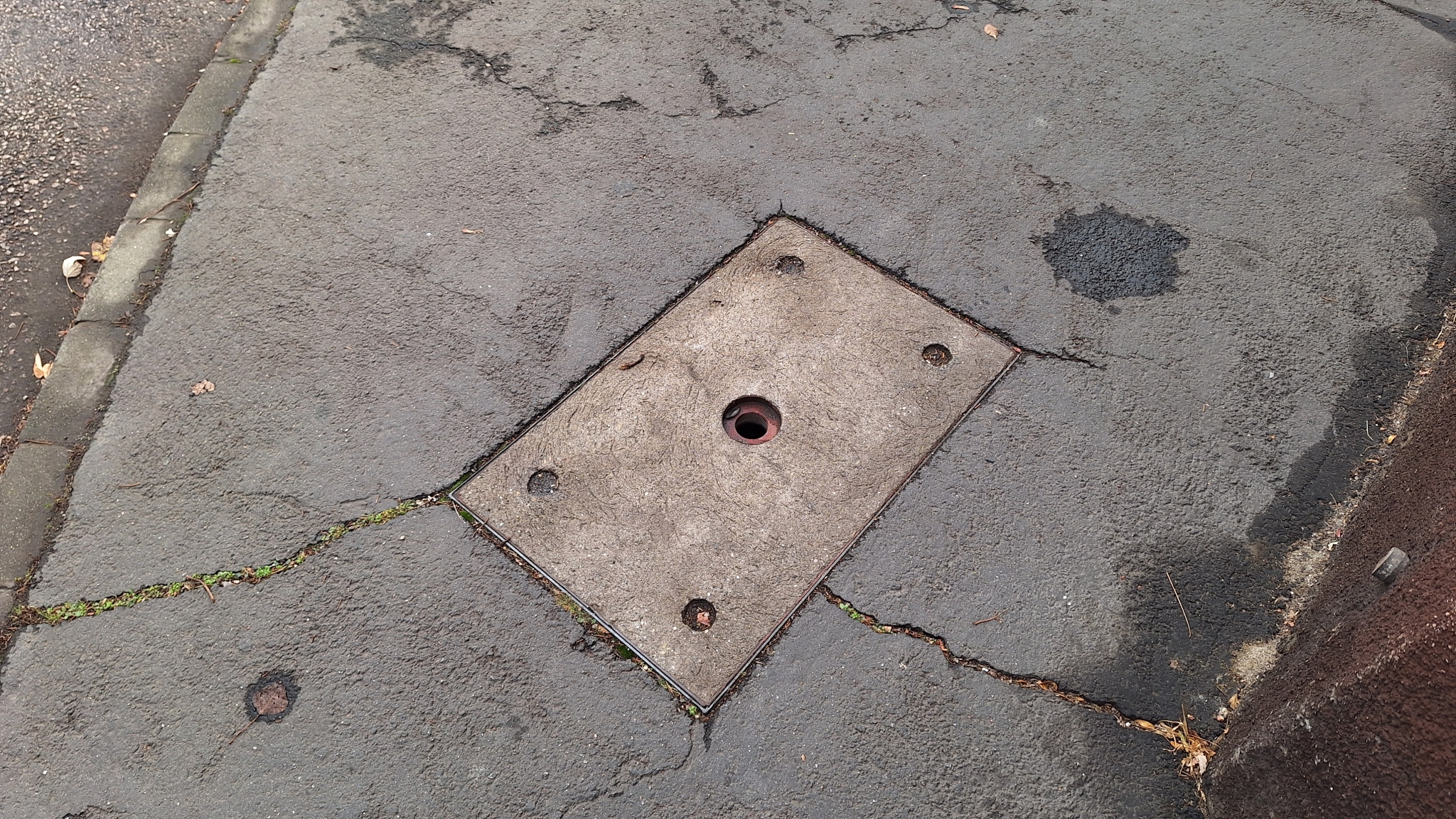 A Jókai Mór és Nagysándor József utca sarkánál van egy lyukas aknafedél.