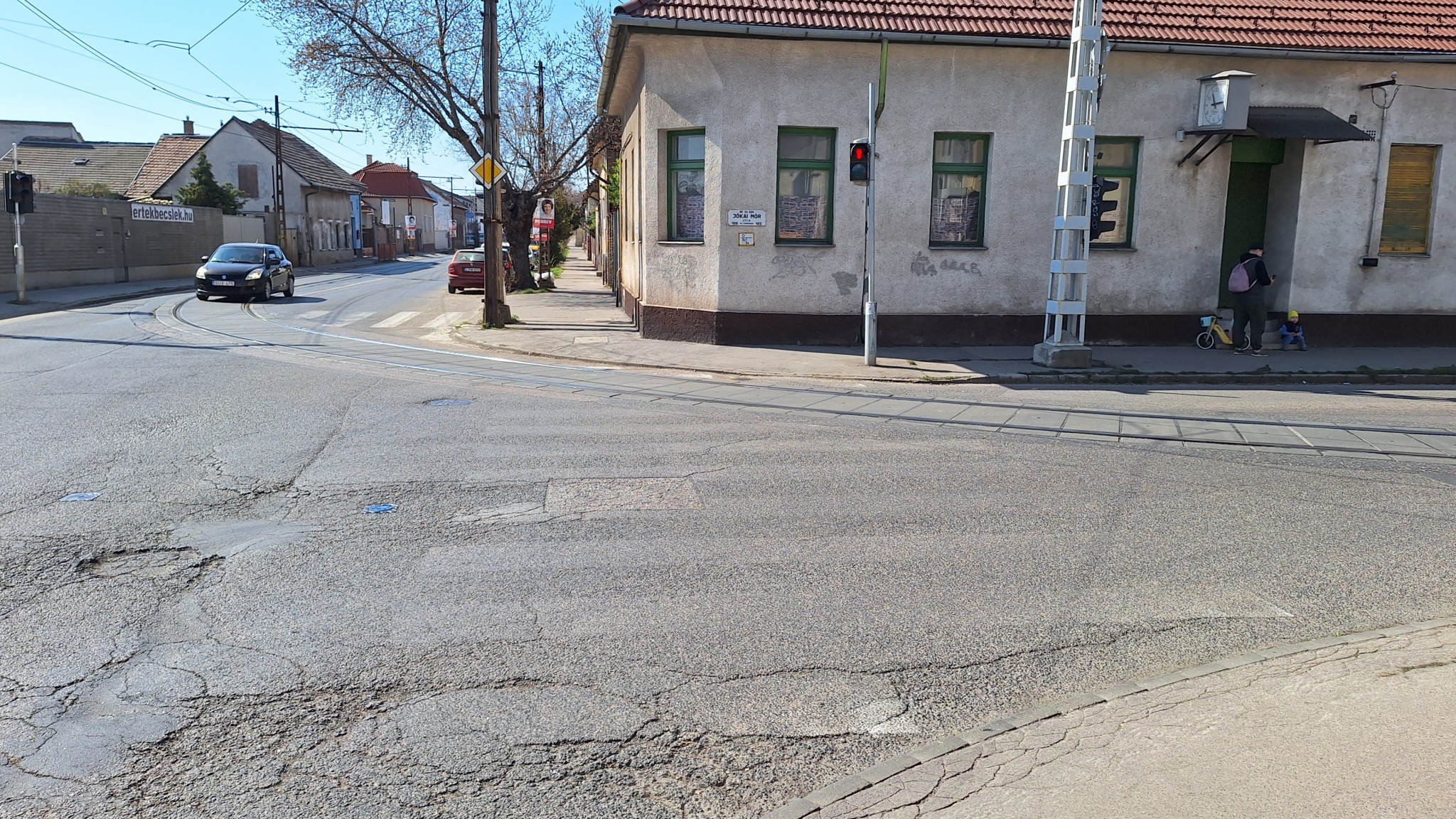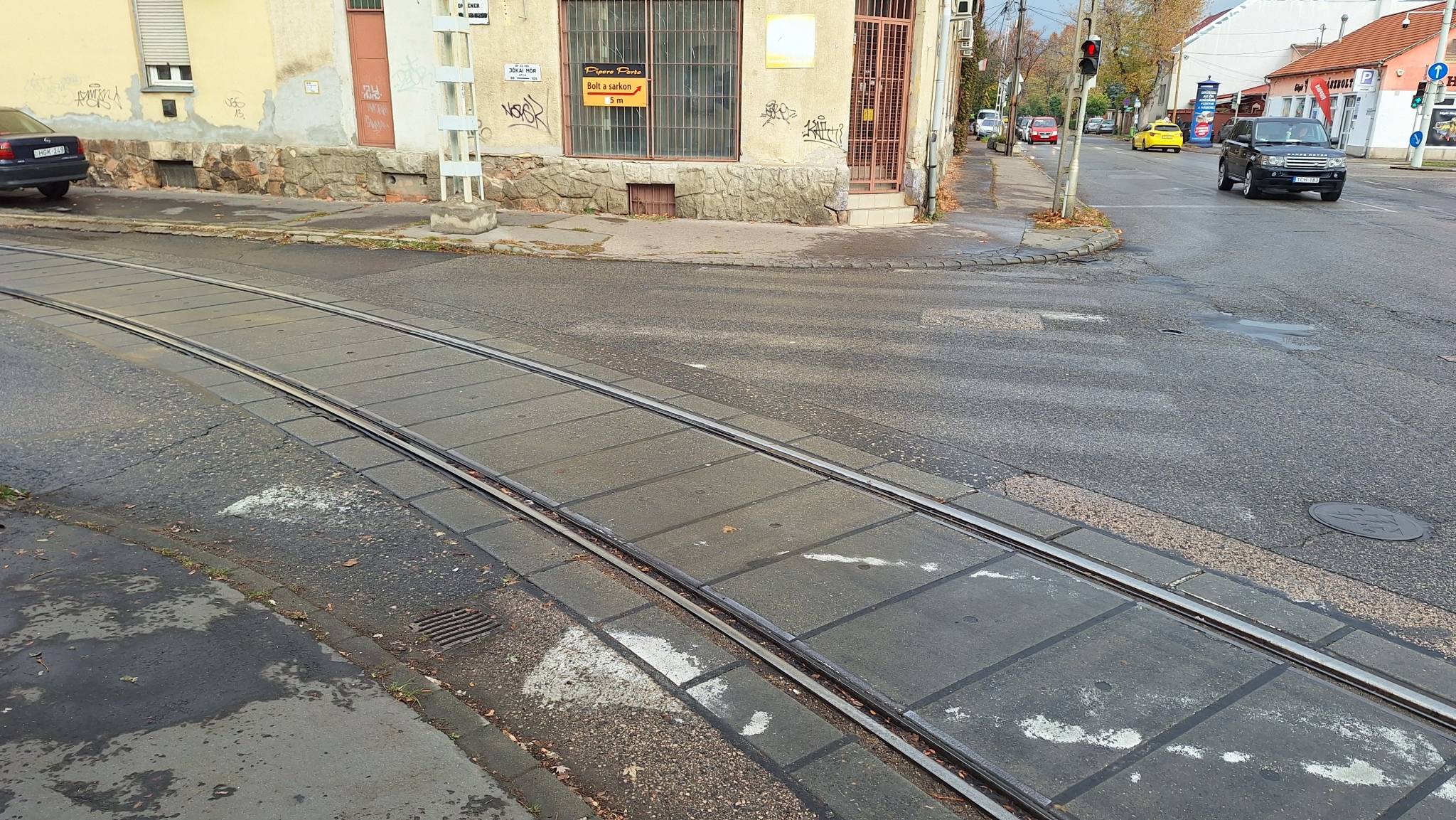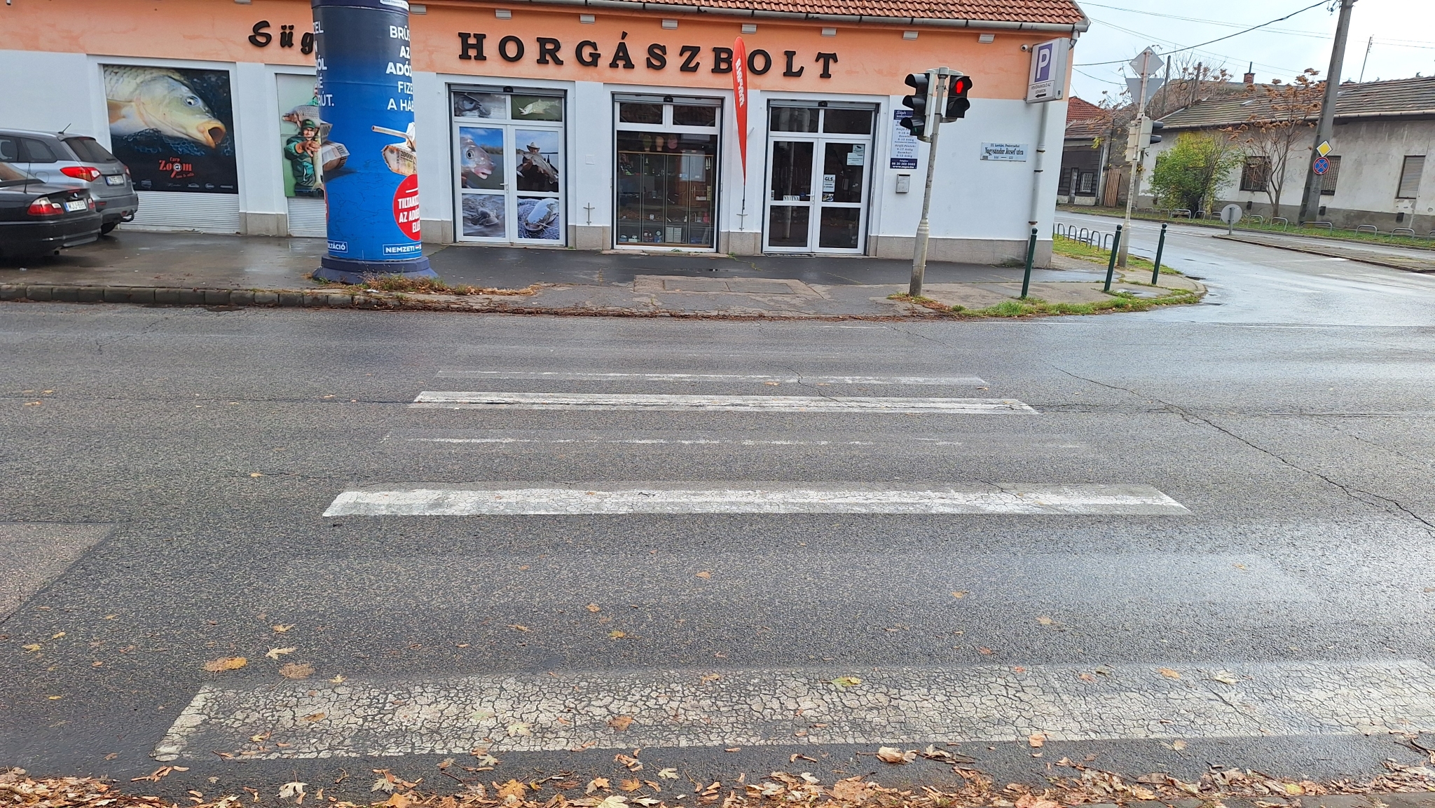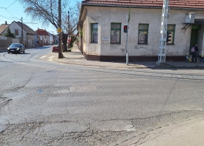 A Jókai Mór és Nagysándor József utca kereszteződésénél valmamennyi útburkolati jel erősen megkopott.