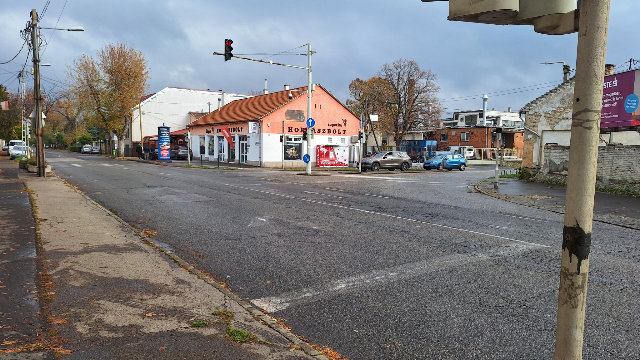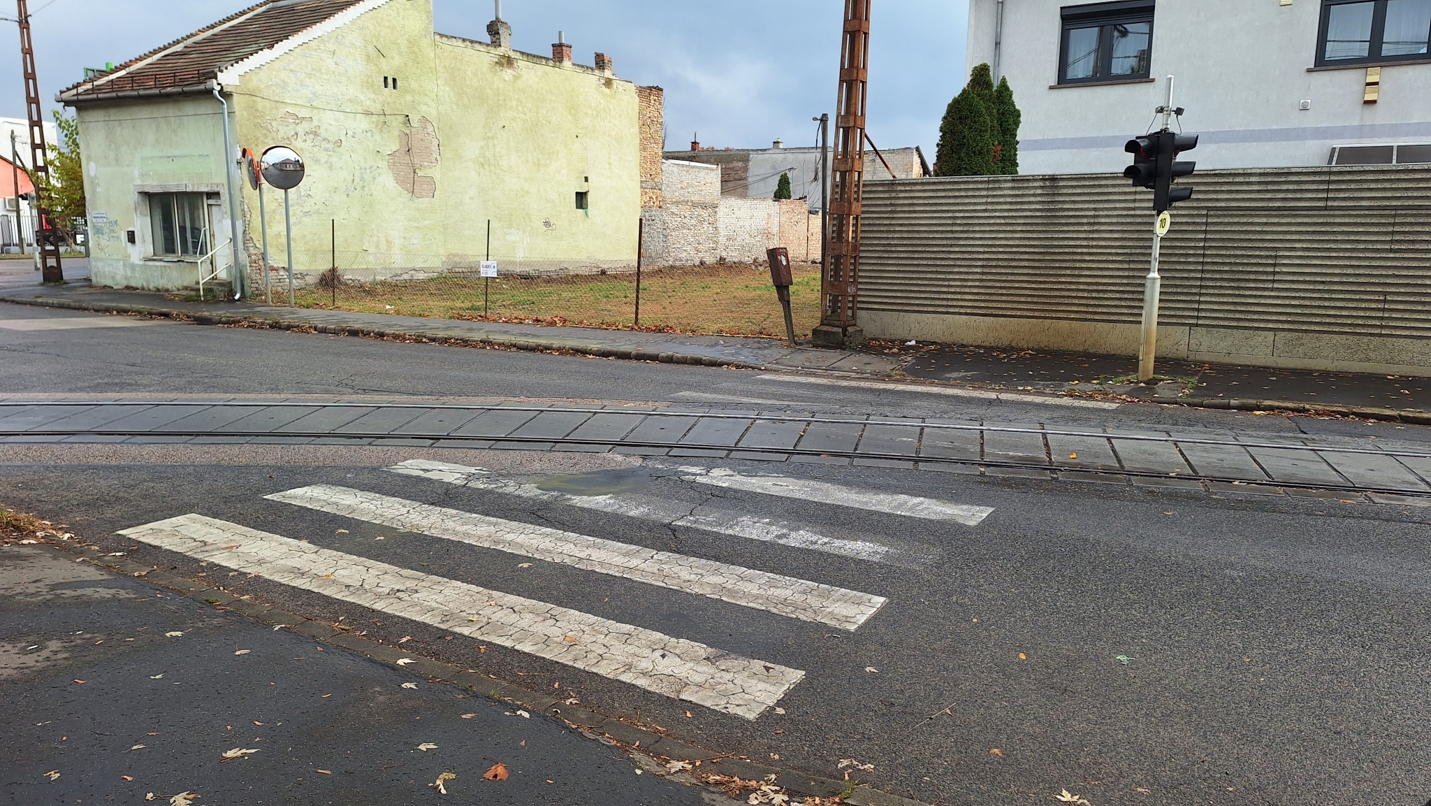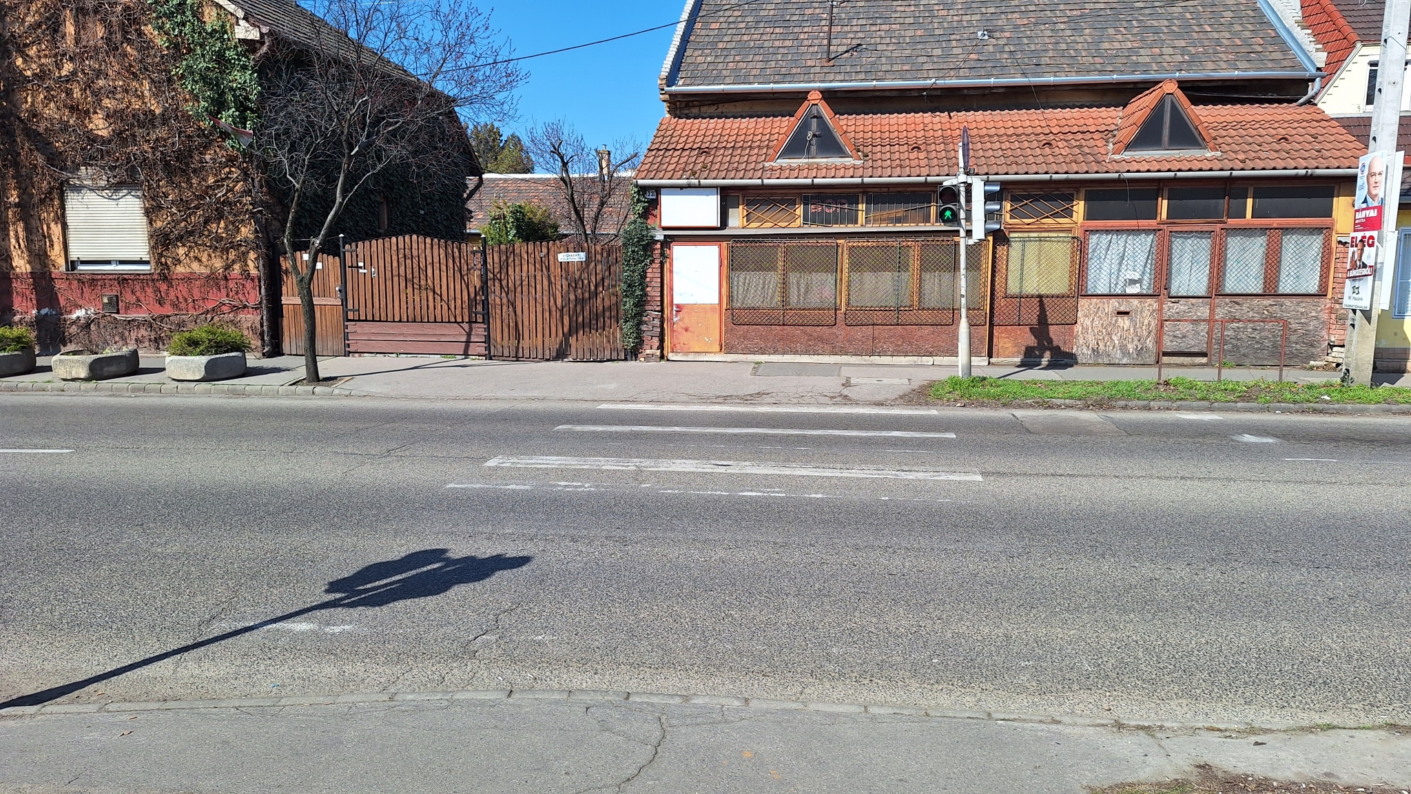 A Jókai Mór és Nagysándor József utca kereszteződésénél valmamennyi útburkolati jel erősen megkopott.