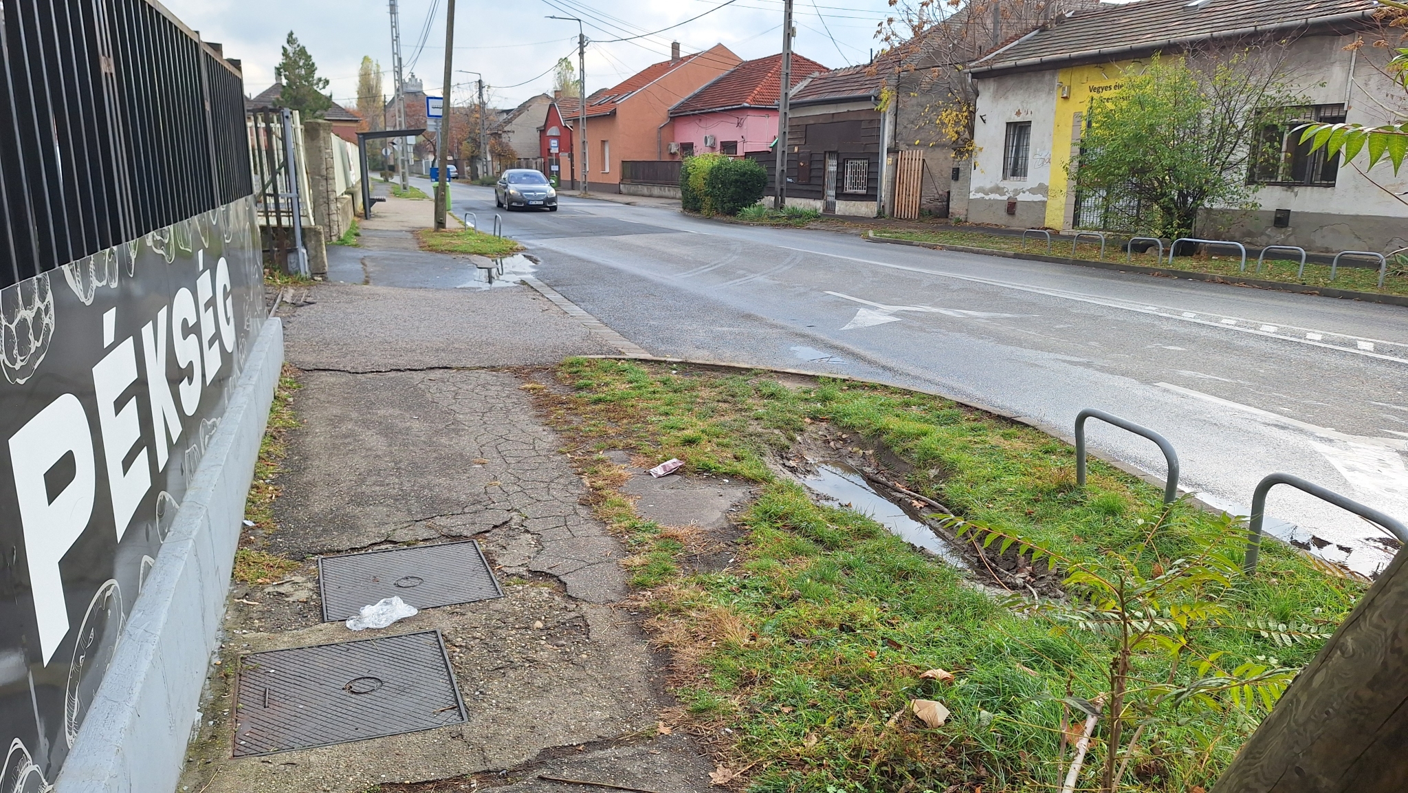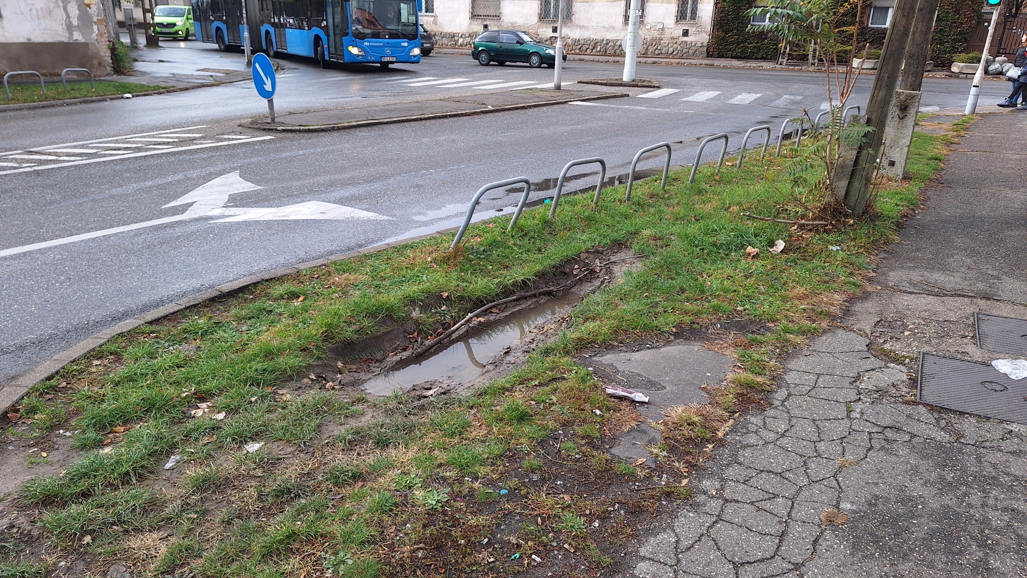 A Lázár utca 1. előtti járda menti zöldterület láthatóan gyakran le van parkolva.