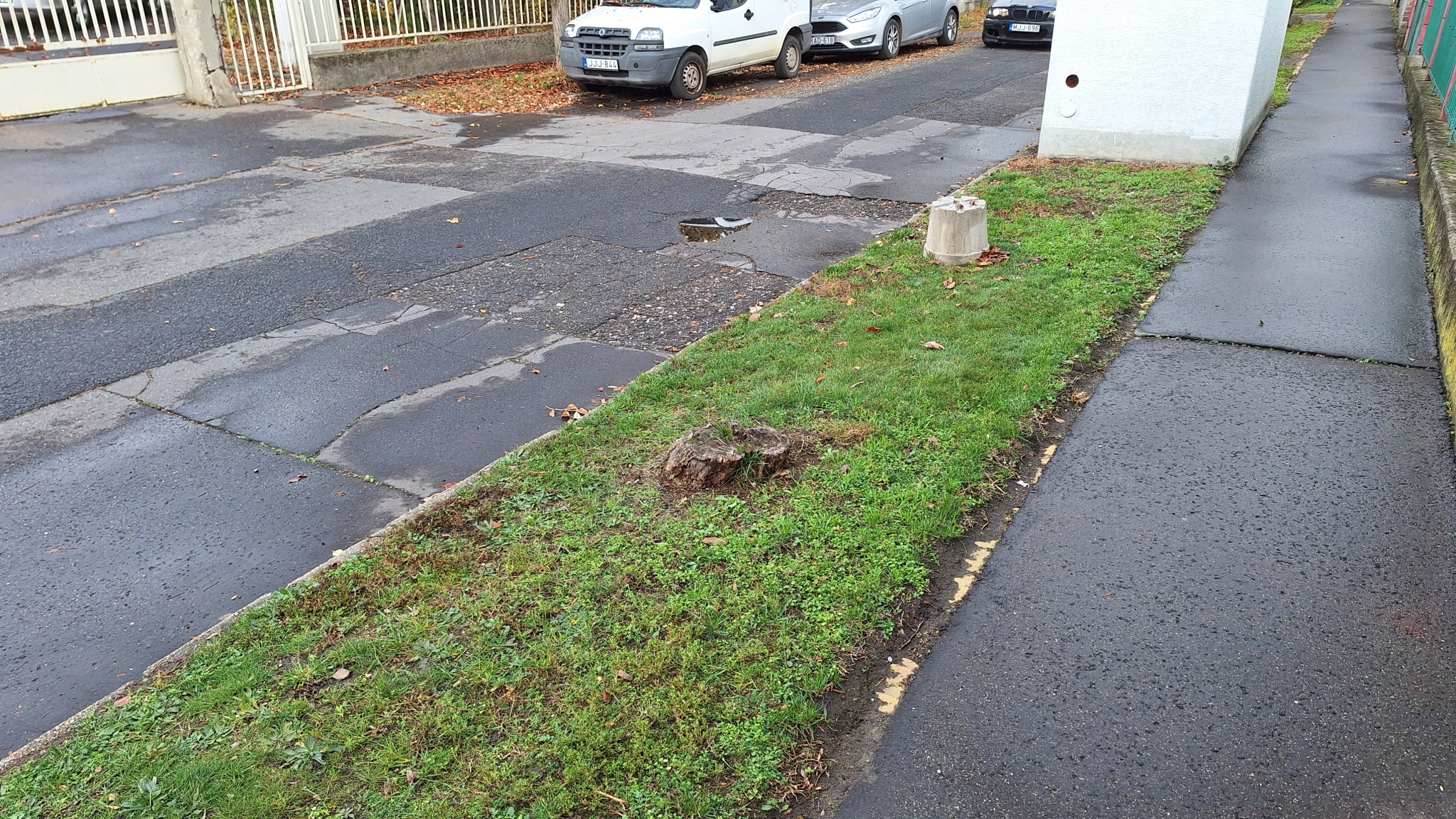A Lázár utca 7/A Perczel Mór utca felőli oldalánál van egy régi fatuskó.