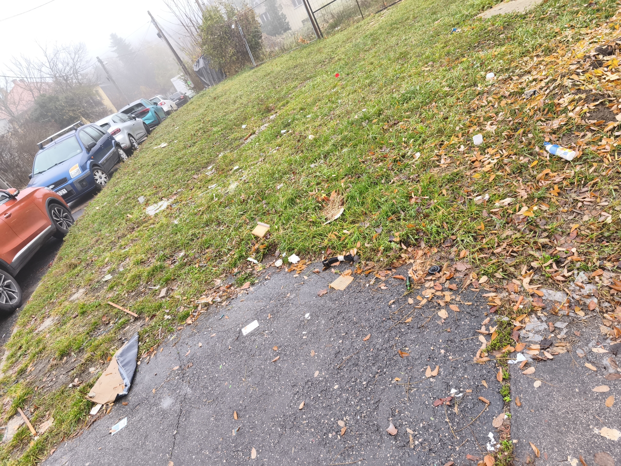 1125. Istenhegyi út - Tusnádi köz saroknál a lomtalanítás utáni apró szemét hetek óta ott van hagyva. Üveg is van, aszfalton is, füvön is, de a szél is vitt tovább szemetet, be a parkoló autók alá.