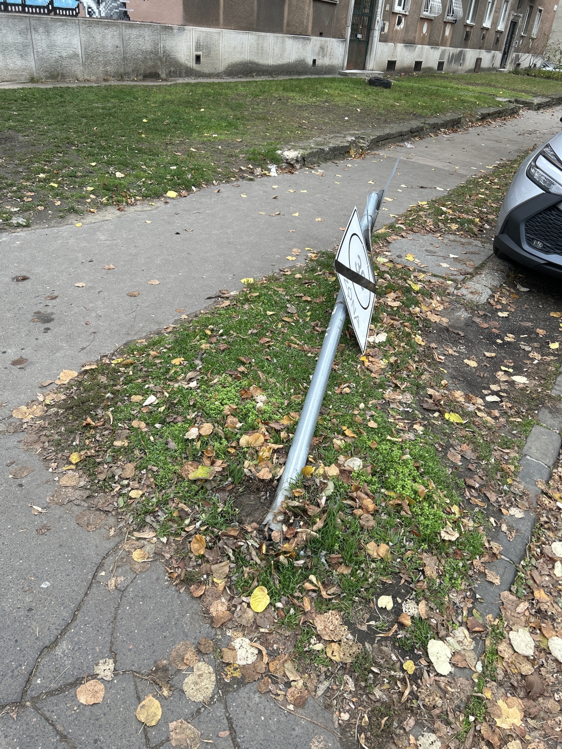 Kidöntött forgalomirányító tábla a Nagy Lajos király útja - Kalapács utca kereszteződésben (14. kerület)