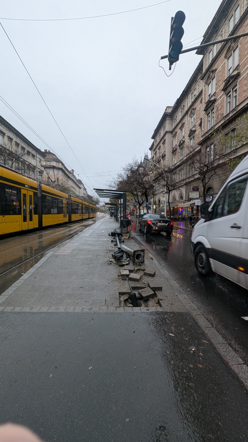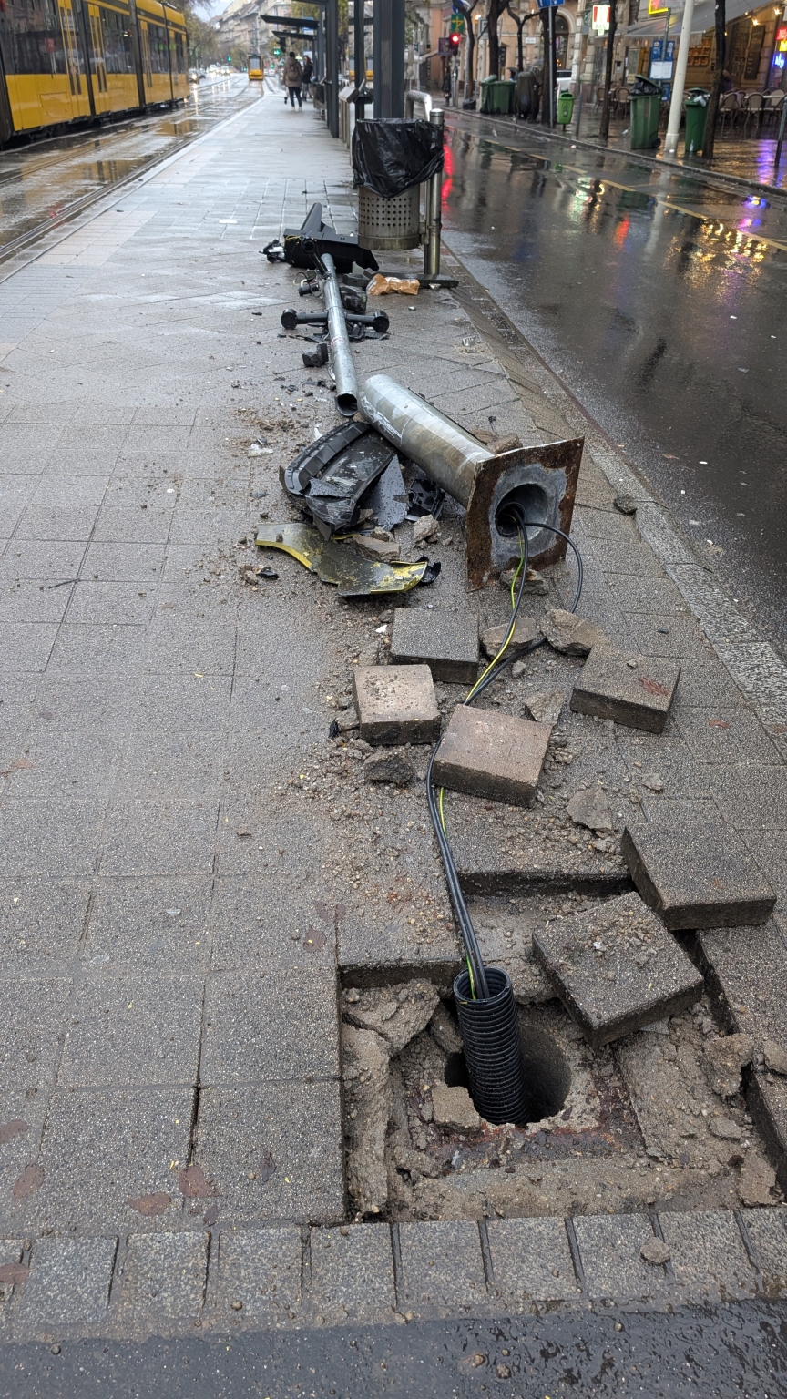 Király utcai 4-6 villamos megállónál, Corinthia hotelhez közelebbi gyalogos átkelőhelyen, feltehetően november 21-re virradó éjszaka során, közlekedési baleset folytán, gyalogos átkelőhelyet szabályzó jelzőlámpa el lett ütve.