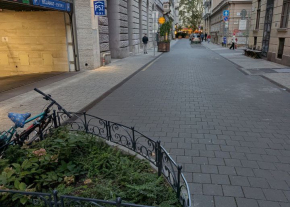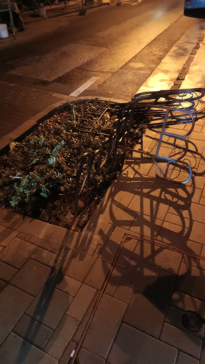 A Dessewffy-Jókai utca sarkán, kiszedték és félretették a zöld ágyást szegélyező kis korlátot.