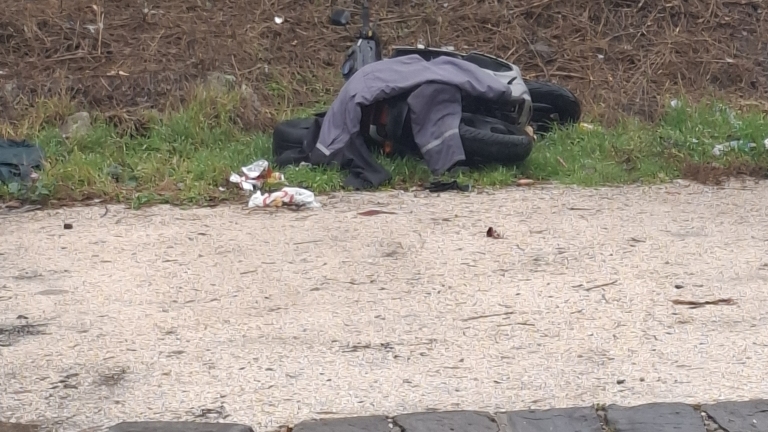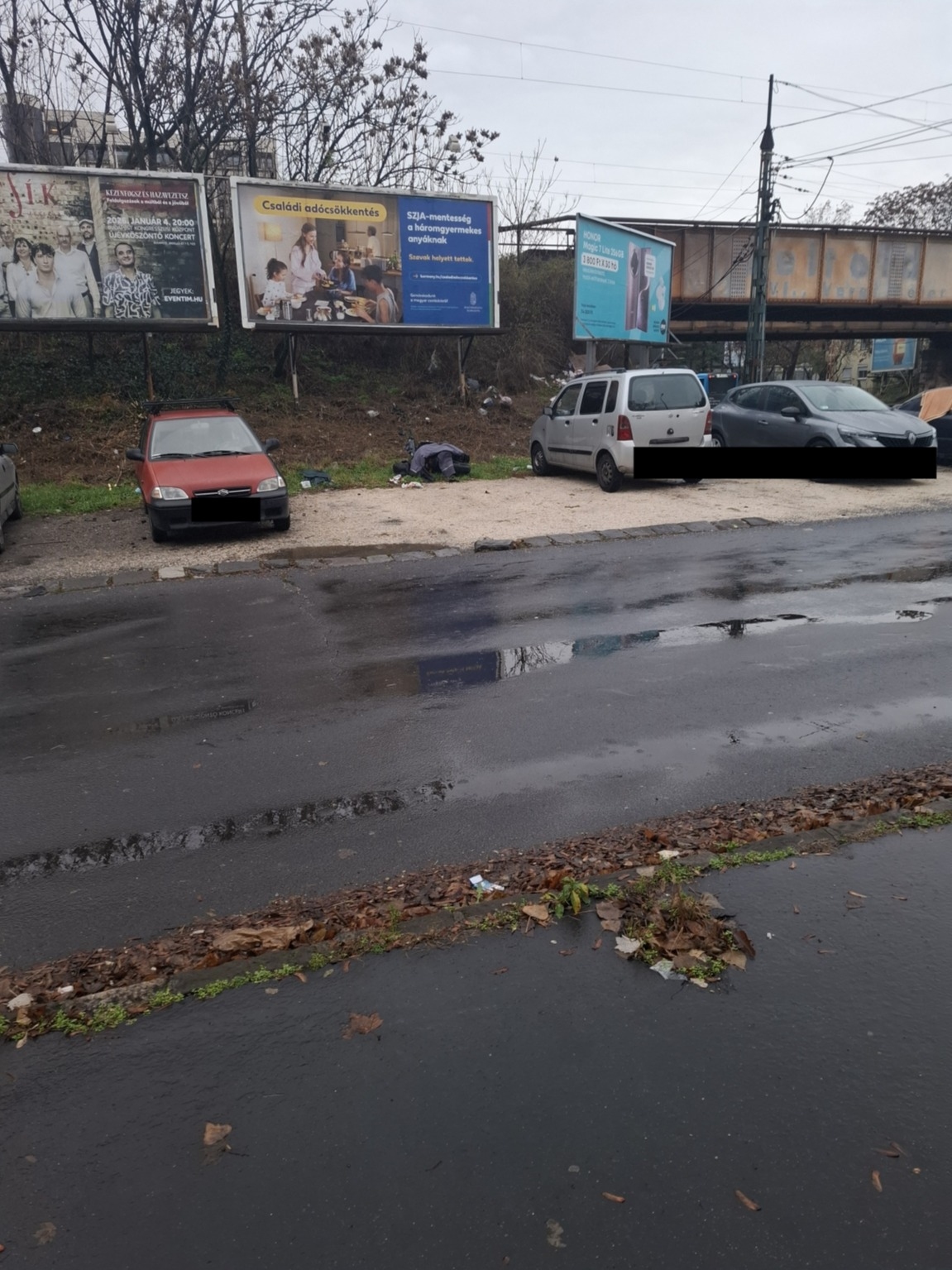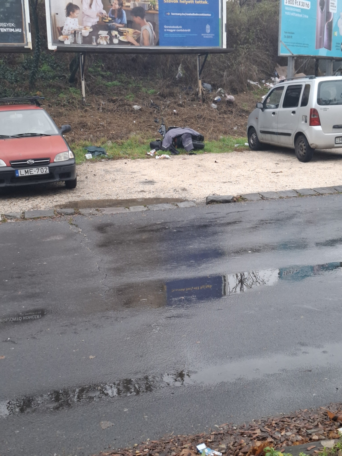 A motor a parkolóban fel van döntve, egy kabáttal letakarva (végülis hideg van, ne fázzon) várja a további sorsát. A probléma az, hogy elfoglal így is egy parkolóhelyet.