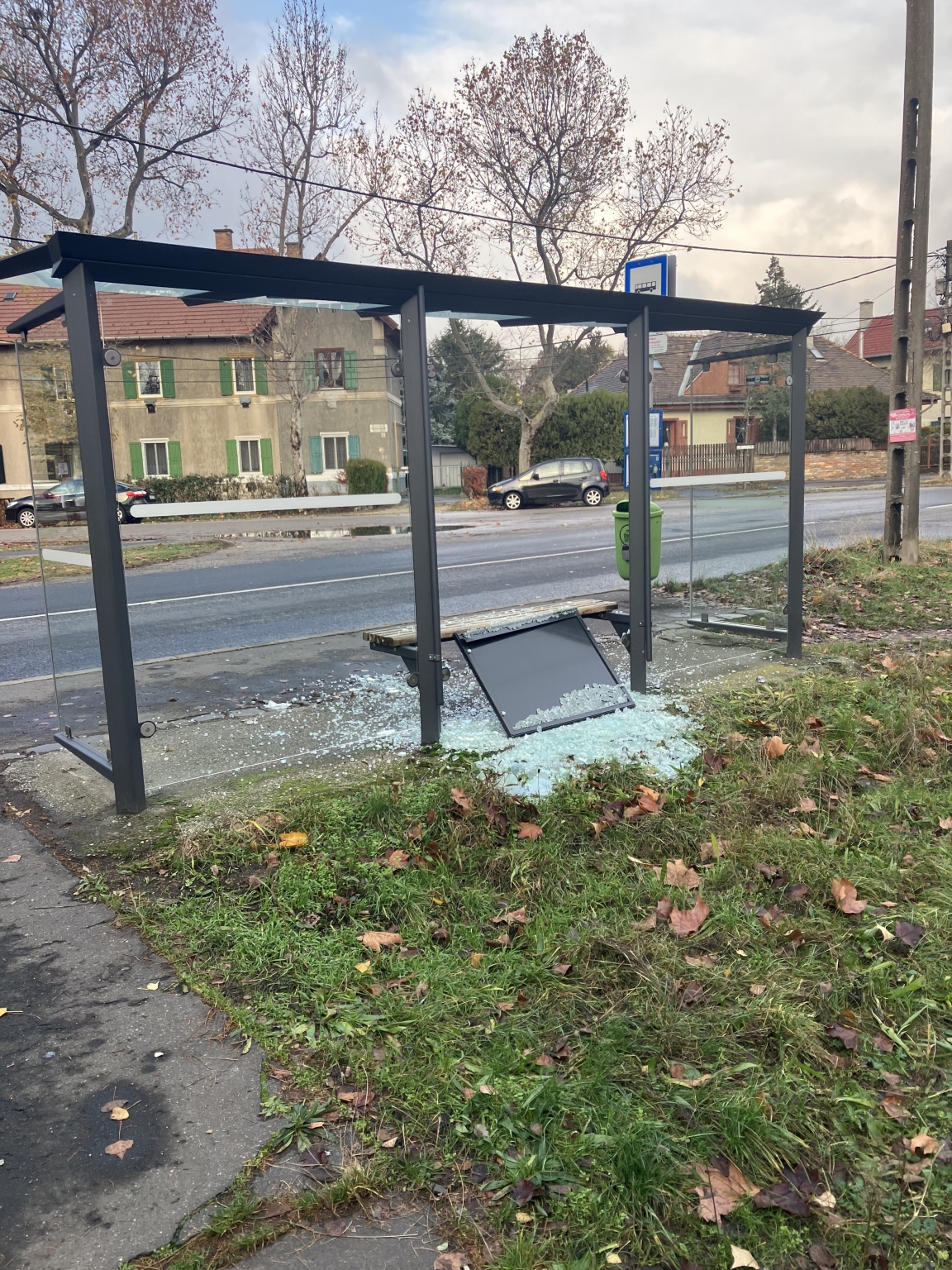 A Pannónia út 16 előtt az éjszaka folyamán a buszmegálló össze lett törve.