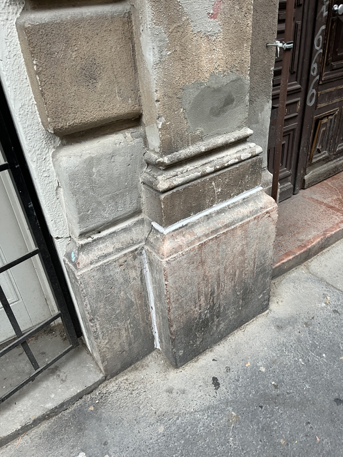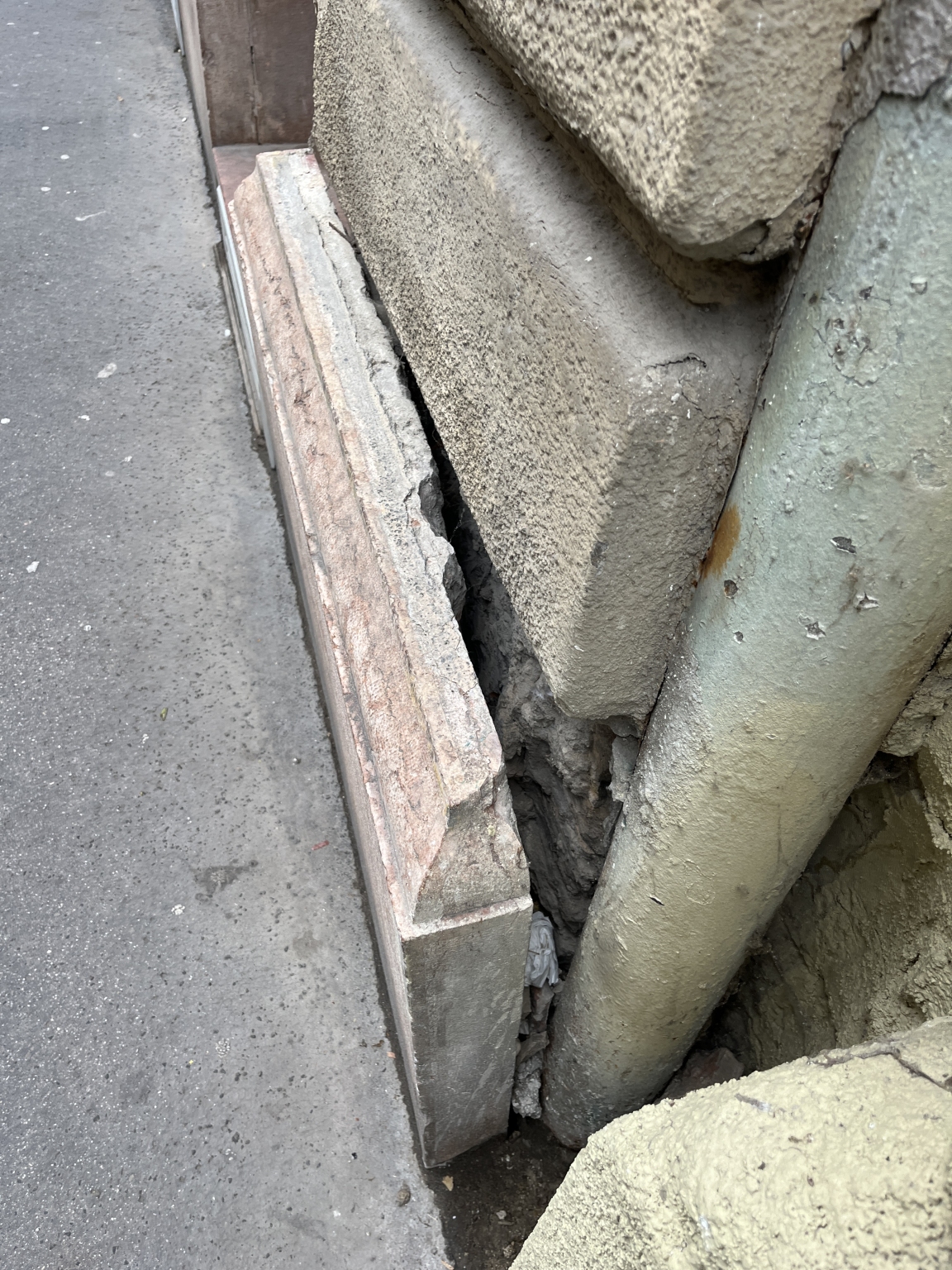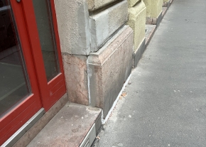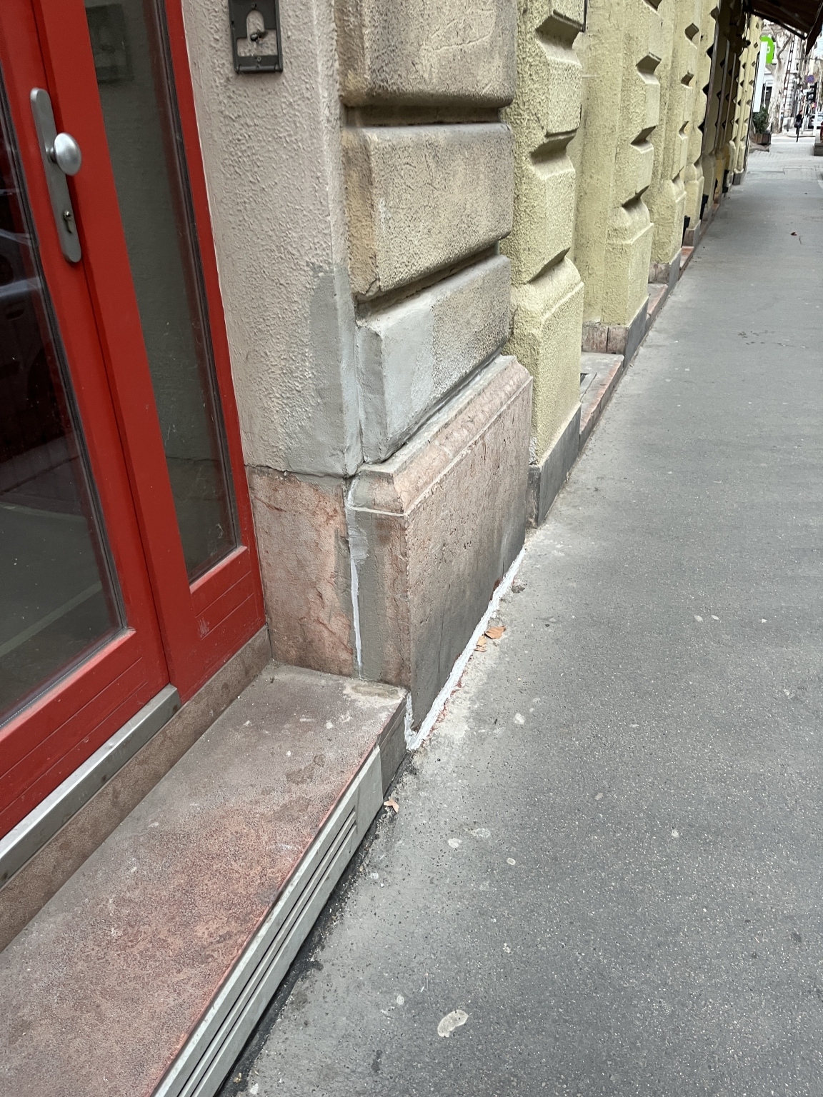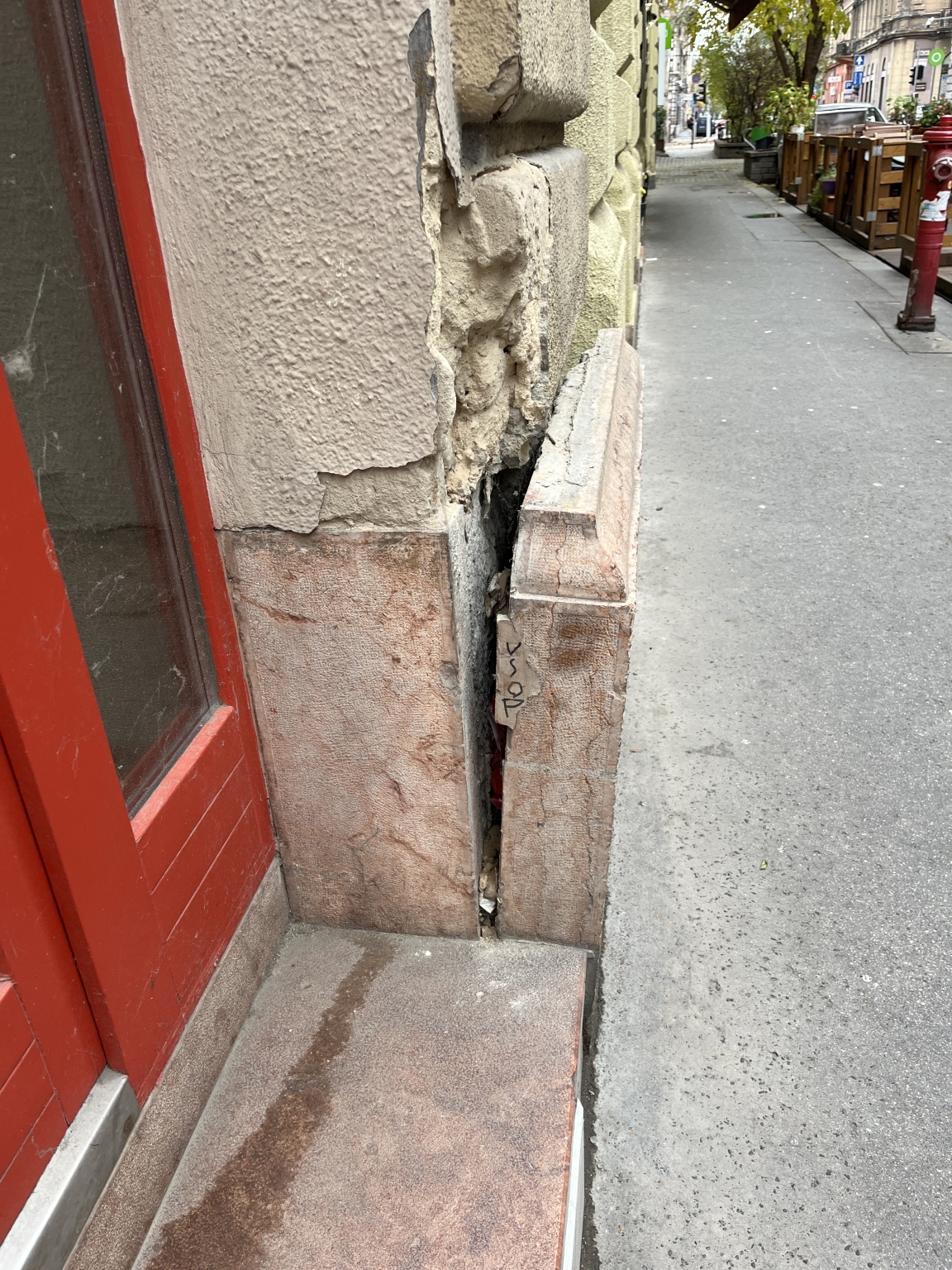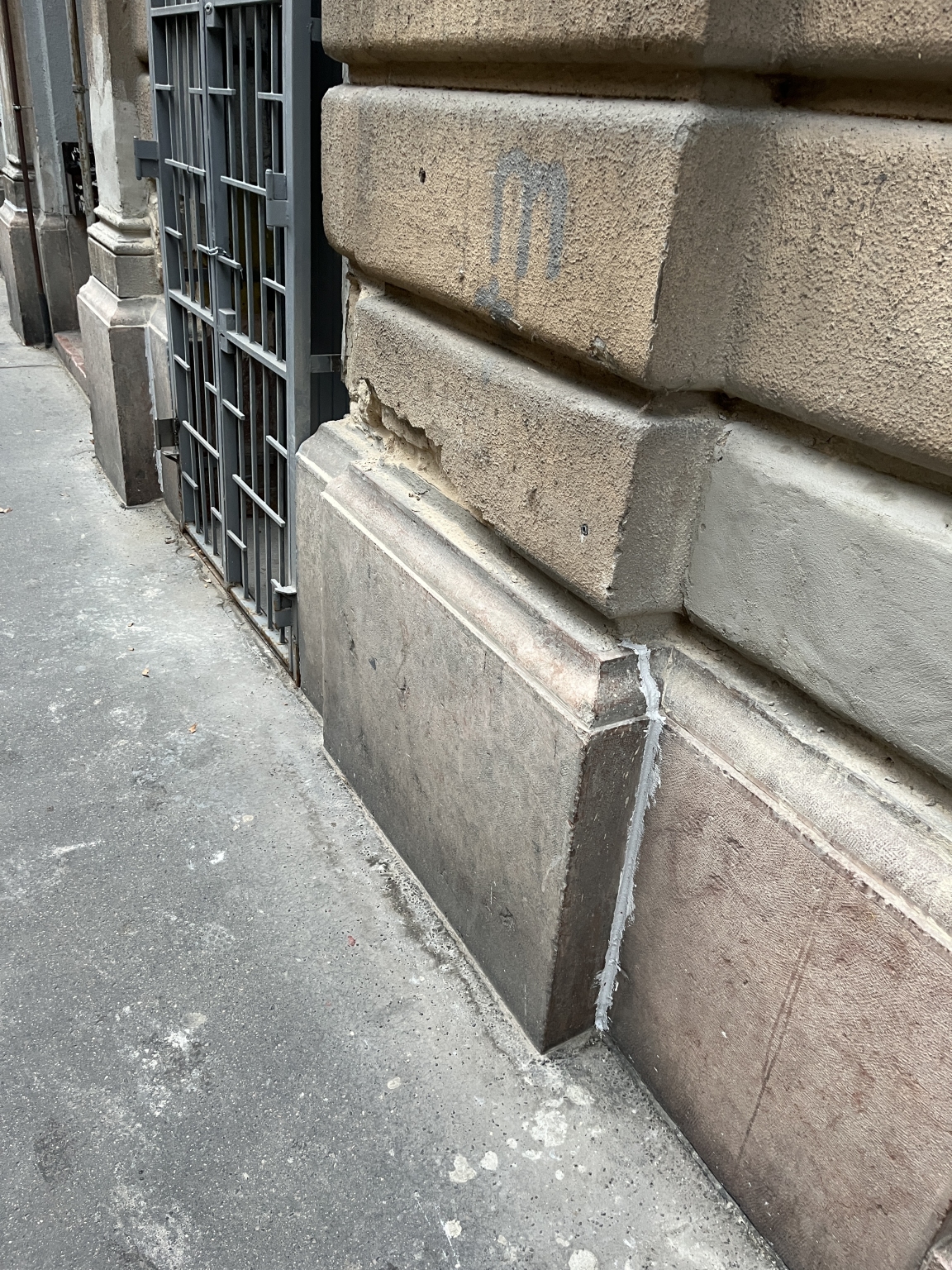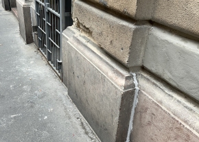A Szív utca 3-5 szám alatti ház jobb szélén a lábazati burkolóelemet elengedte a ragasztó. Kézzel meglökve instabil állapotban van. Ha leborul egyszer, akkor egy kisgyereket súlyosan is megsebesíthet.