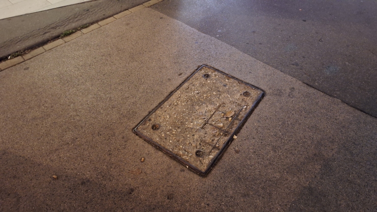 A Róbert Károly körút és a Teve utca sarkánál van egy sérült aknafedél, még a betonvasai is kilátszanak.