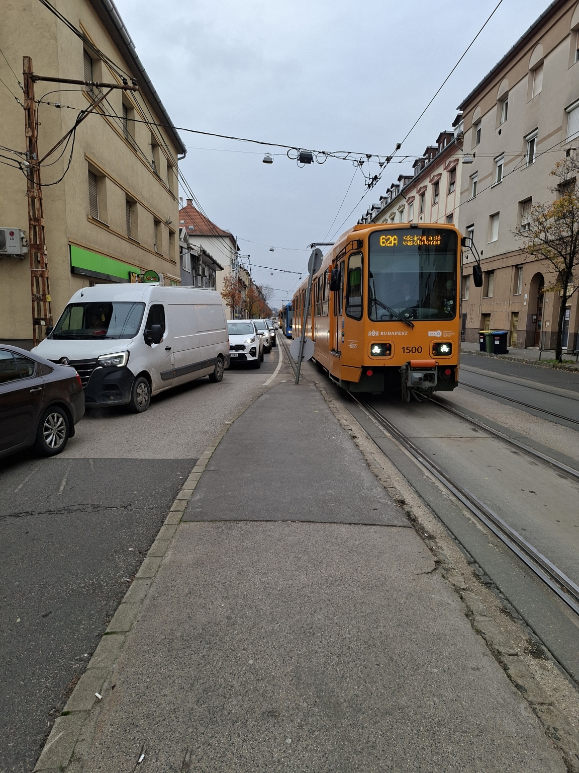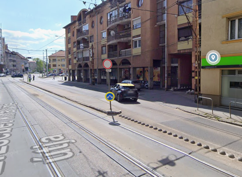 Zuglóban a Nagy Lajos király útja és az Erzsébet királyné útja kereszteződésénél az 5-ös busz megàllójában a közlekedési tábla ferde.