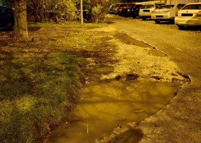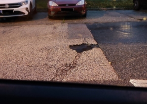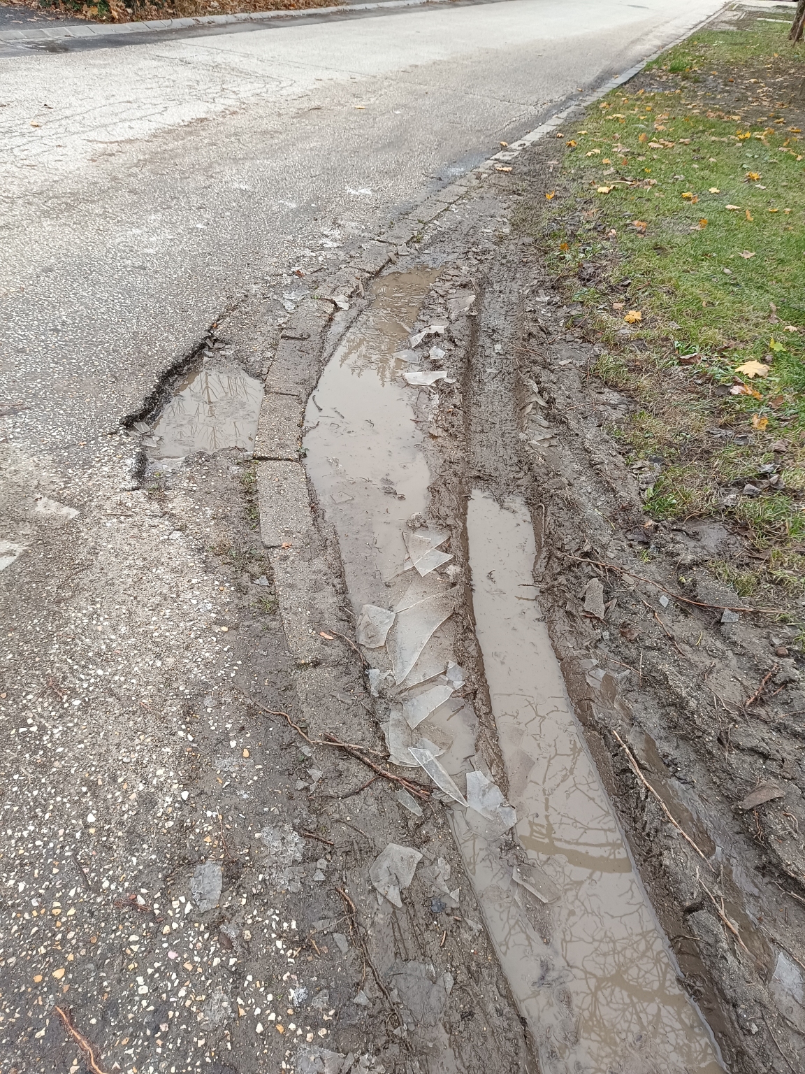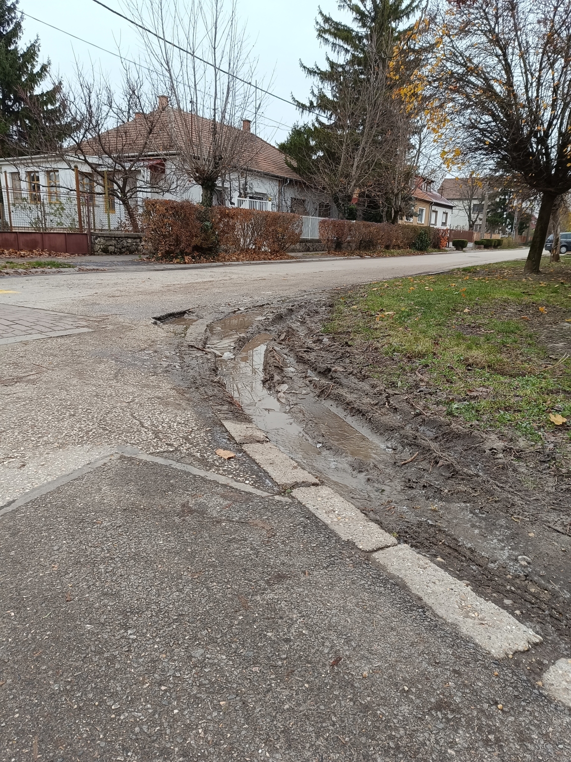 Bajtárs utca/Sinkovits Imre utca sarkán a forgalomlassító mellett az út széle tönkrement az azt kerülő autók miatt, egy részen egy mély kátyú alakult ki, míg mellette saras, járhatatlanná vált a füves rész.