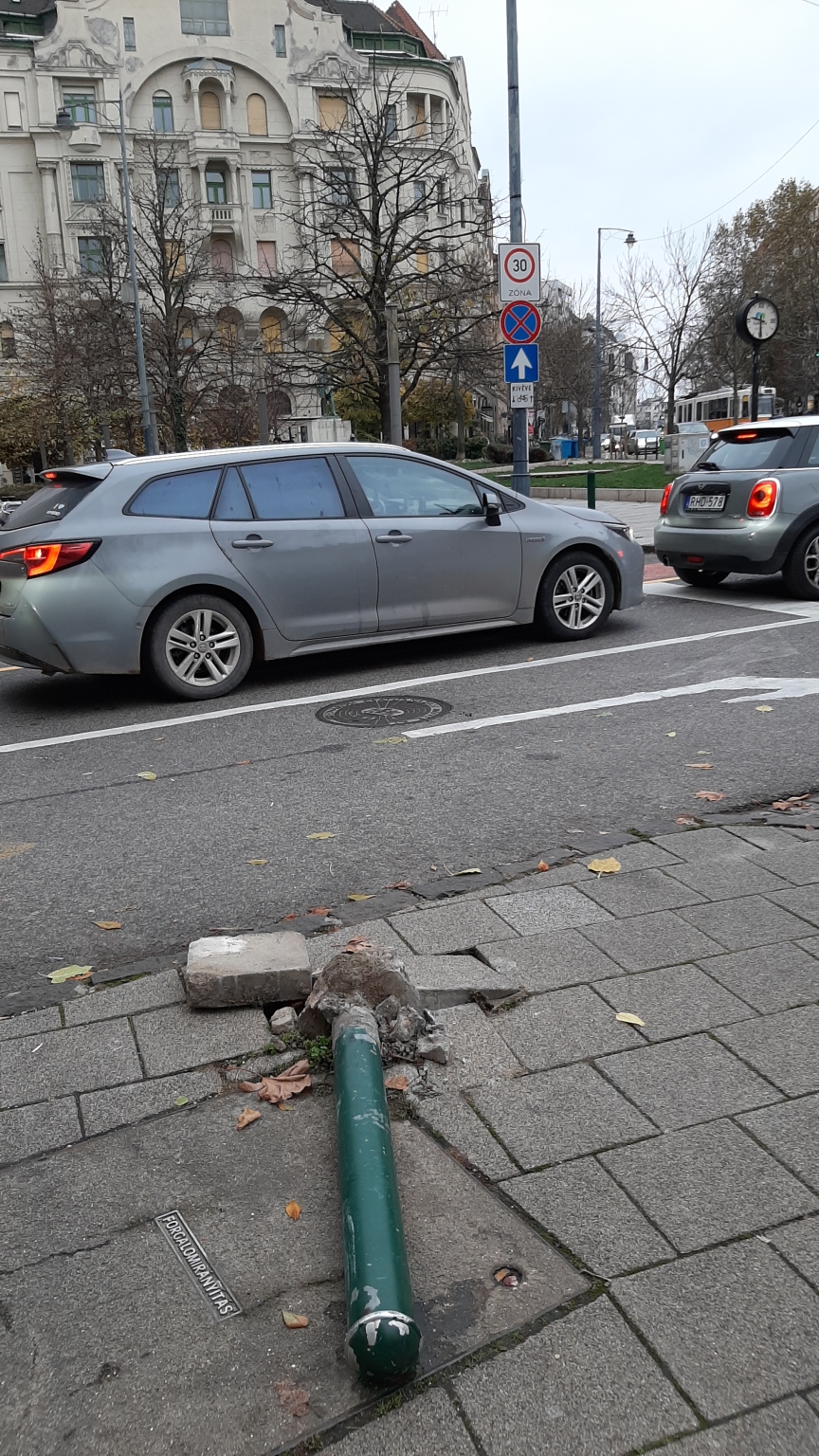 A Bartók Béla út és a Gárdonyj tér sarkán kidőlt járdaszegély oszlop(ok) van(nak).