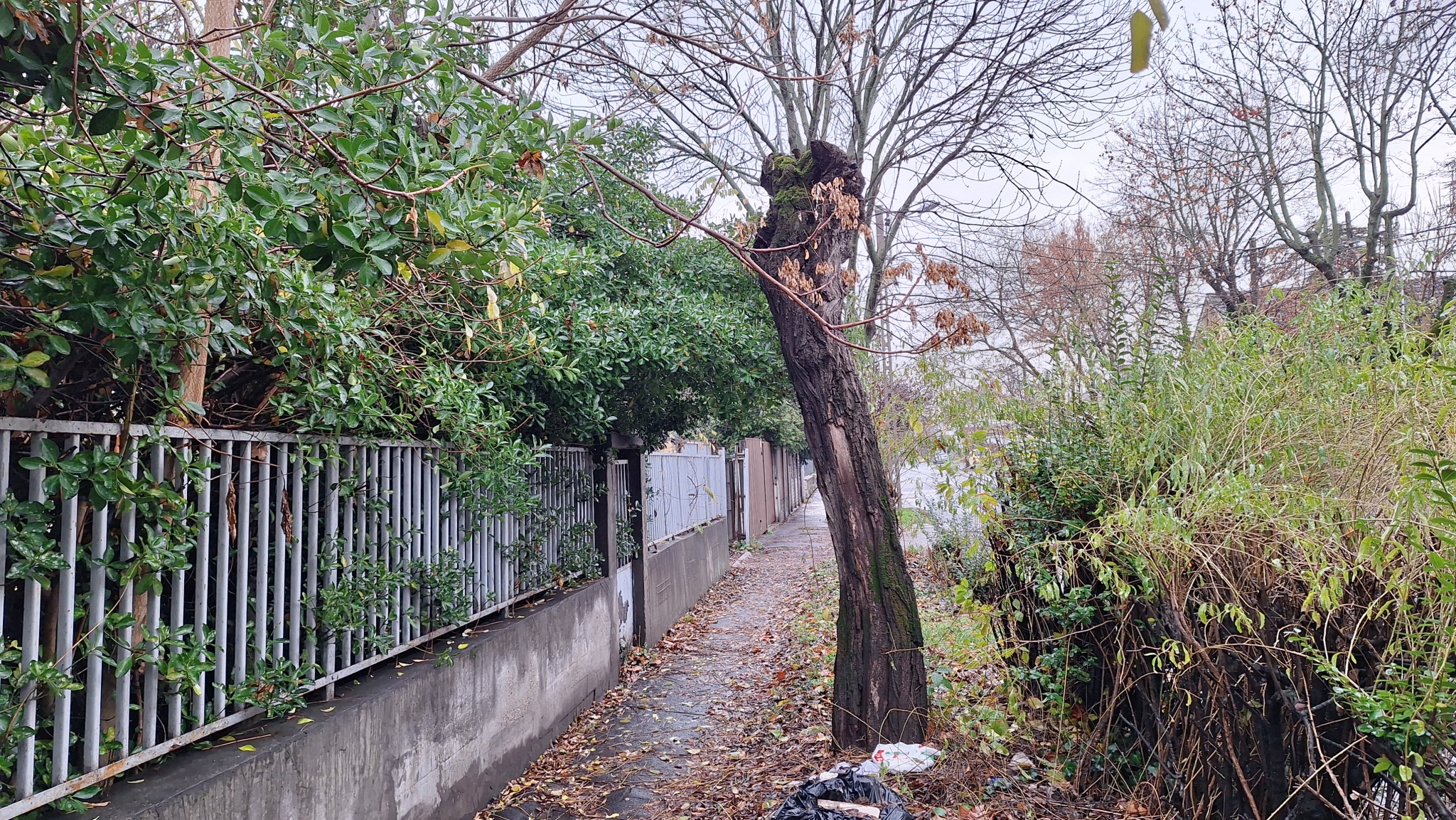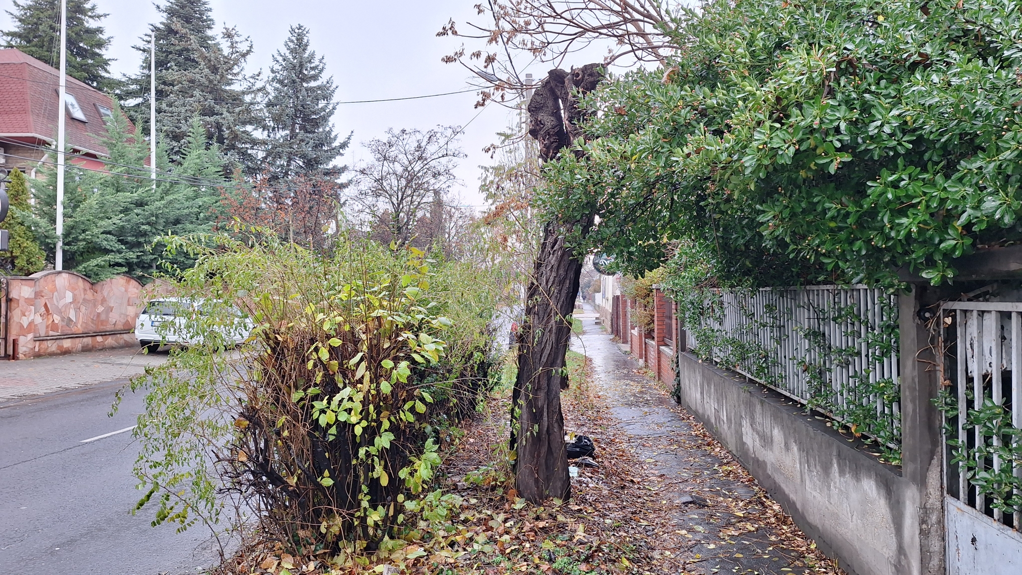 A Mártírok útja 167. előtt áll egy kiszáradt fatörzs.