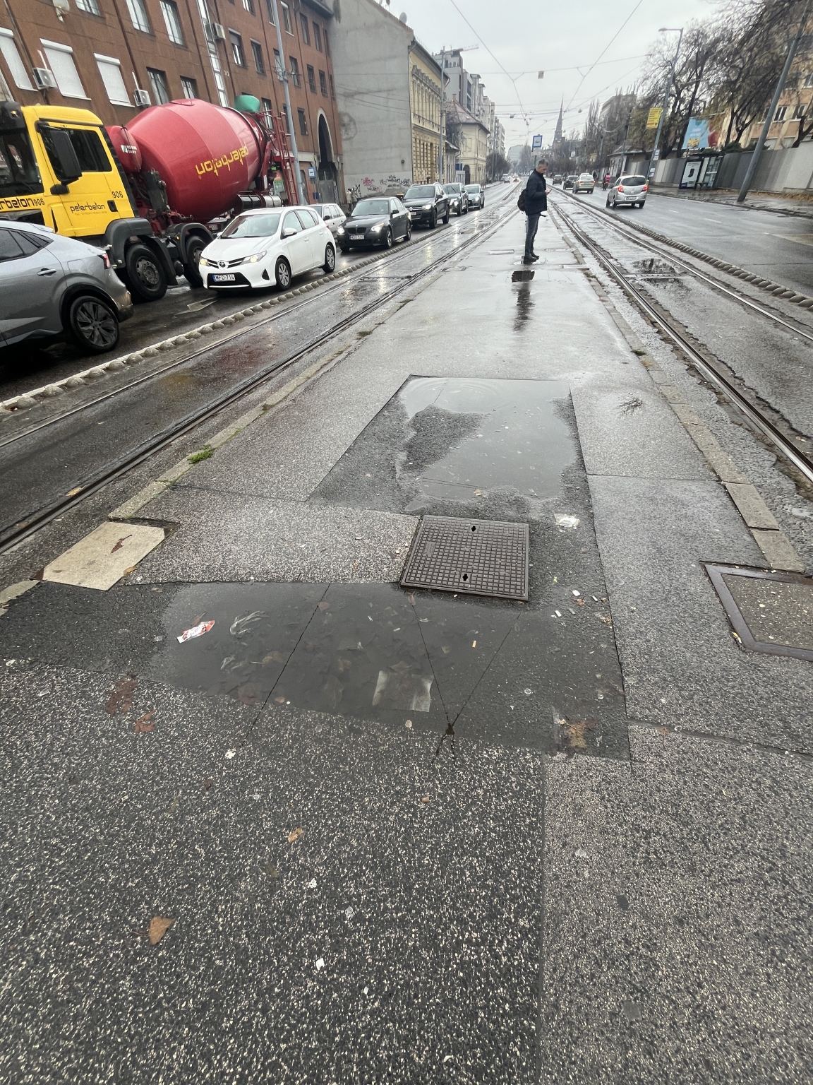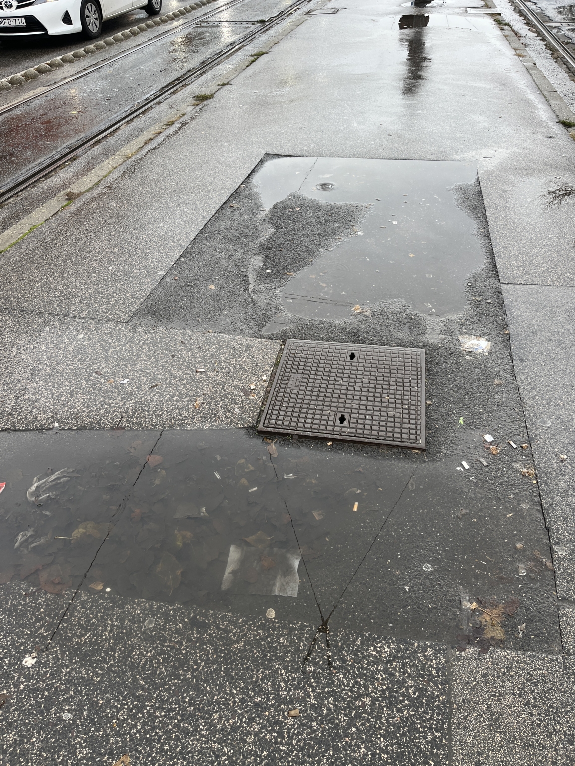 Hatalmas tócsák a villamosmegállóban