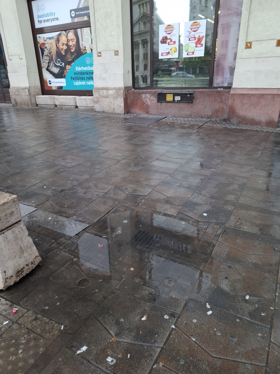 A Deák Ferenc téri aluljáró B lejáratánál a vízgyűjtő csatorna elugult, a felgyűlt víz a lépcsőkön át az aluljáróba folyik.