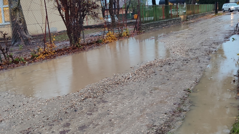 Visszatérő probléma az ott élő lakosság számára. Esőzés után az árok és az utca megtelik vízzel. A gyalogos közlekedés az eltűnt járda hiányában is nehézkes. Az utcában közvetlenül egy általános iskola található, oda is átjut a víz. Indokolt lenne csatornahálózat kialakítása és aszfaltozás.