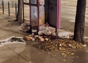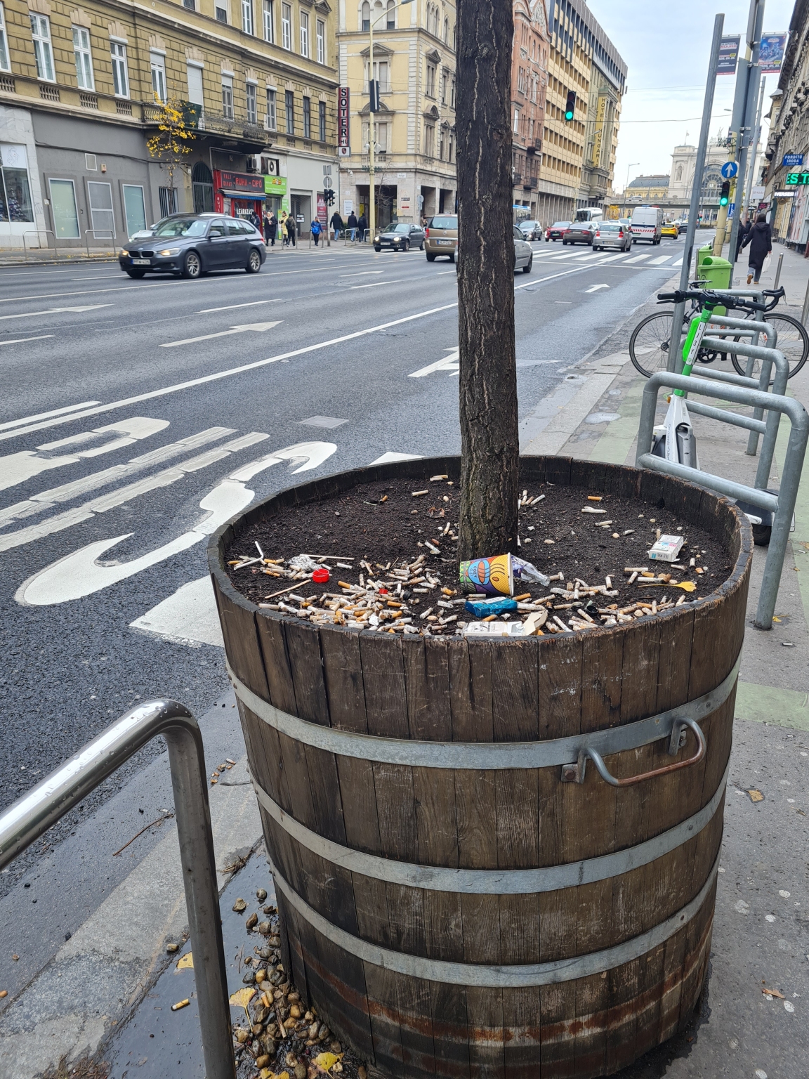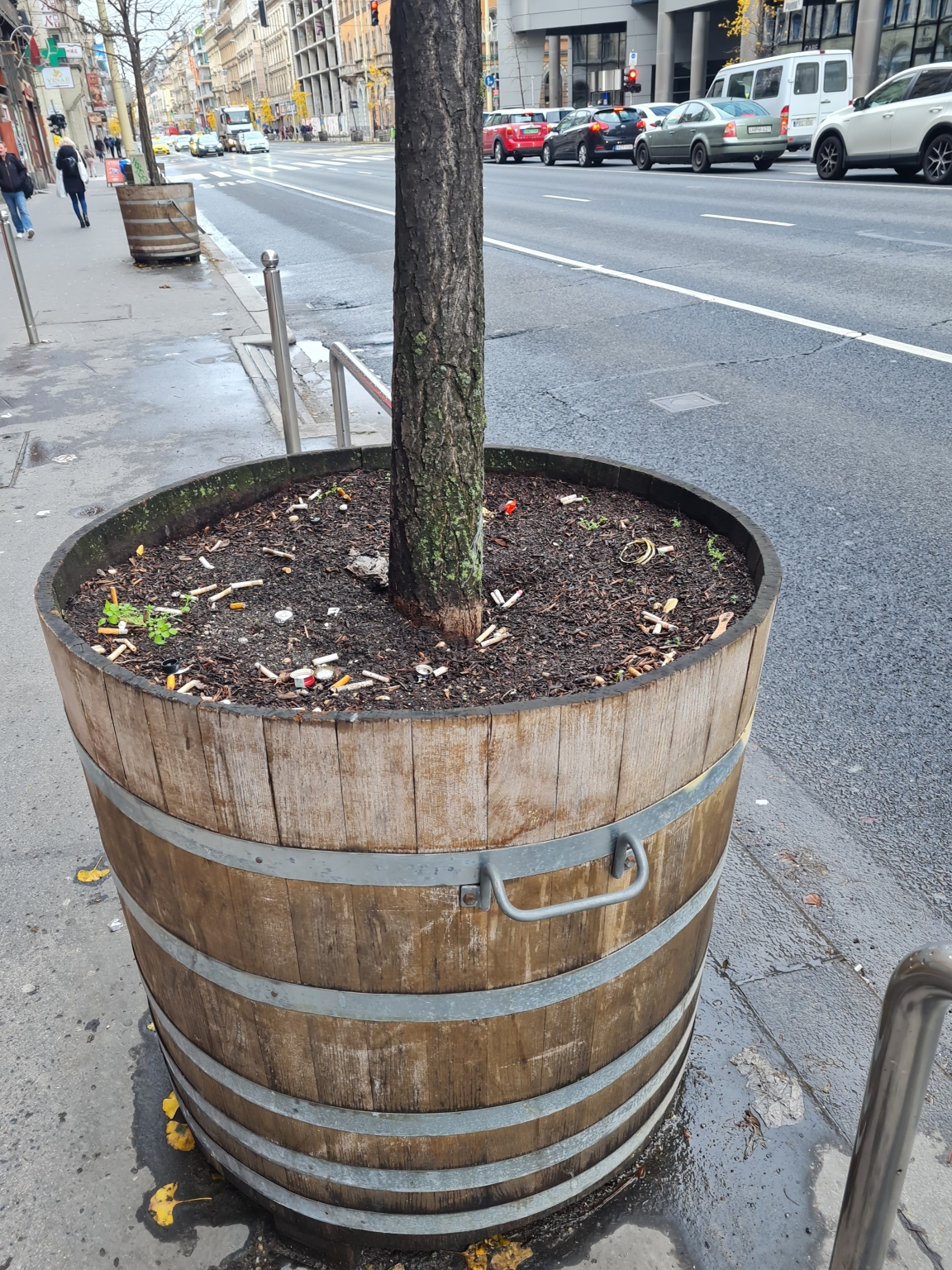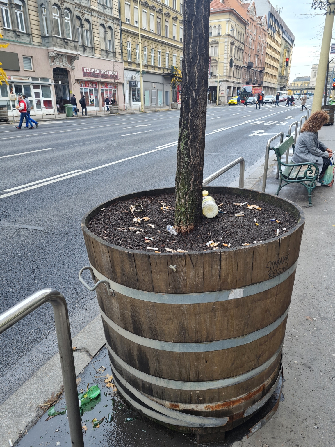 A Rákóczi út 59-65. szakaszon kihelyezett dézsák szemetesek, hamutartóként funkcionálnak, kérem rendszeres takarítását!