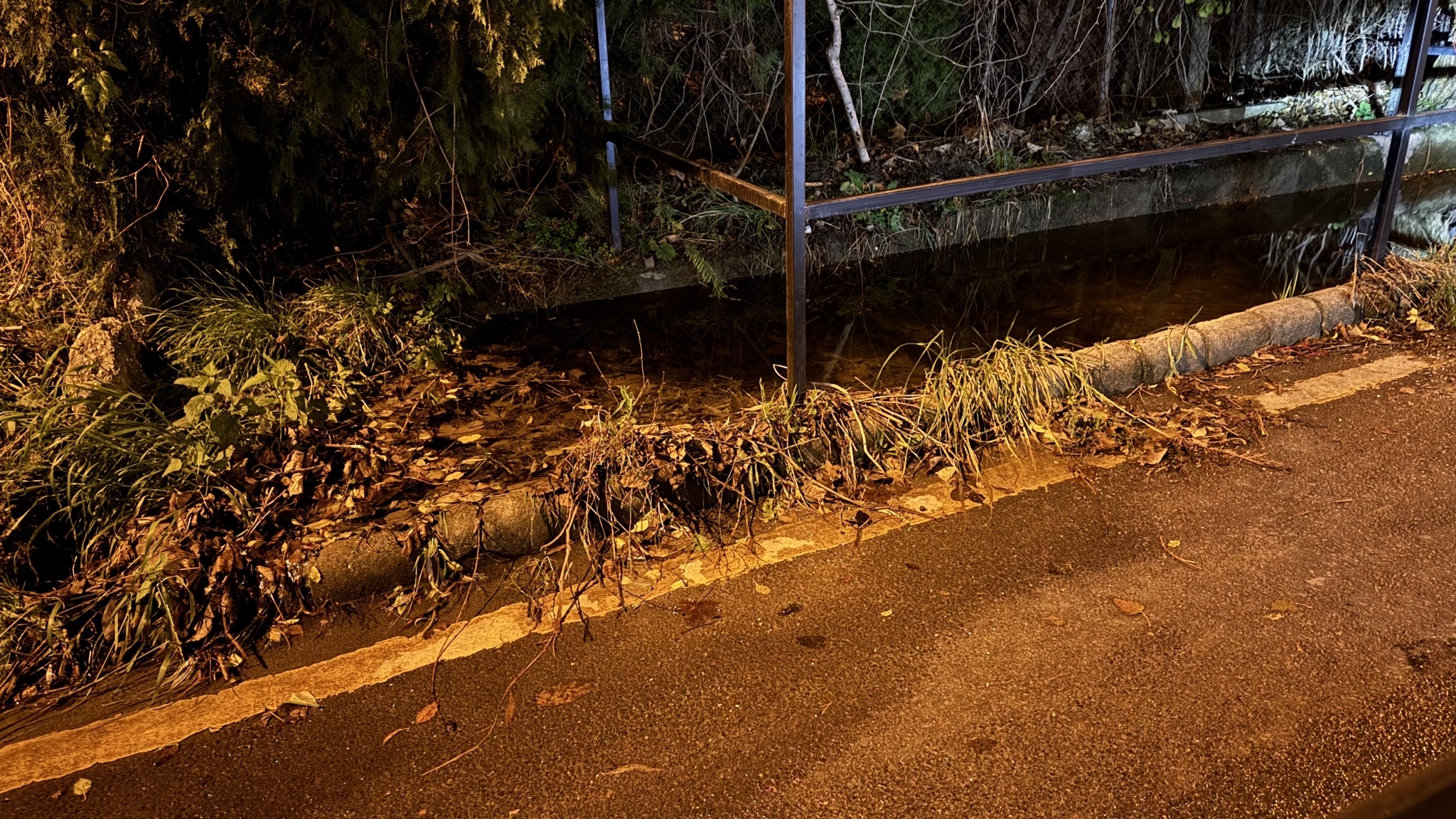 Eldugult az esővízgyűjtő, ezért az úttestre folyik folyamatosan a víz, ami reggelre meg is fagy. Eléggé veszélyes a helyzet…