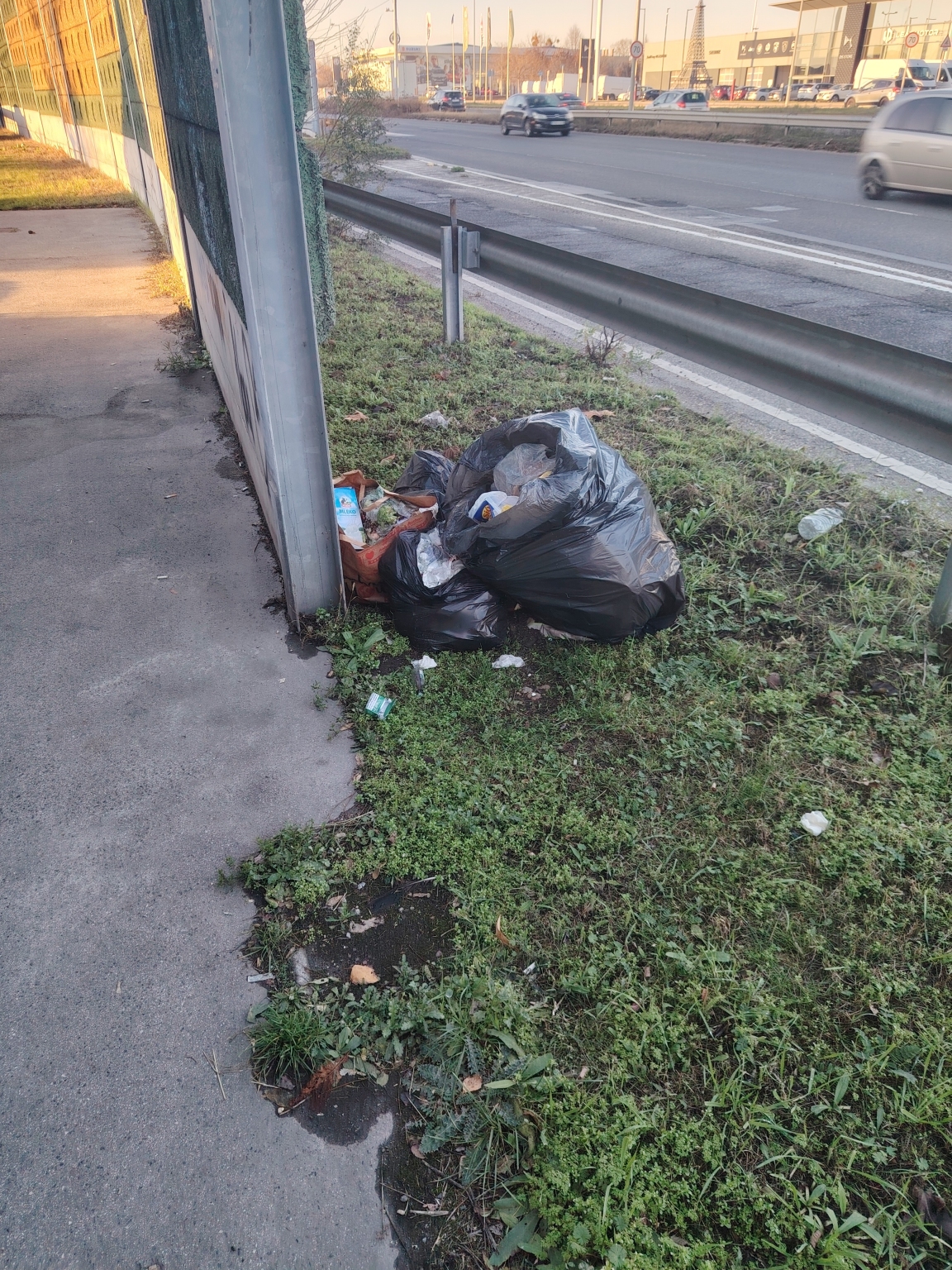 A szokásos szemétlerakó a zajvédő fal mellett, a gyalogátkelőhelynél.