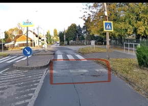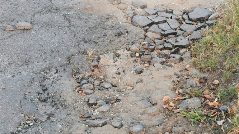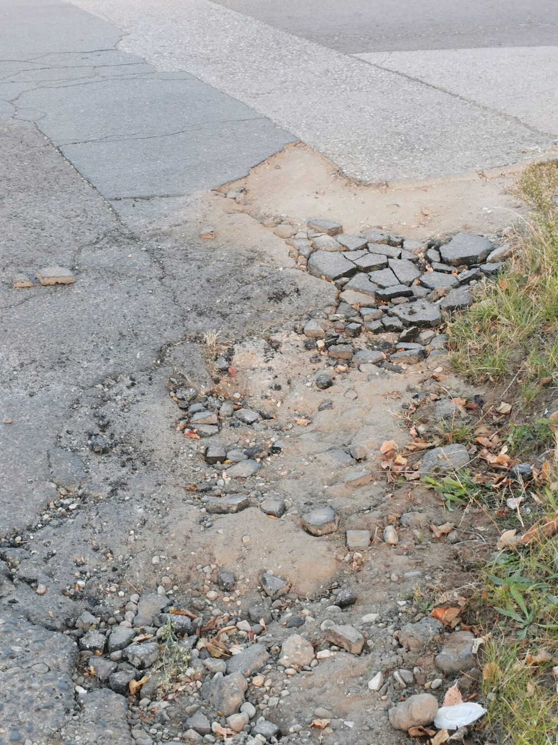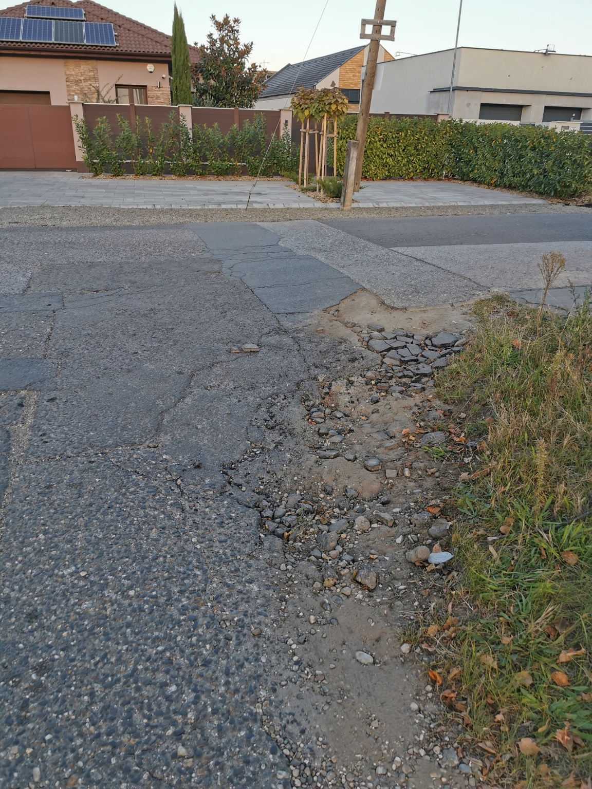 1188 Budapest, Szigeti Kálmán utca és Határ utca kereszteződésében az aszfalt kopóréteg osszetört, beszakadt, hatalmas kátyú tátong az útpadka mellett a jobb szélső íven.