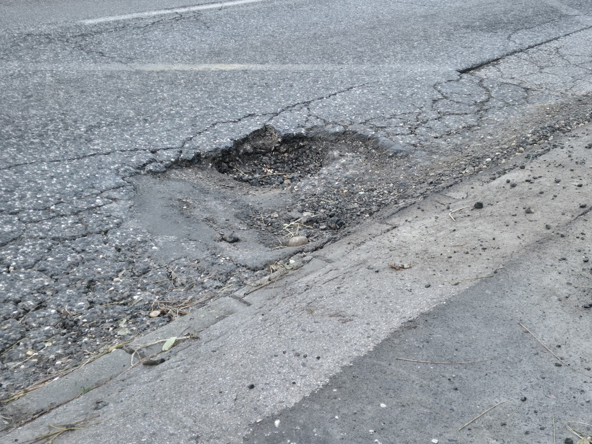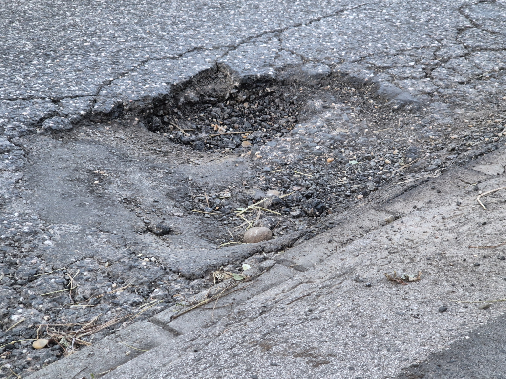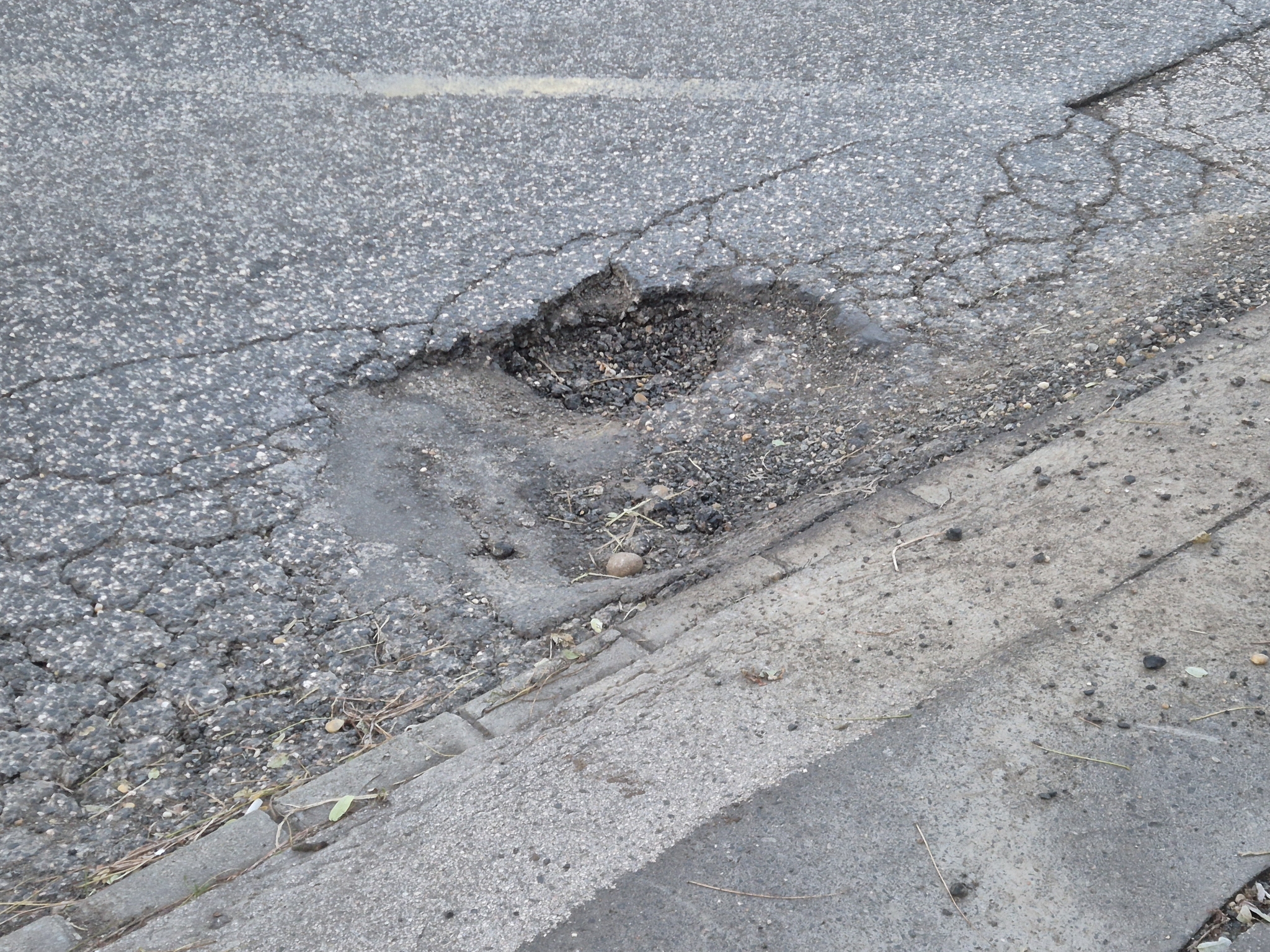 Budapest, XIX.kerületében, a Nádasdy utca 86-os szám előtt (a buszmegállóban), hiányzik egy nagyobb aszfalt darab az útburkolatból.