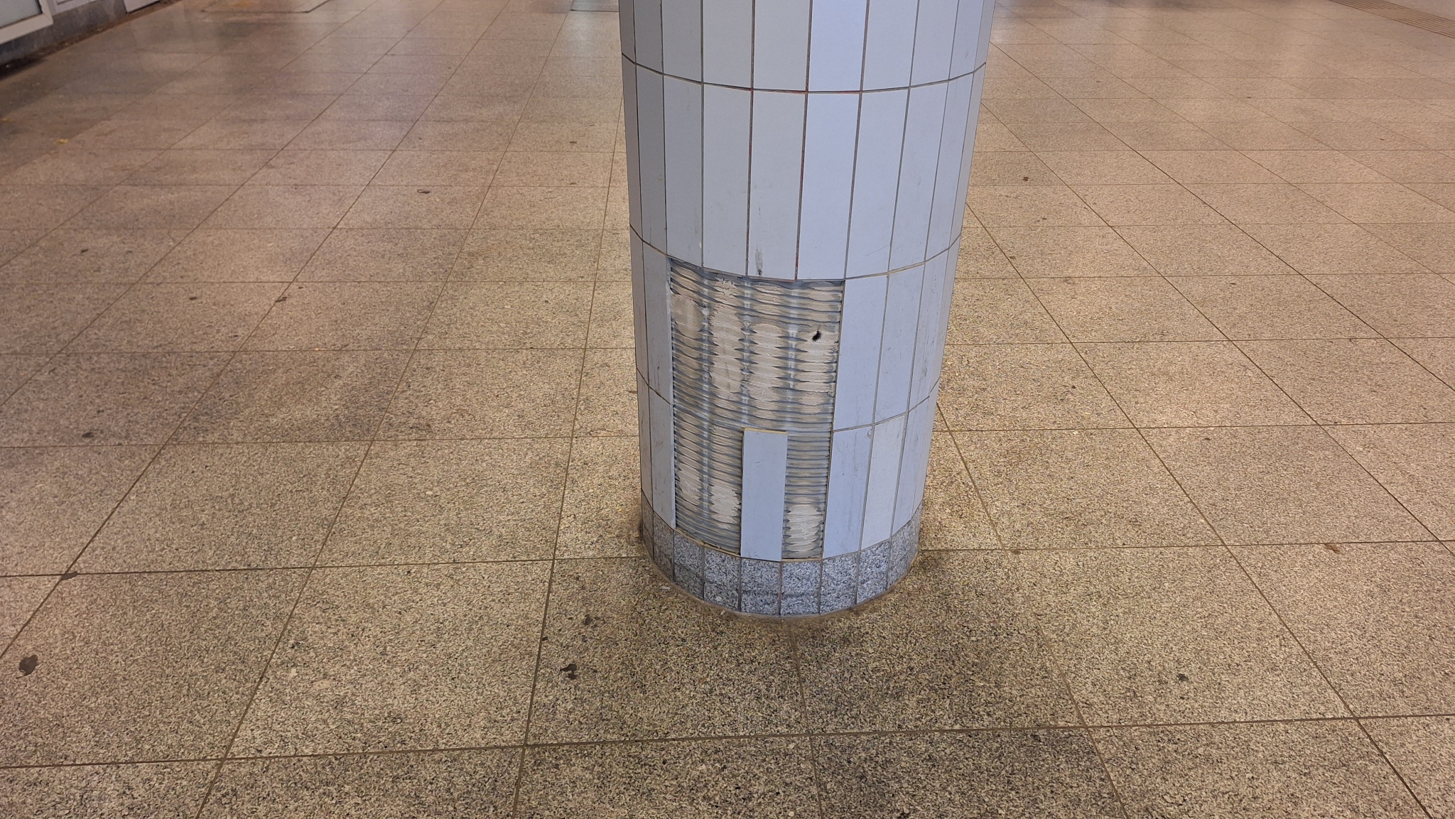 A Keleti aluljáróban a BKK Ügyfélközpontnál lévő egyik oszlopon hiányos a csempeburkolat.