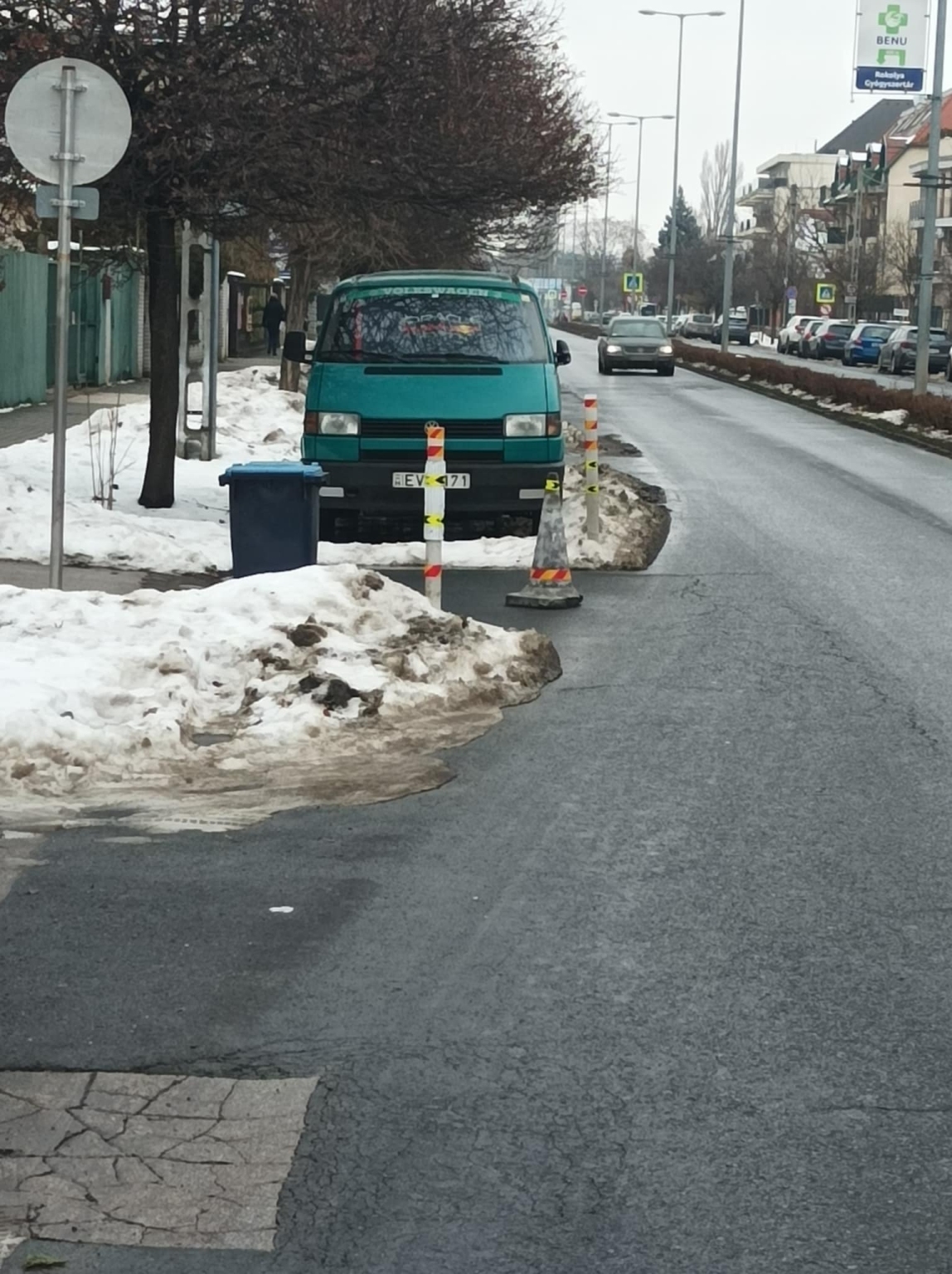 „A nagy hóban is kint vannak a bóják. A kuka állandóan az úttesten, mintha mindennap lenne kommunális hulladékszállítás. Az autókiállóból a hó az úttestre került kilapátolásra a buszmegálló előtt. A képeken látható, hogy emiatt a busz csak egy ívben tudja megközelíteni a megállót.