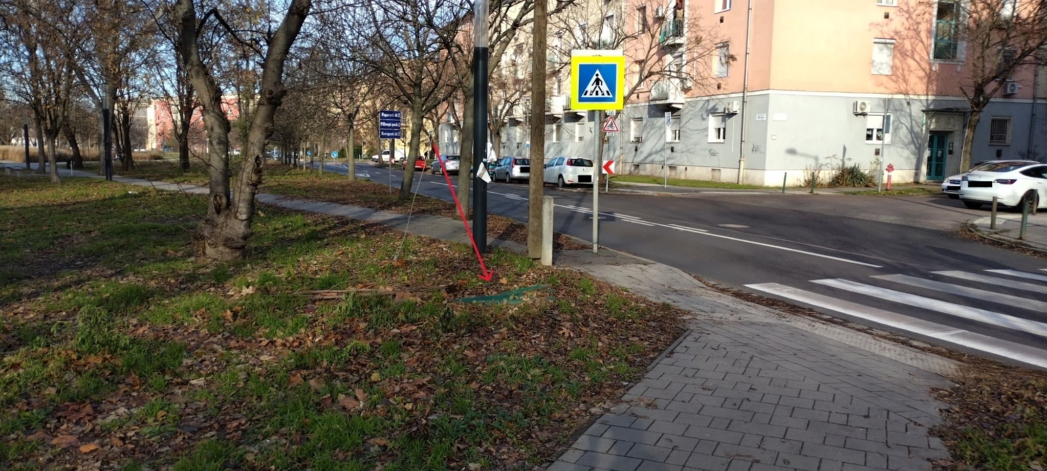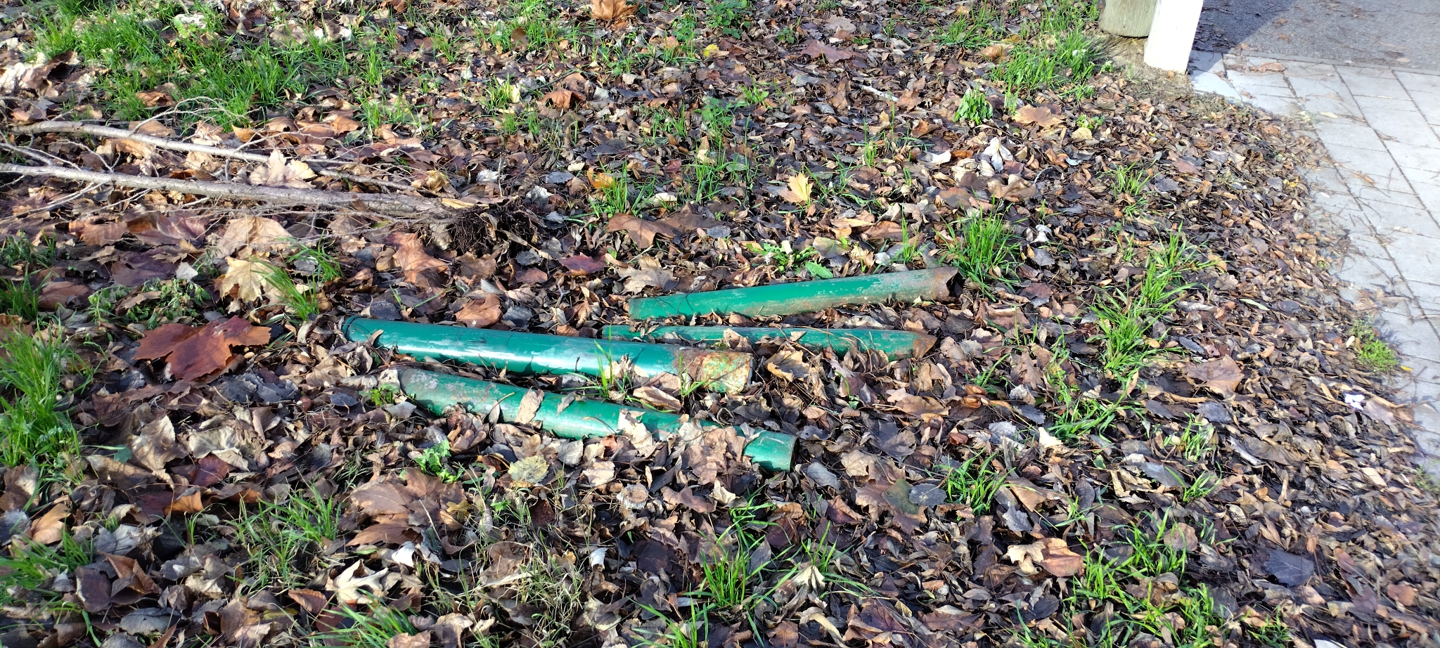 Elhagyott, rozsdásodó pollerek a fűvön, vélhetően a Róna utca felújítása után maradtak ott. Kérem távolítsák el.