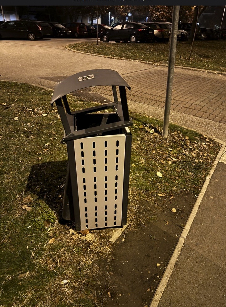 A képen látható új köztéri szemetes láthatóan nincs helyesen összerakva, az oldallemeze is csak nekitámasztva, a teteje sincs lecsukva és még az egész ferdén is áll. Szeretném kérni ennek helyreállítását.