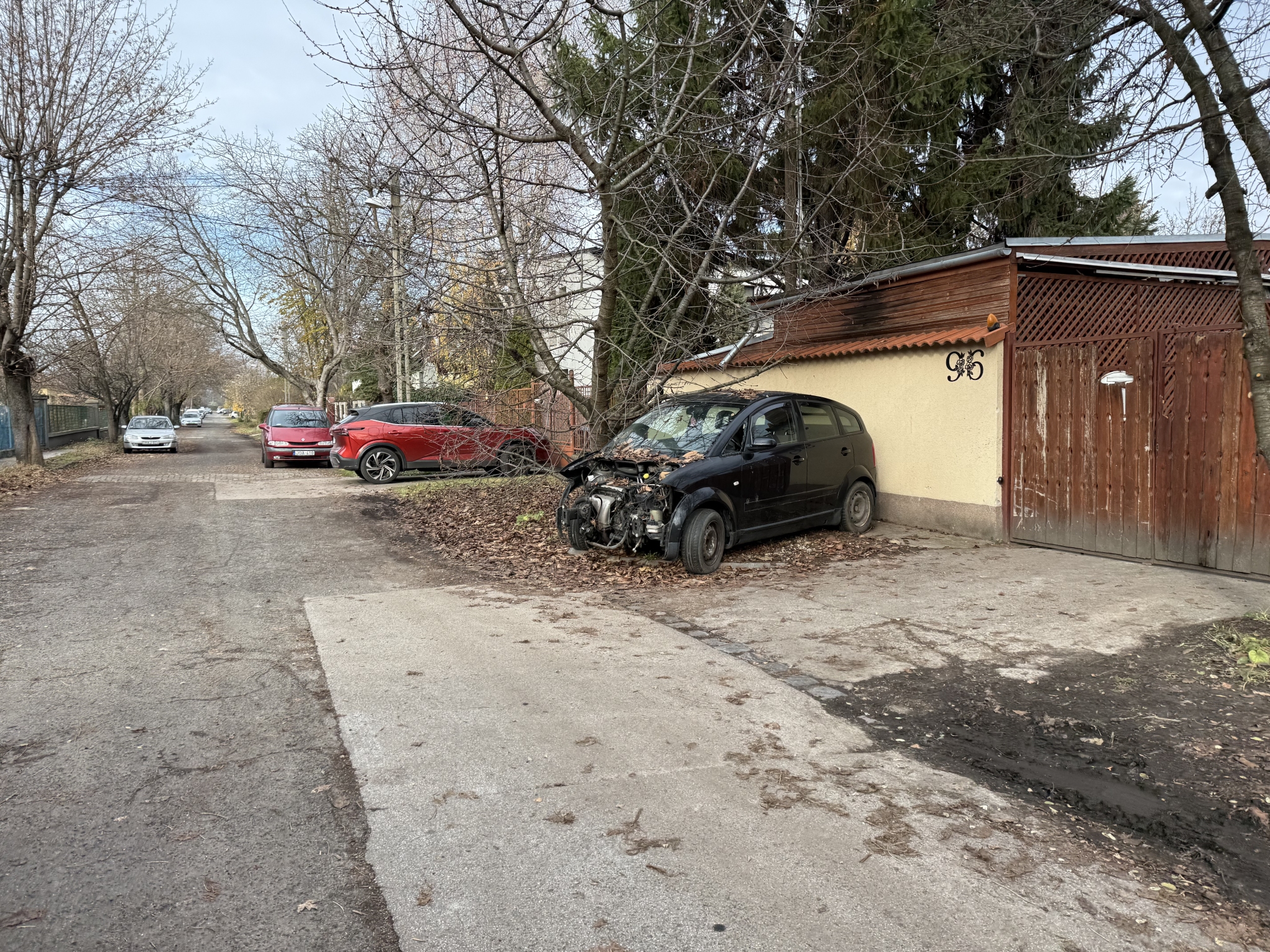 A Kassai utcában kezdi benőni a természet ezt a hiányos kocsit.