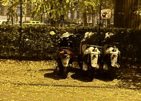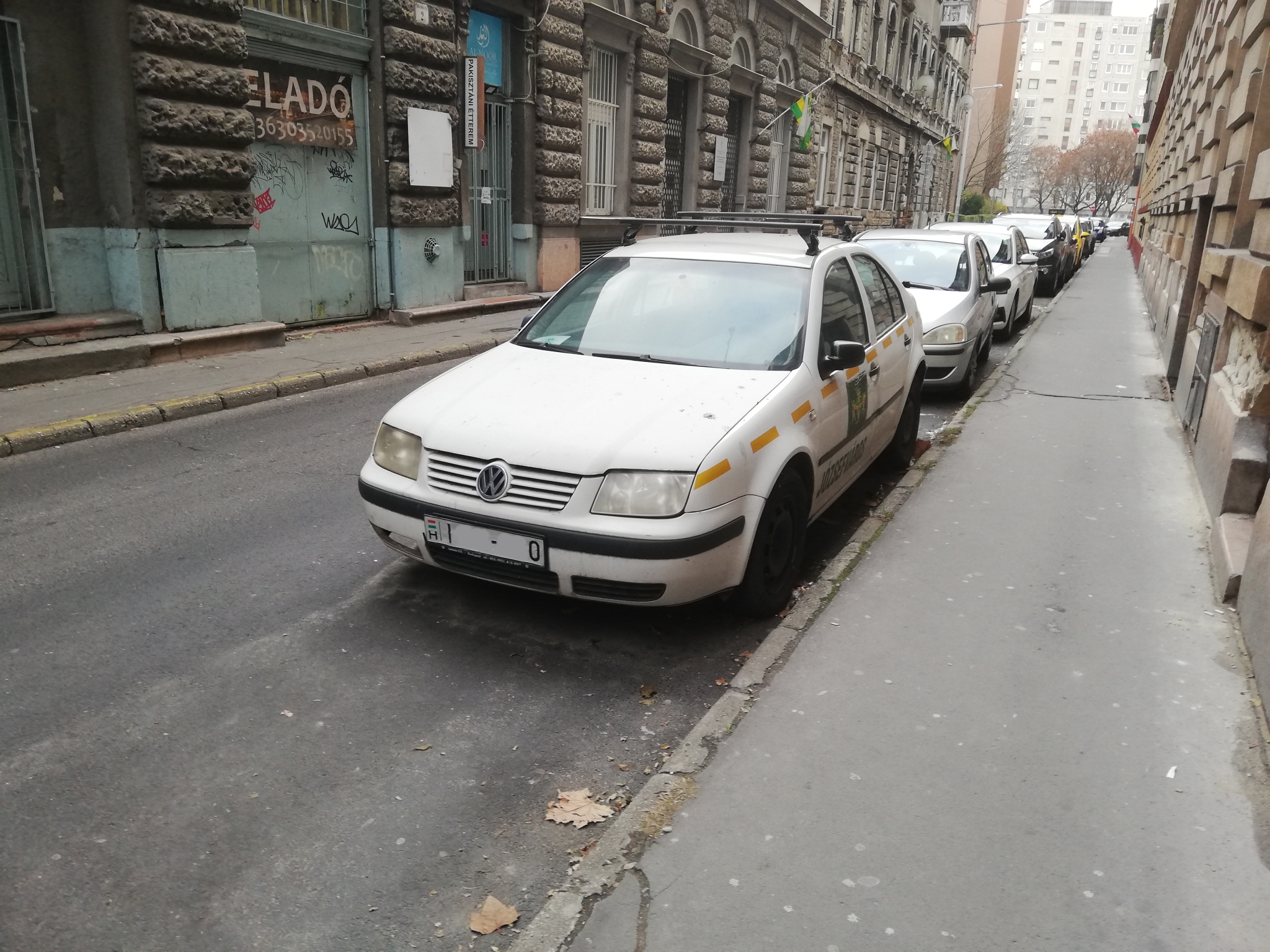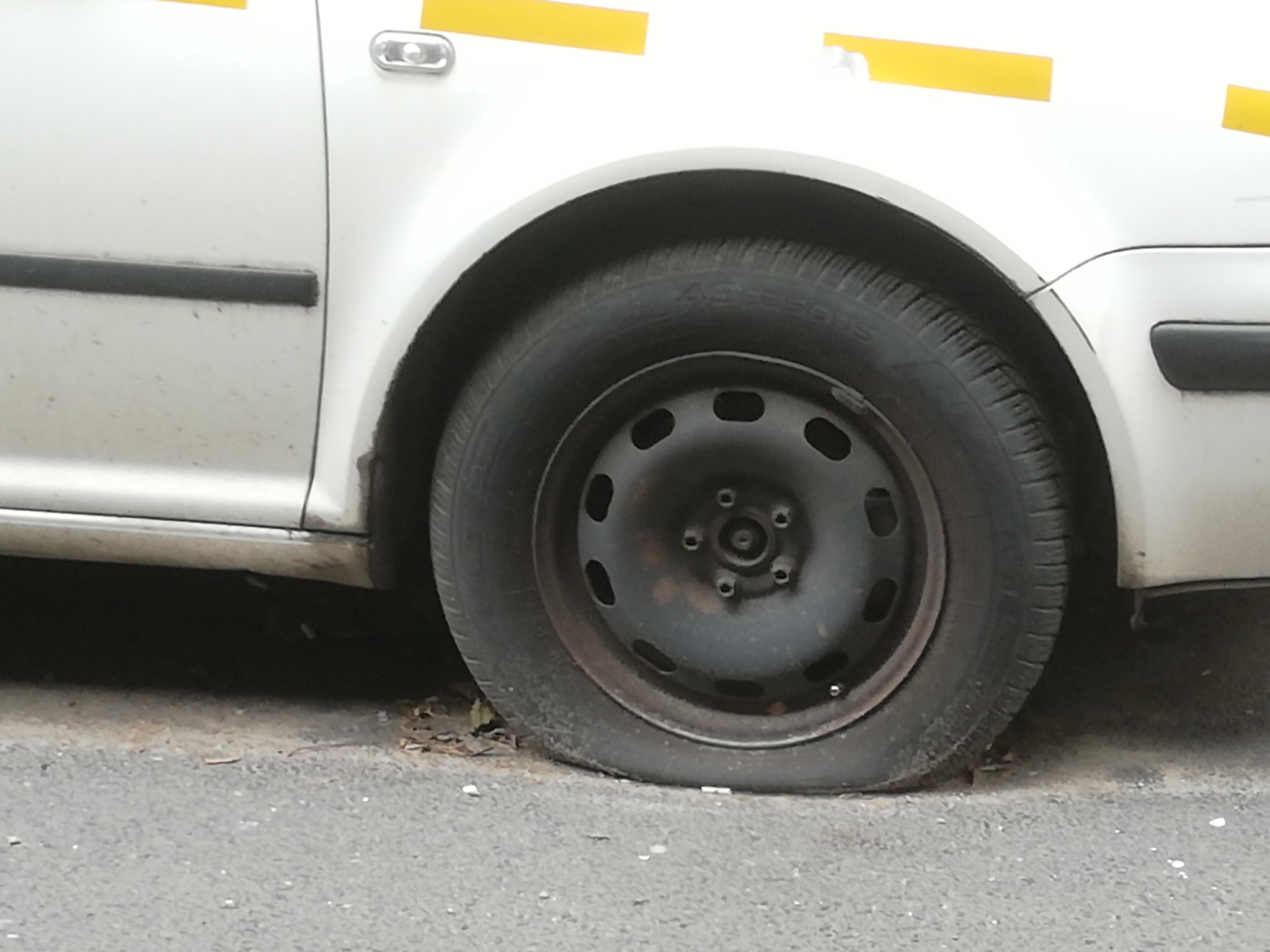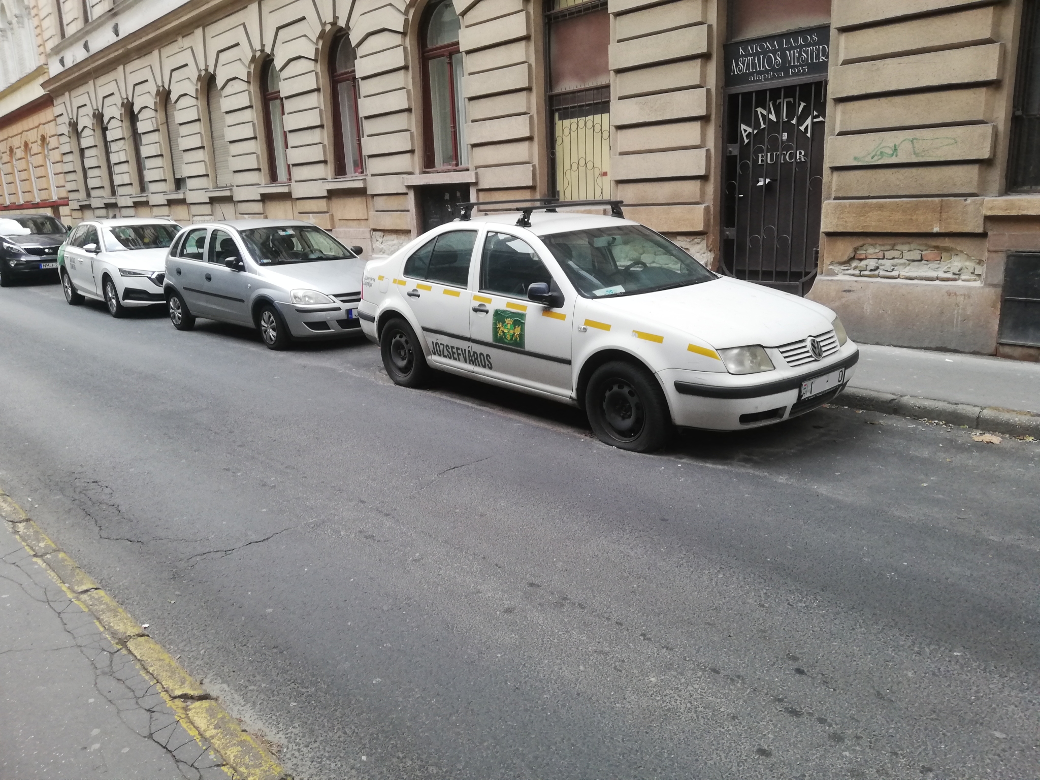 Józsefvárosi közterület felügyelet autója több hete mozdulatlanul, látszólag elhagyatottan áll a Leonardo da Vinci utcában, a jobb első kereke már egészen leeresztett.