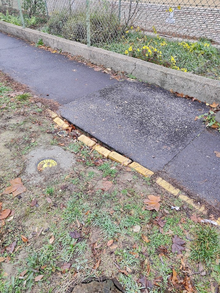 A gázbekötés után néhány hónappal a járdaszegély és környezete megsüllyedt a szakszerűtlen helyreállítás miatt. Balesetveszélyes!