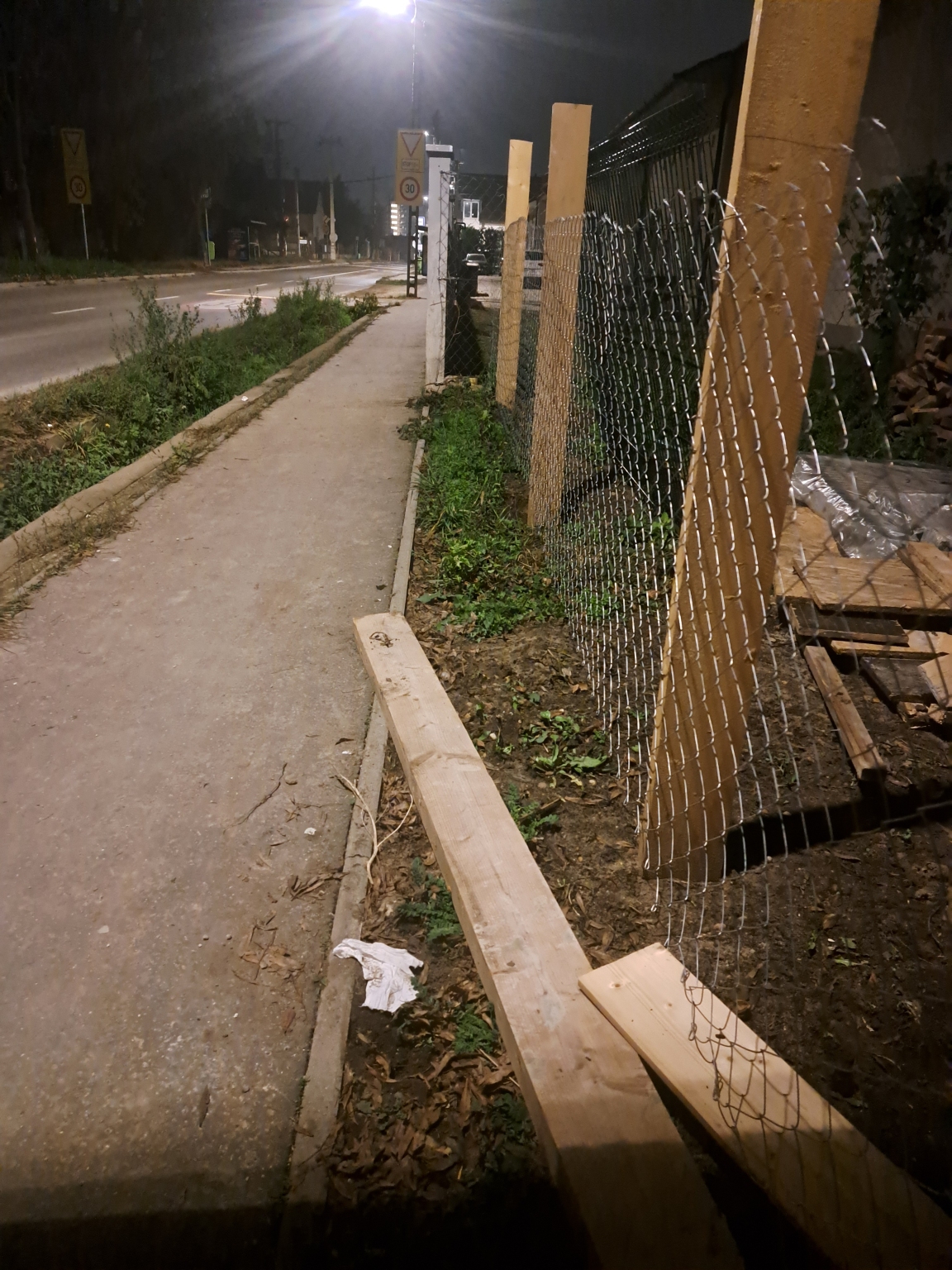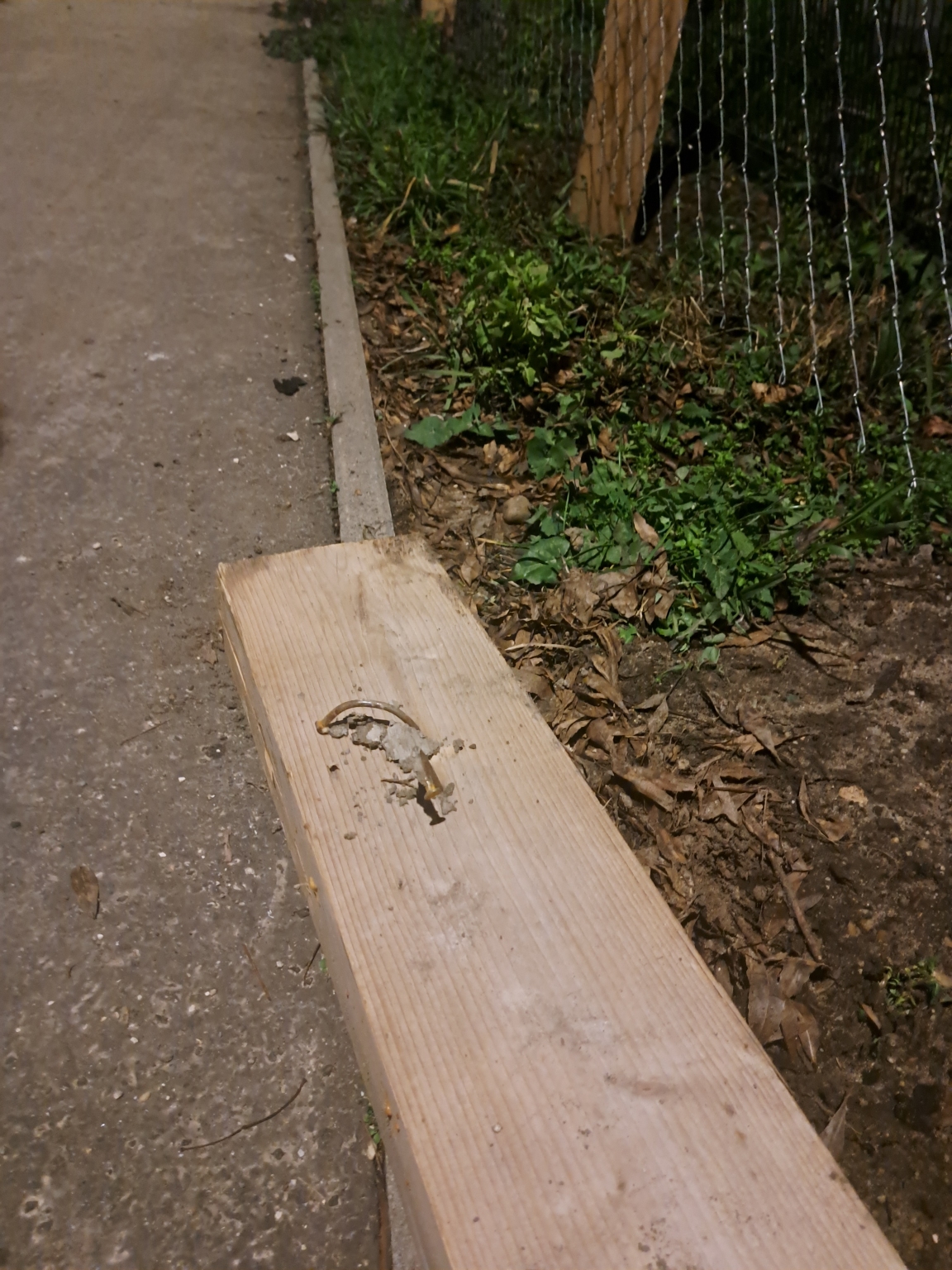 A járdán deszka szögek állnak ki belőle ,ebből is kettő van kívül a járdán.