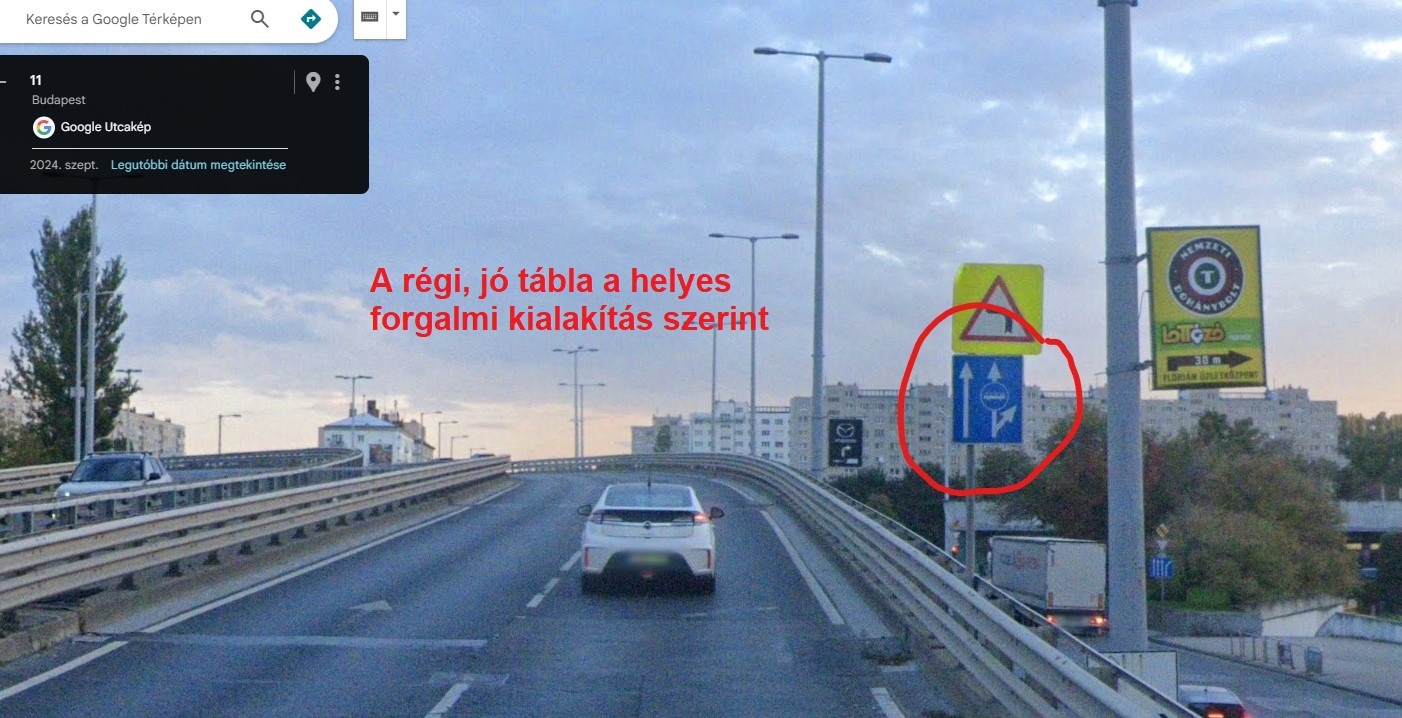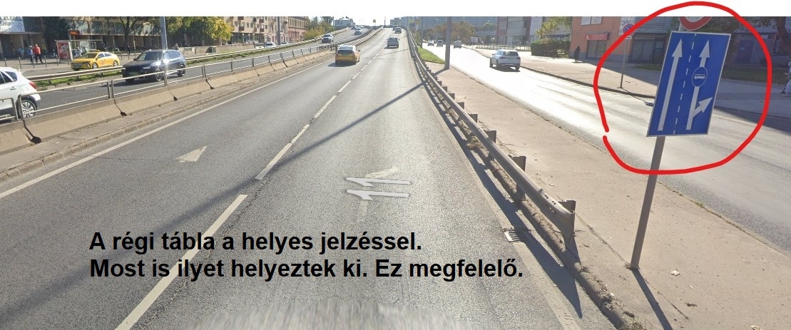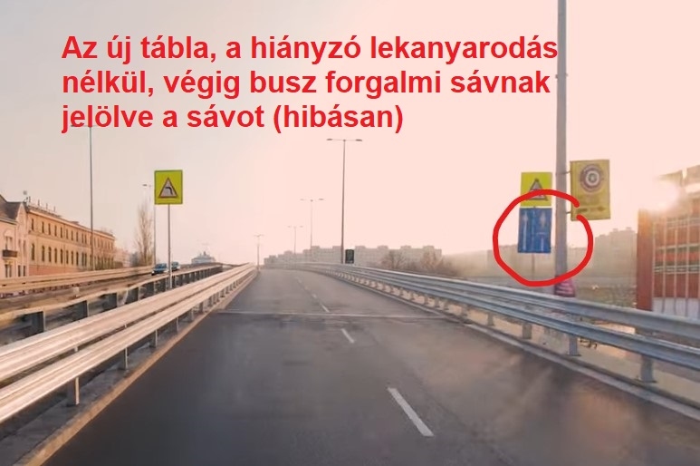 Az Árpád-híd déli felhajtójának felújítása után az egyik forgalmi sávokat jelző táblánál hiba van jelenleg. A felhajtó elején helyesen a korábbi táblát helyezték vissza, de a második táblánál cserélték, de nem jóra. A jelenlegi forgalmi rend szerint ugyanis mindkét sáv normál sáv, csak a Serfőző utcai lehajtó után lesz a jobb oldali sáv autóbusz forgalmi sáv. Ezt jól jelzi a felhajtó elején a tábla (lásd korábbi kép) - ugyanilyet tettek vissza, de mint ahogy a többi képen is látszik a második táblát nem jóra cserélték. Kérjük, hog tegyék szinkronba a táblákat és végezzék el a második tábla cseréjét. Köszönjük!